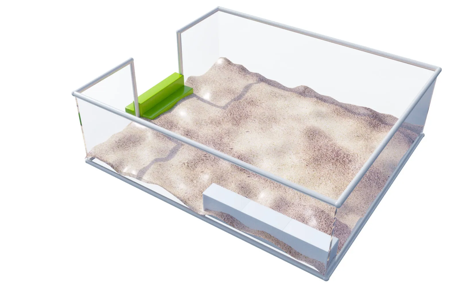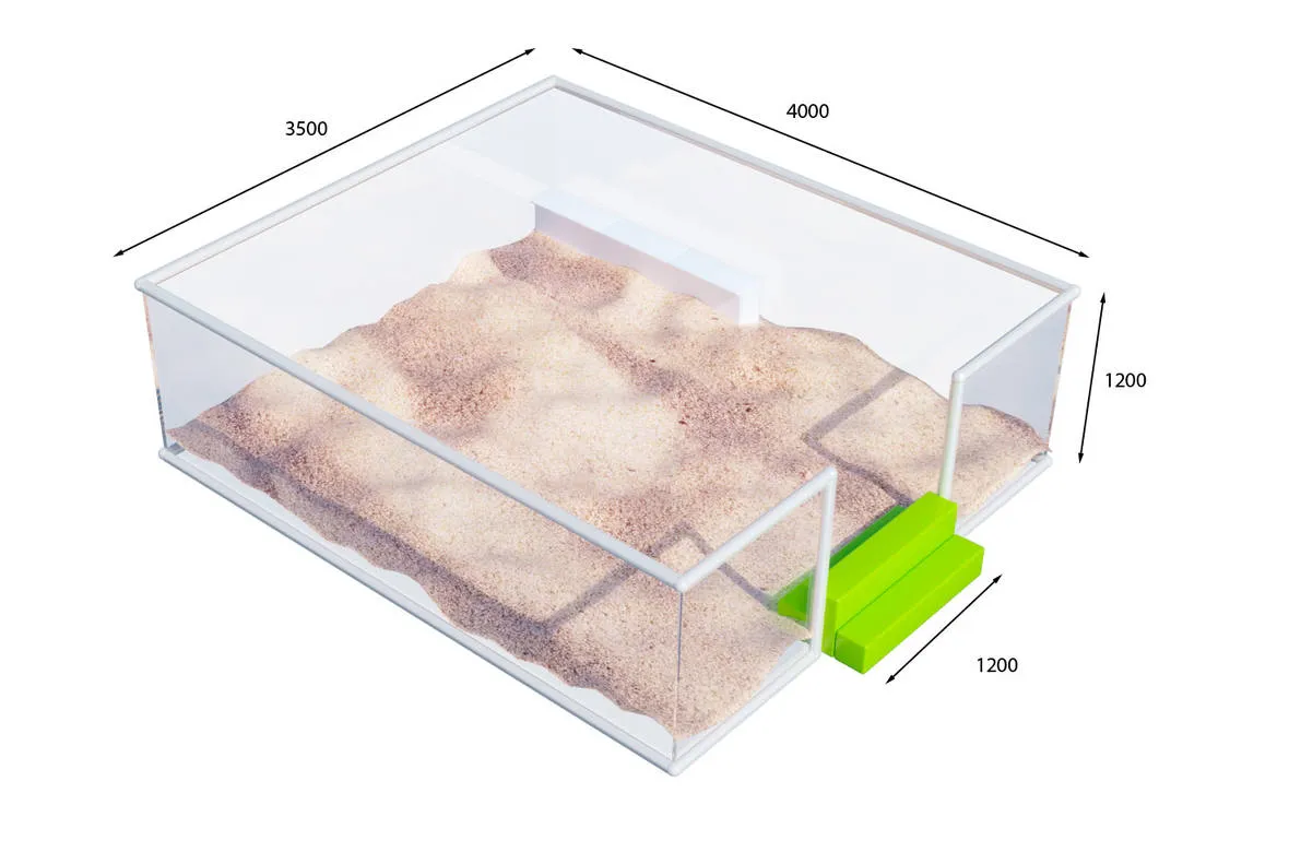Оснащена мягким ограждением, лестницей для удобного входа и лавочками по периметру. Внутри — кварцевый песок (на выбор: классический или цветной).