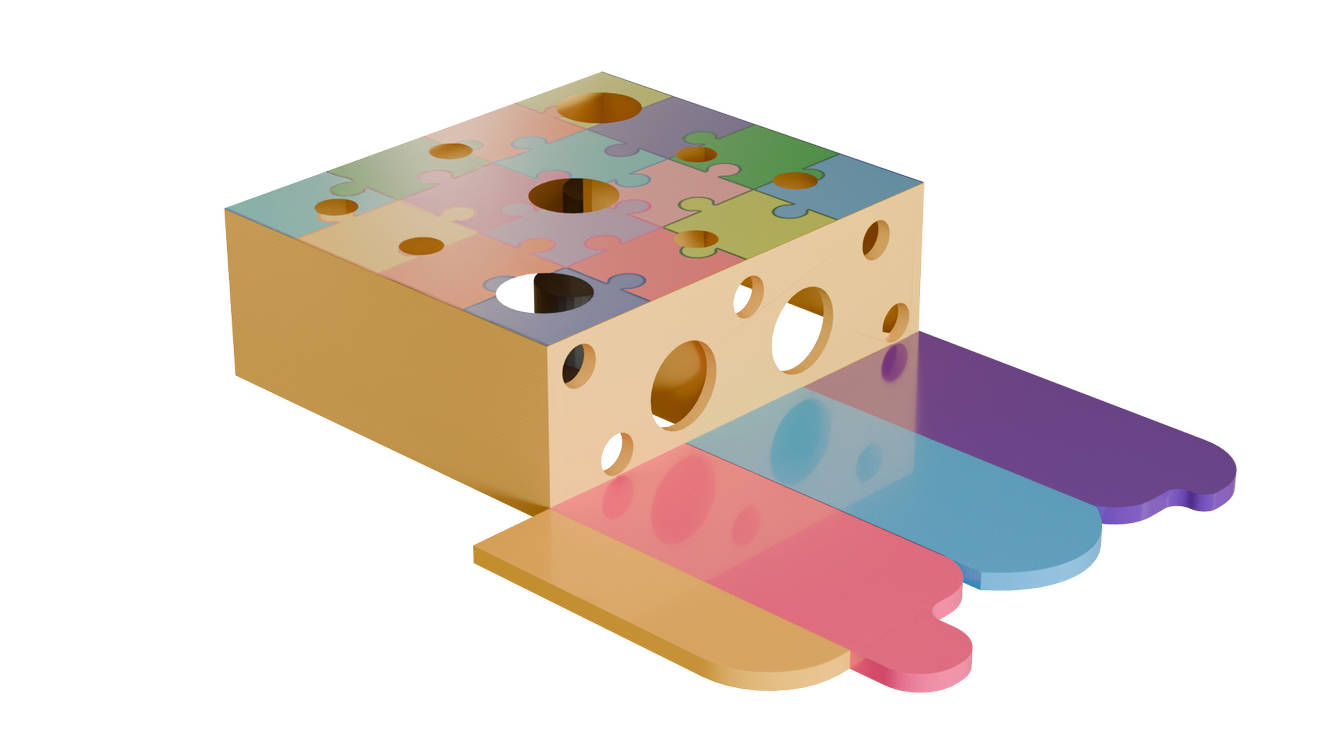 Сырный домик «Фестиваль» — это яркий и радостный лабиринт, оформленный в стиле праздника. Его верх украшен узором из цветных пазлов, а у основания расстилаются дорожки всех оттенков радуги. Такой дизайн создаёт атмосферу веселья и ощущение настоящего праздника, где каждый день превращается в игру.