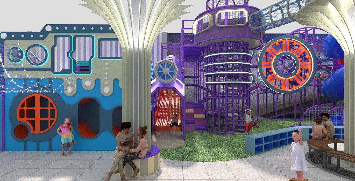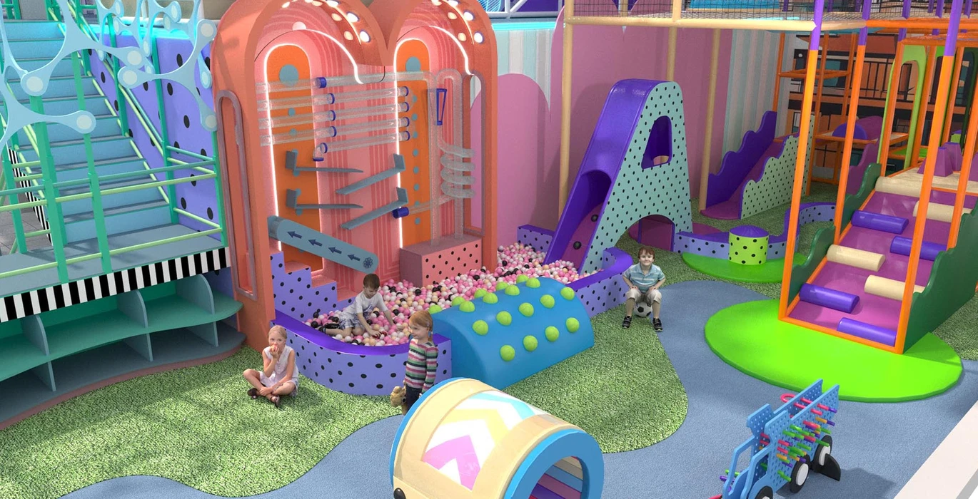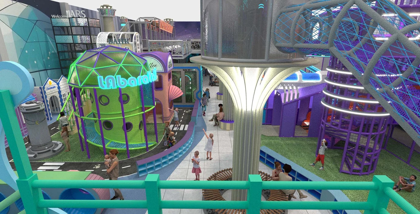 Акцентом служат светодиодная подсветка и динамичные элементы, такие как горки и кольцевые конструкции. Идеально подходит для семейных развлекательных центров, с возможностью адаптации дизайна по желанию заказчика.