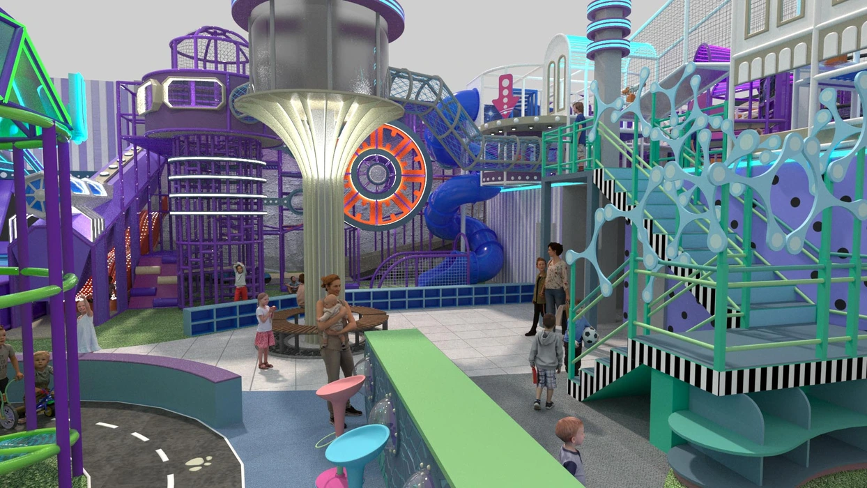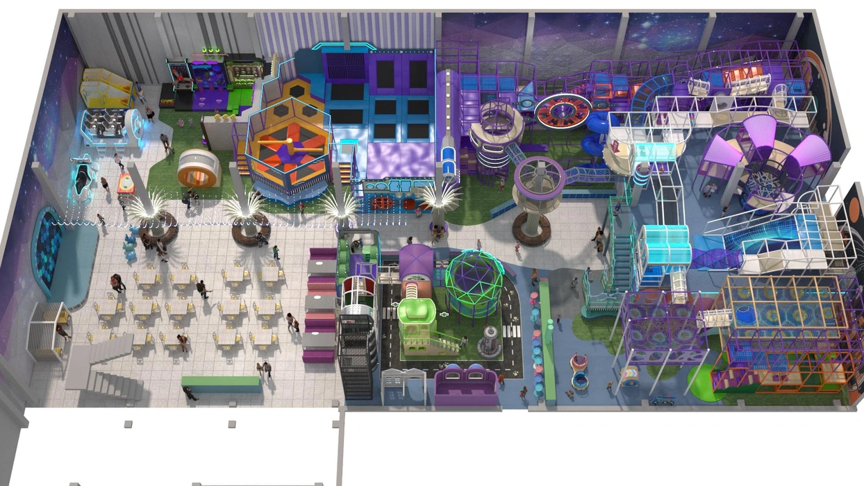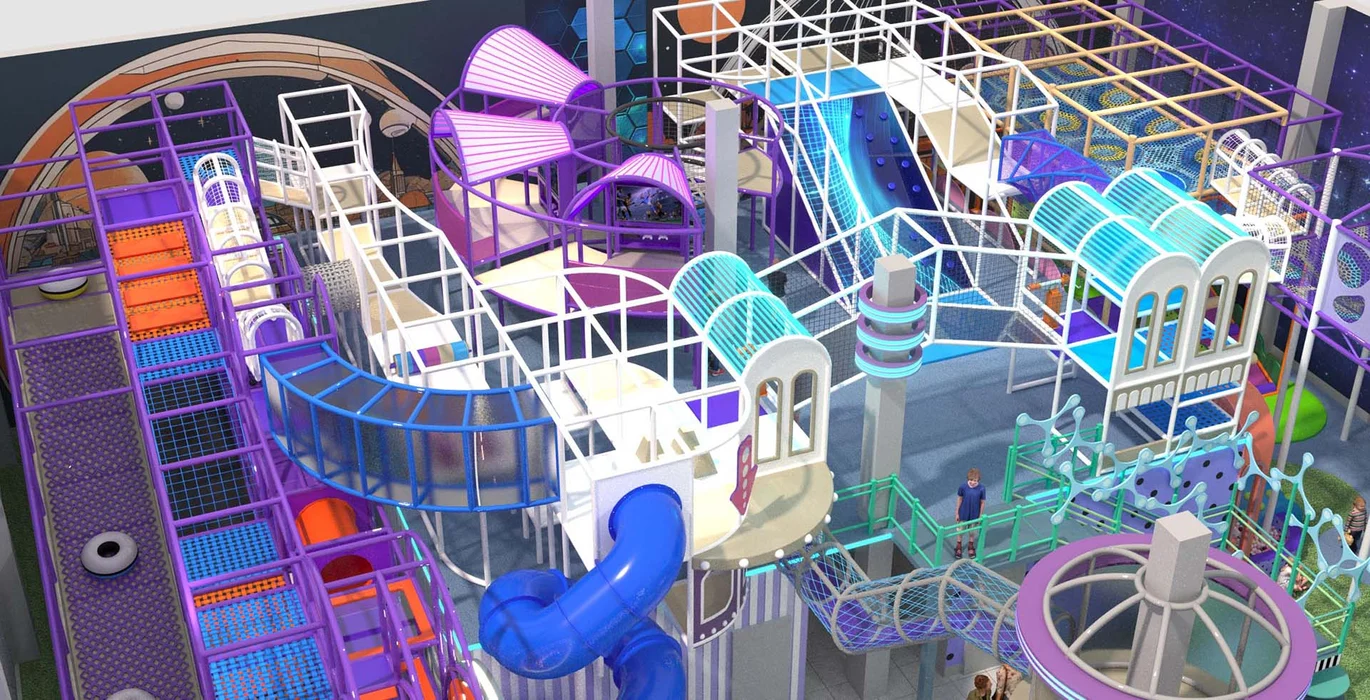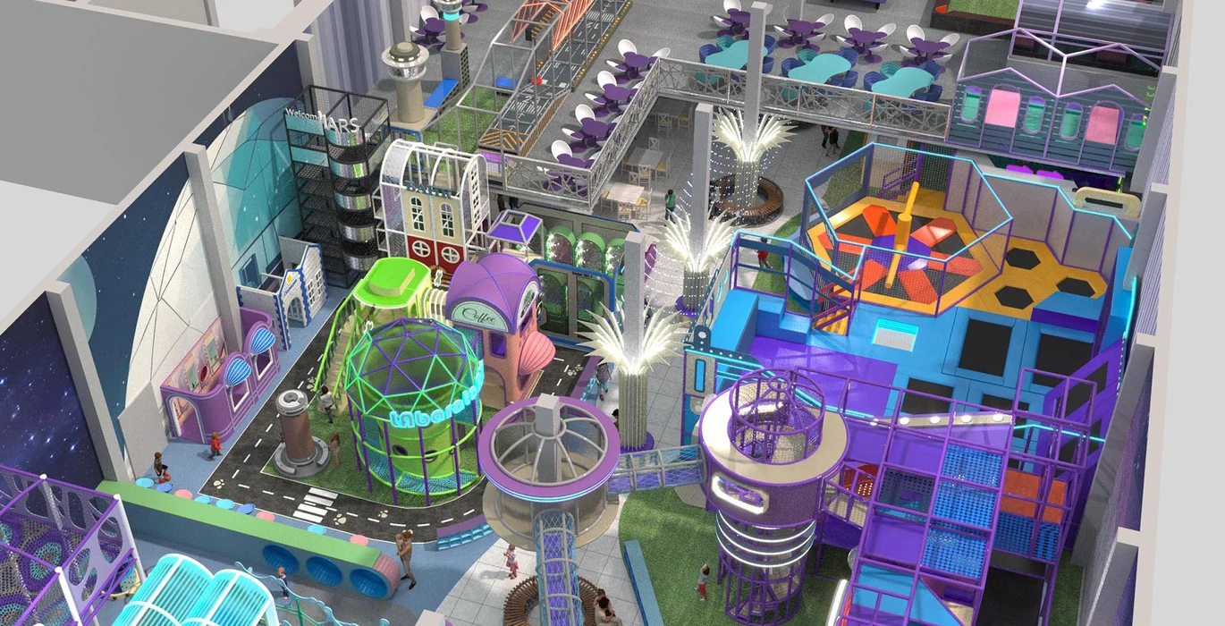Акцентом служат светодиодная подсветка и динамичные элементы, такие как горки и кольцевые конструкции. Идеально подходит для семейных развлекательных центров, с возможностью адаптации дизайна по желанию заказчика.