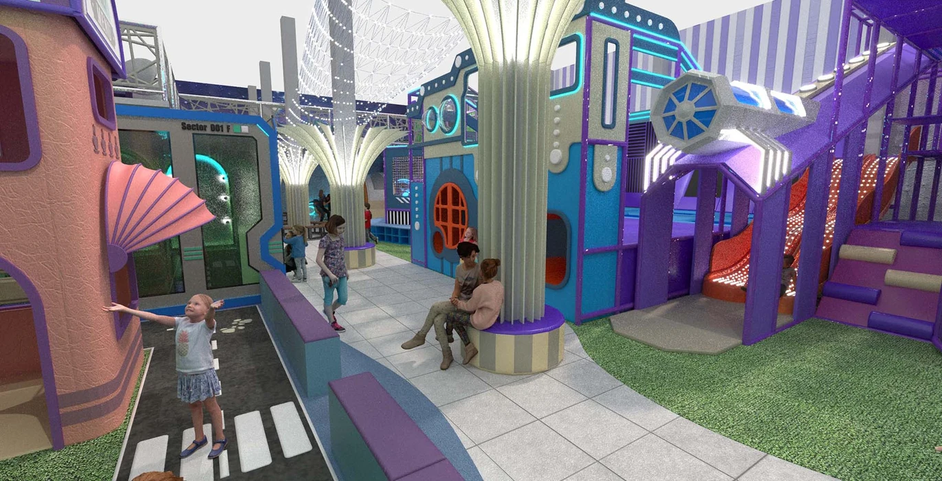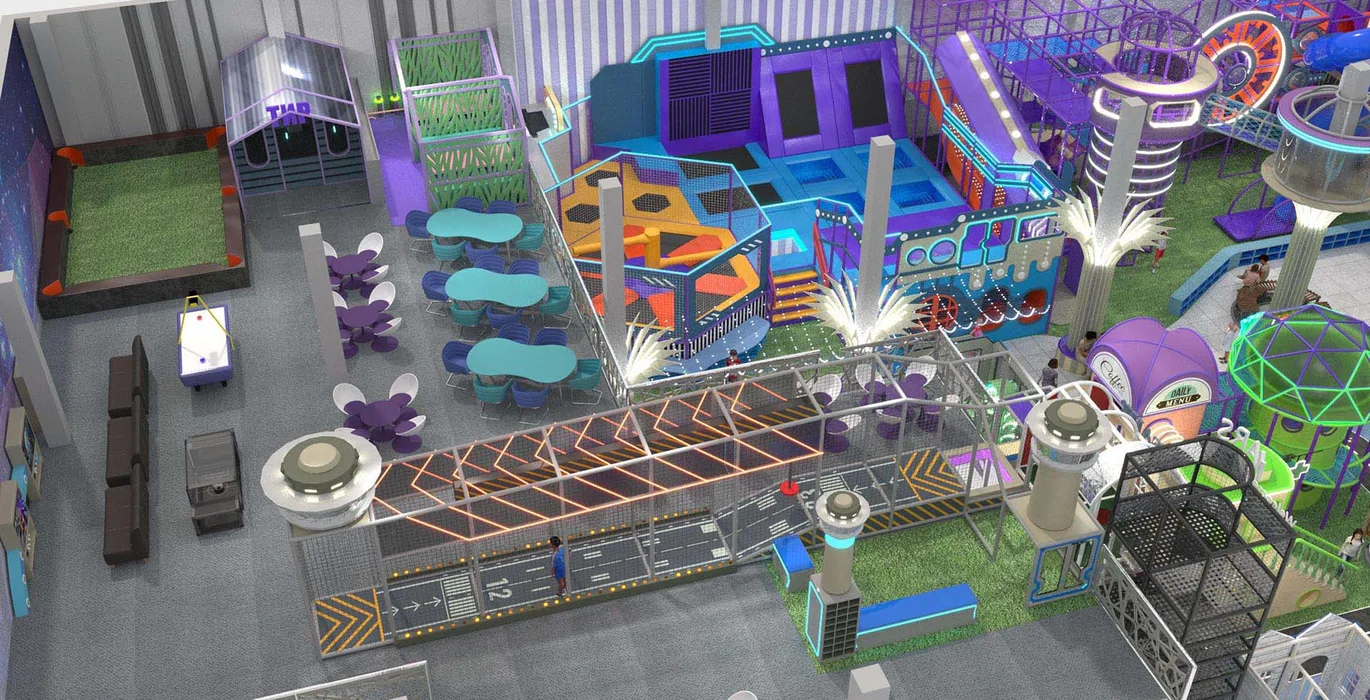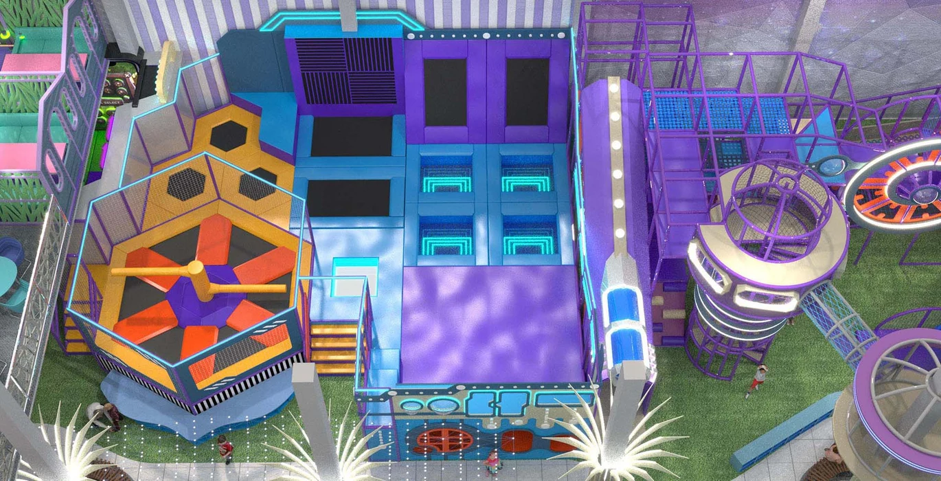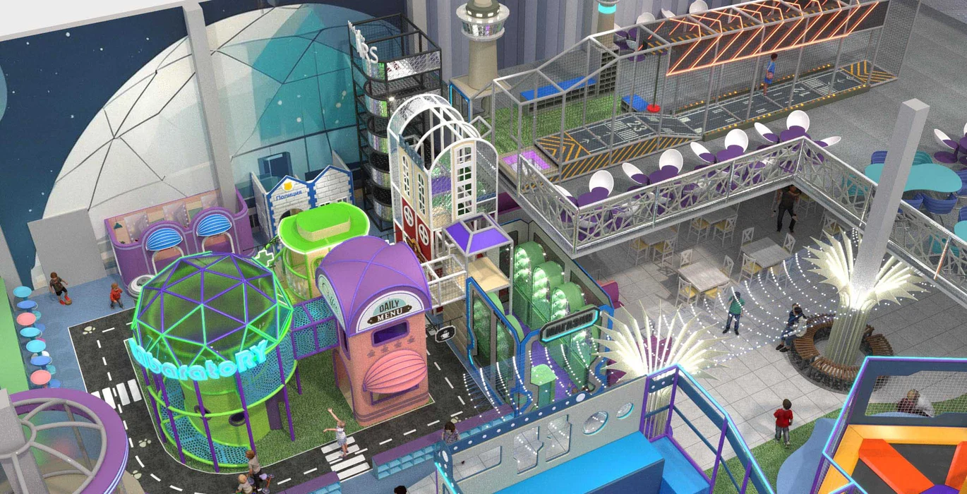 Дизайн этого современного активити-парка выполнен в футуристическом стиле с яркими неоновыми элементами, создающими атмосферу урбанистического приключения.