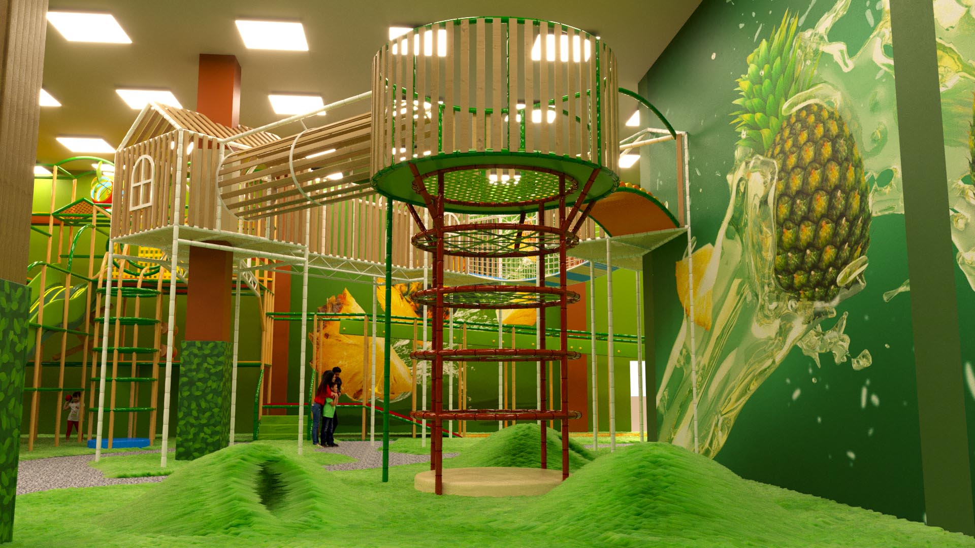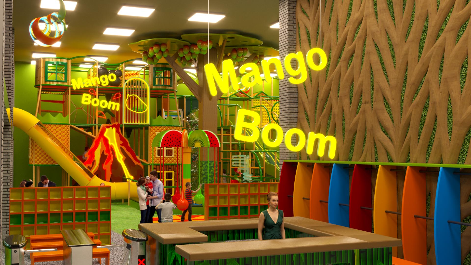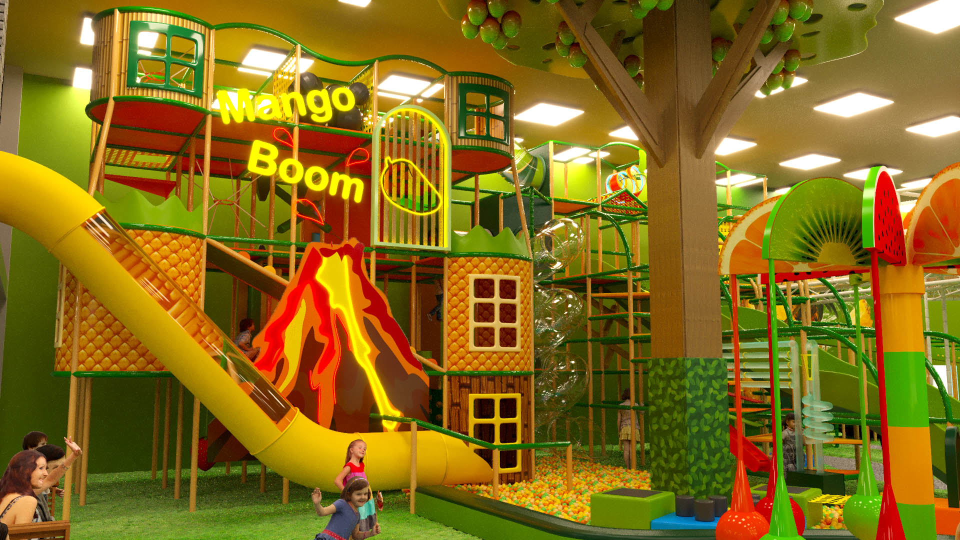 Общая концепция детского игрового центра выполнена в тематике тропического фрукта манго. Элементы декора развлекательного оборудования создают ощущение беззаботного летнего дня и теплых солнечных дней, приносят радостное настроение. В эпоху густонаселенных городов и ускоренного темпа жизни эко-стиль находится на пике популярности. В парке спроектировано несколько стильных локаций в данном направлении: ландшафтные композиции в виде природных зеленых холмов – это один из приёмов дизайна, позволяющий внести разнообразие во внешний вид парка; холмы достаточно функциональны – на них можно взбираться и проползать по туннелю; эко-домики в естественной расцветке с разнообразными переходами; зона релакса с креслами-качалками и лавочками. Для парка было изготовлено много декора и подвесных конструкций с подсветкой, а также центральная колонна выполнена в виде дерева. Наши дизайнеры максимально эффективно использовали каждый кв м центра. Мы спроектировали уникальную конструкцию игрового комплекса в эко-стиле на высоте 6 м. Благодаря такому подходу удалось освободить достаточно места для посетителей, избежав переполненности и толкучки в парке. Также в проекте задействована центральная колонна помещения. Главная особенность проекта - 5 видов мостов-переходов высоте, соединяющих локации в форме уютных эко домиков: перекидной мост с поручнями, подвесной мост, сетчатый переход, переход-труба, мягкий мост.