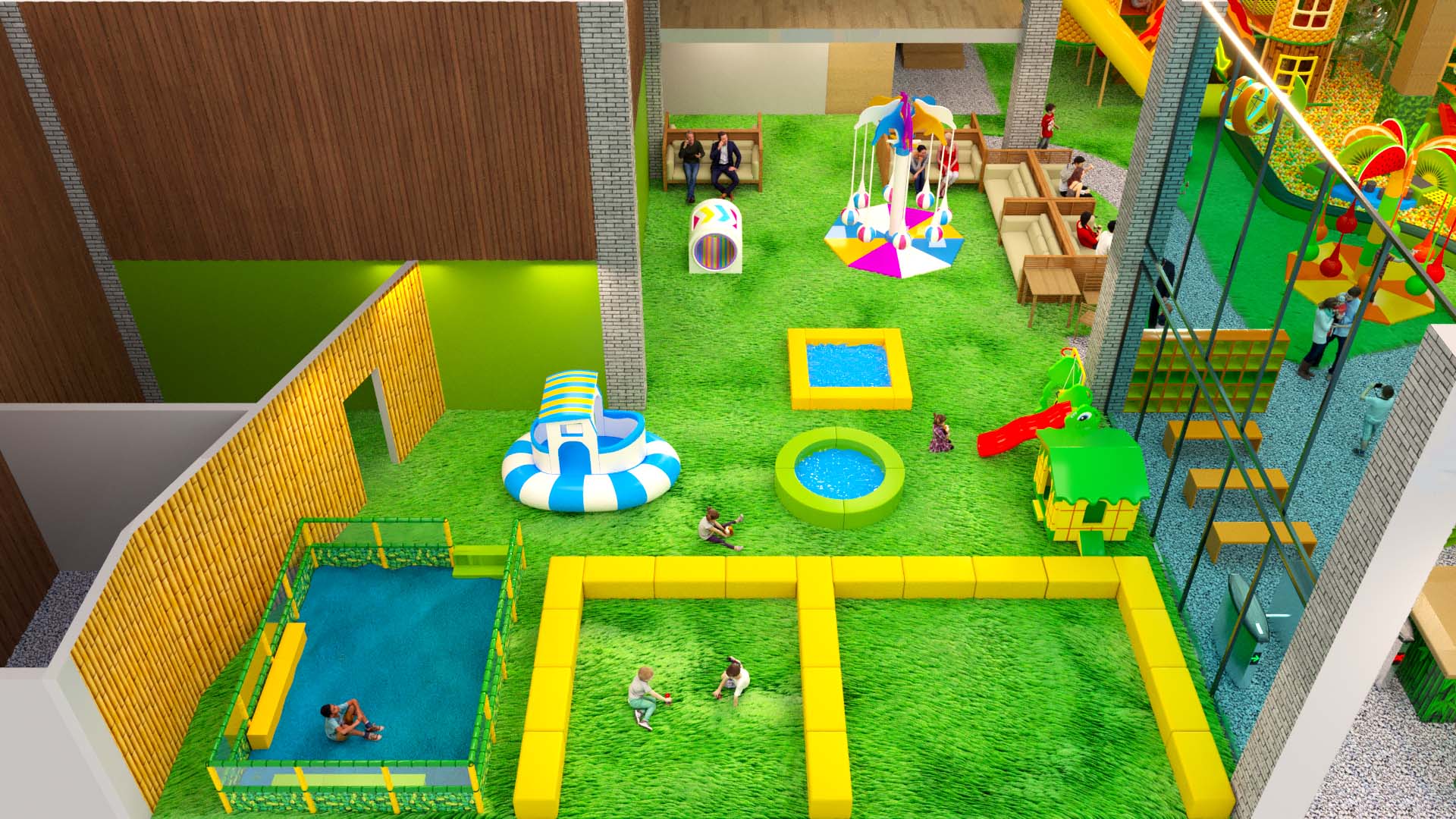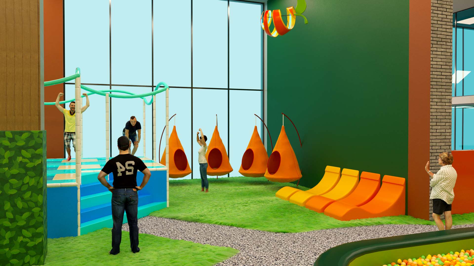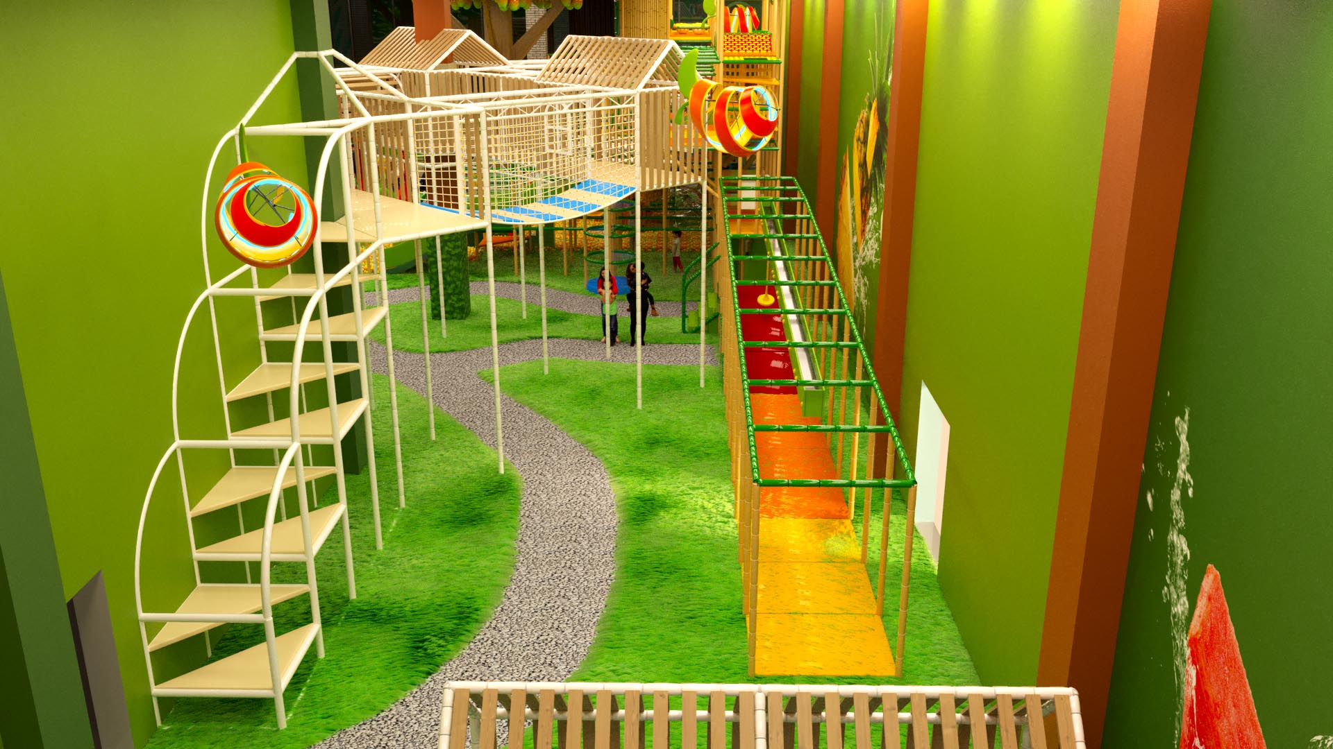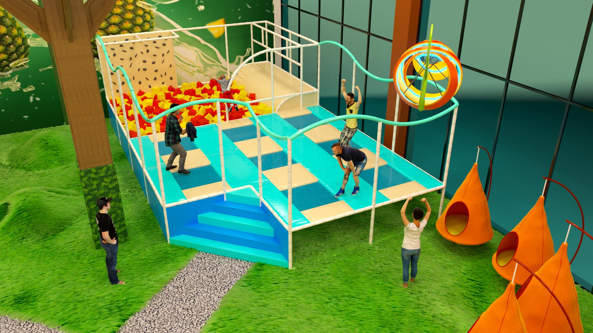 Общая концепция детского игрового центра выполнена в тематике тропического фрукта манго. Элементы декора развлекательного оборудования создают ощущение беззаботного летнего дня и теплых солнечных дней, приносят радостное настроение. В эпоху густонаселенных городов и ускоренного темпа жизни эко-стиль находится на пике популярности. В парке спроектировано несколько стильных локаций в данном направлении: ландшафтные композиции в виде природных зеленых холмов – это один из приёмов дизайна, позволяющий внести разнообразие во внешний вид парка; холмы достаточно функциональны – на них можно взбираться и проползать по туннелю; эко-домики в естественной расцветке с разнообразными переходами; зона релакса с креслами-качалками и лавочками. Для парка было изготовлено много декора и подвесных конструкций с подсветкой, а также центральная колонна выполнена в виде дерева. Наши дизайнеры максимально эффективно использовали каждый кв м центра. Мы спроектировали уникальную конструкцию игрового комплекса в эко-стиле на высоте 6 м. Благодаря такому подходу удалось освободить достаточно места для посетителей, избежав переполненности и толкучки в парке. Также в проекте задействована центральная колонна помещения. Главная особенность проекта - 5 видов мостов-переходов высоте, соединяющих локации в форме уютных эко домиков: перекидной мост с поручнями, подвесной мост, сетчатый переход, переход-труба, мягкий мост.