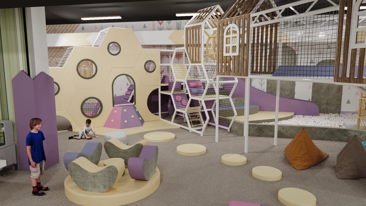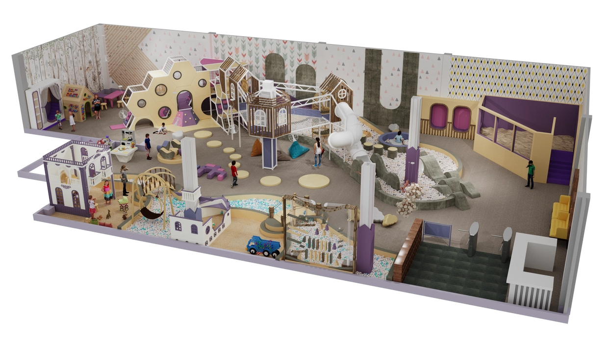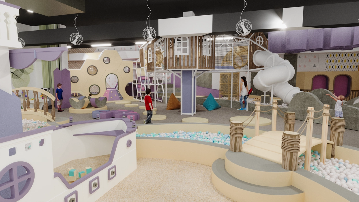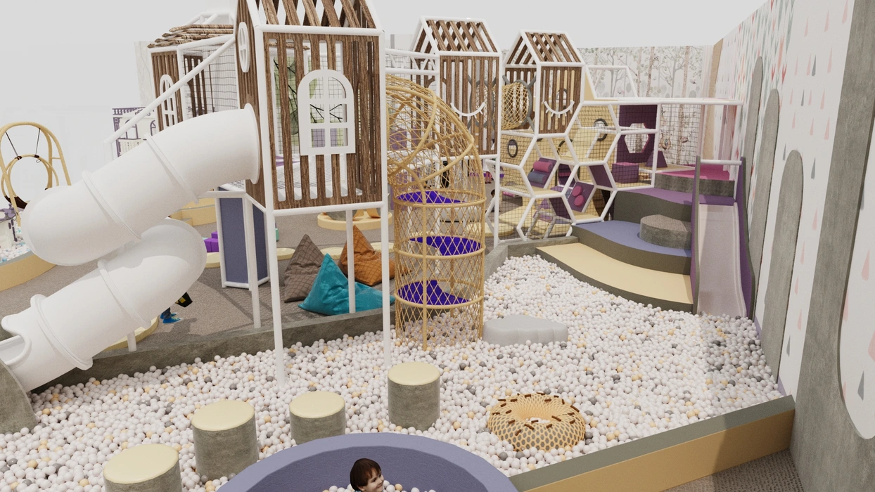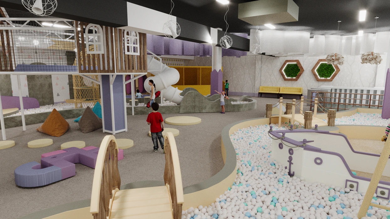 Дизайн этого очаровательного активити-парка выполнен в мягкой цветовой гамме с элементами прованского стиля, где отсутствуют кричащие цвета, создавая уютную и сказочную атмосферу. Акцентом служат стилизованные элементы декора и уютная подсветка, подчеркивающая уникальный дизайн.