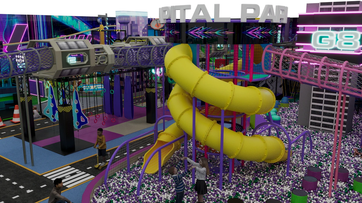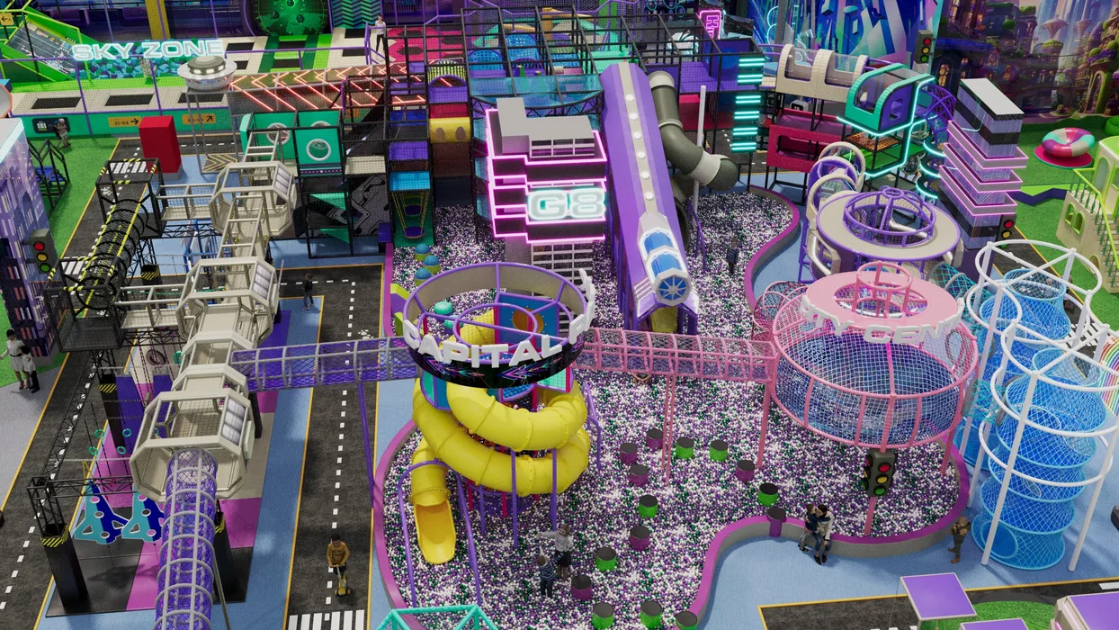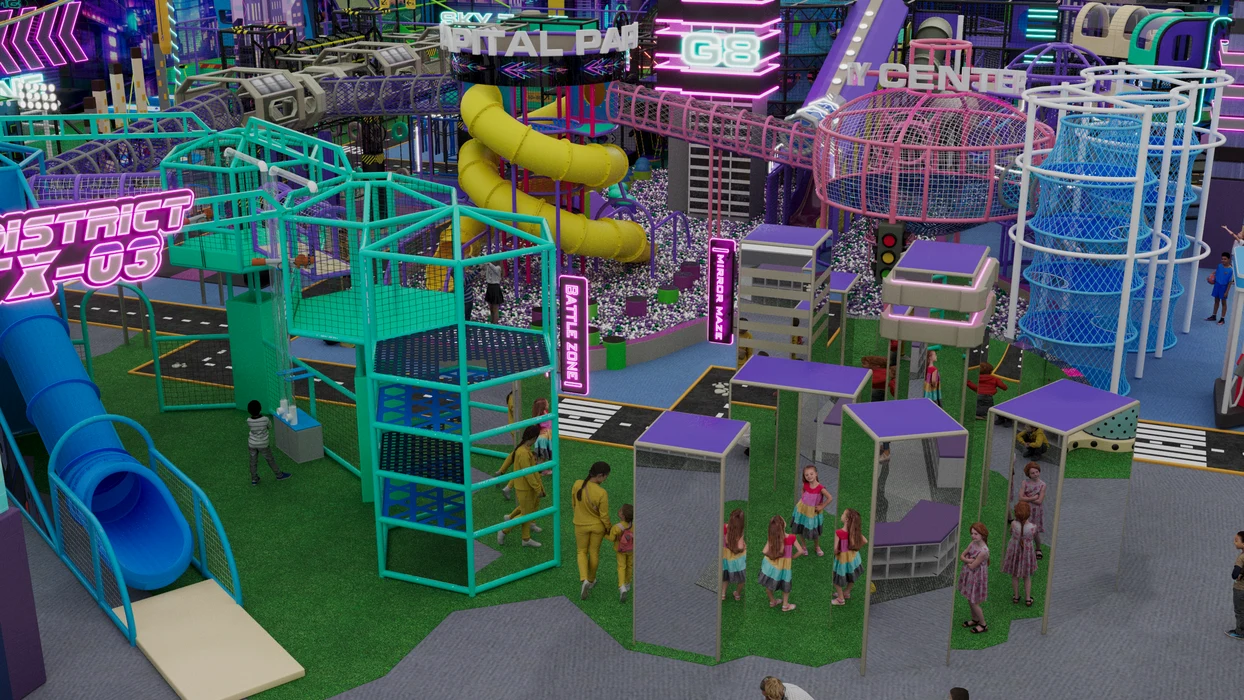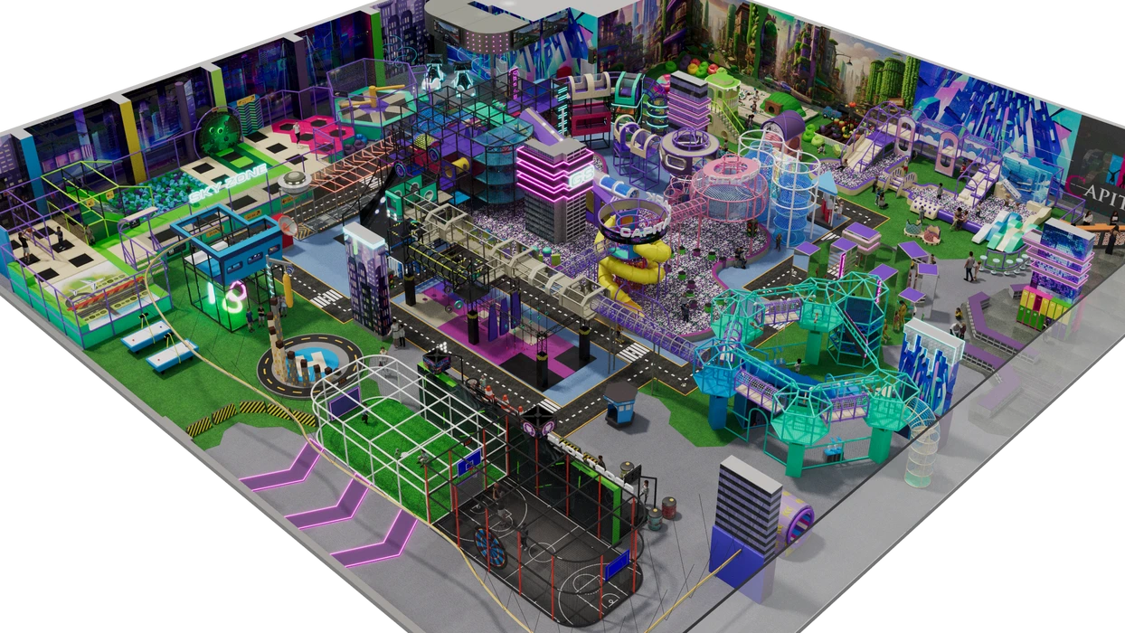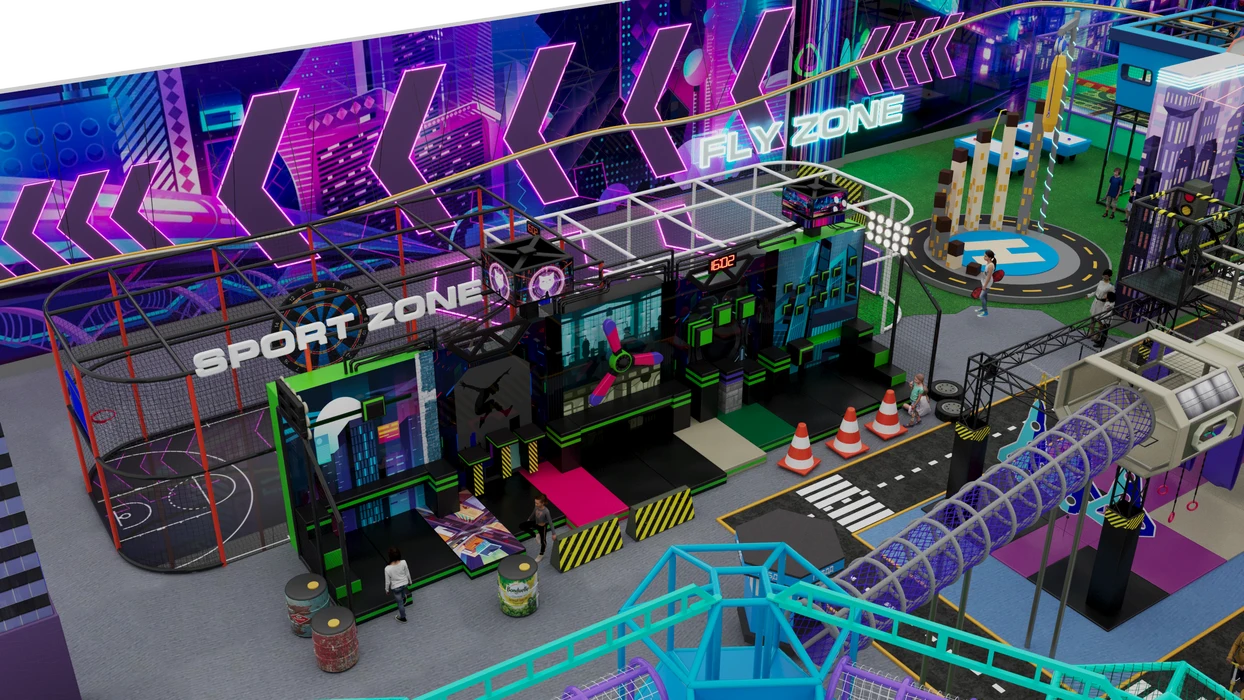 Дизайн этого современного активити-парка выполнен в футуристическом стиле с яркими неоновыми элементами, создающими атмосферу урбанистического приключения.