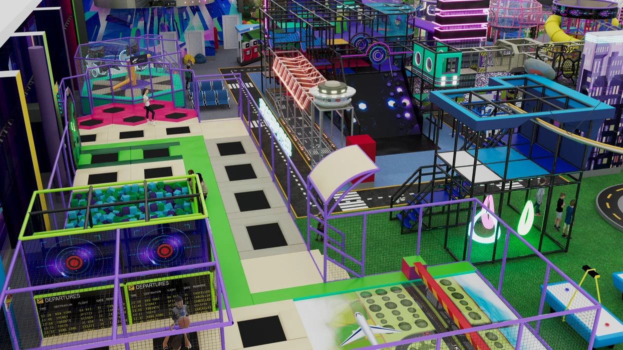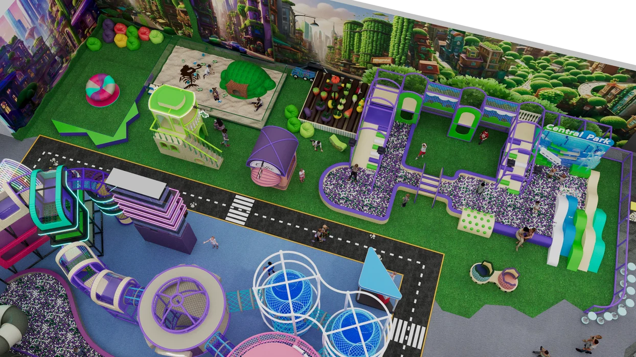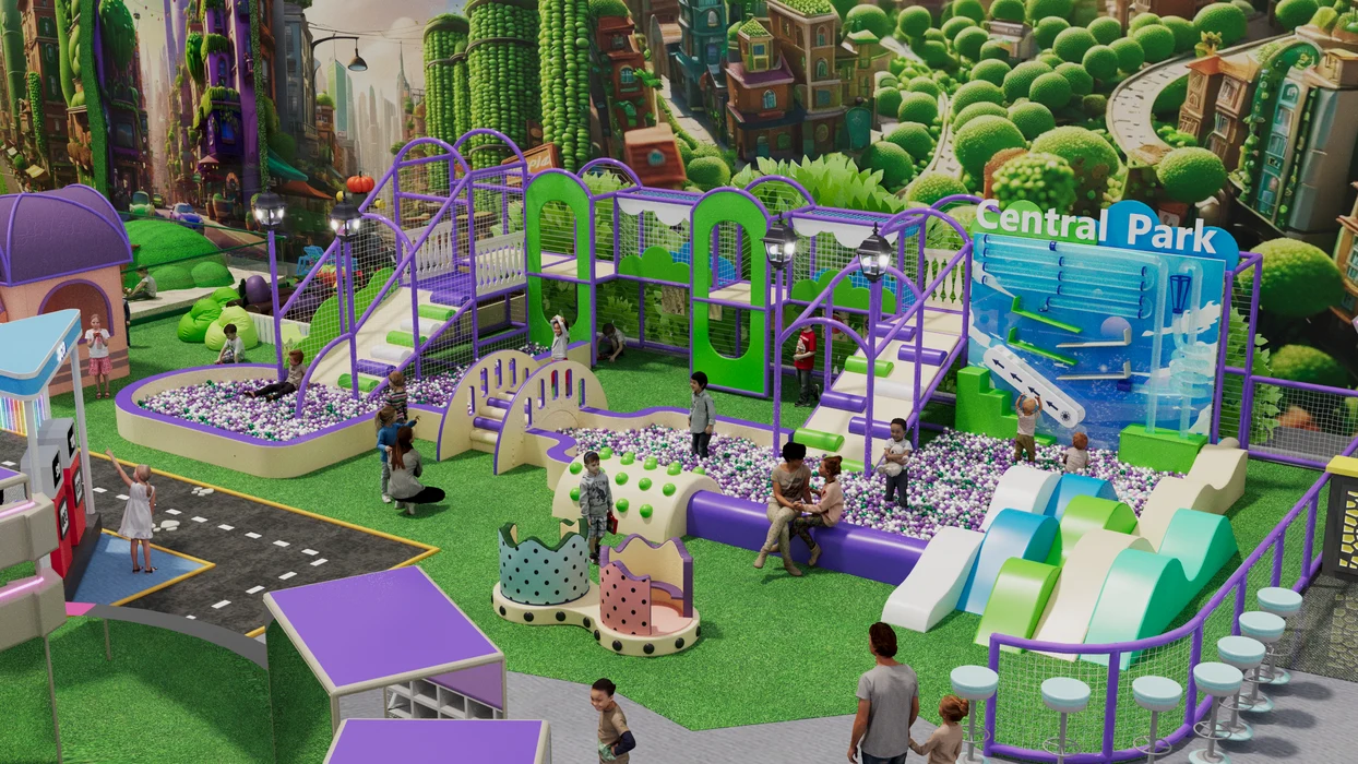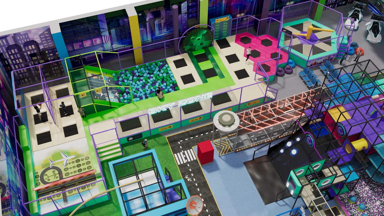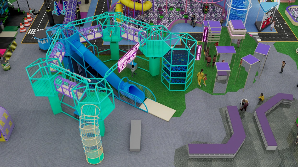 Дизайн этого современного активити-парка выполнен в футуристическом стиле с яркими неоновыми элементами, создающими атмосферу урбанистического приключения.