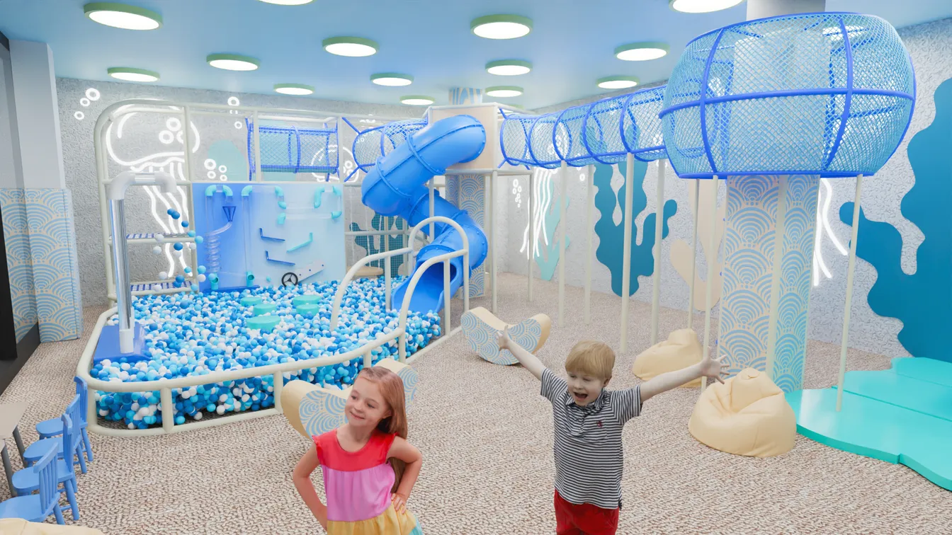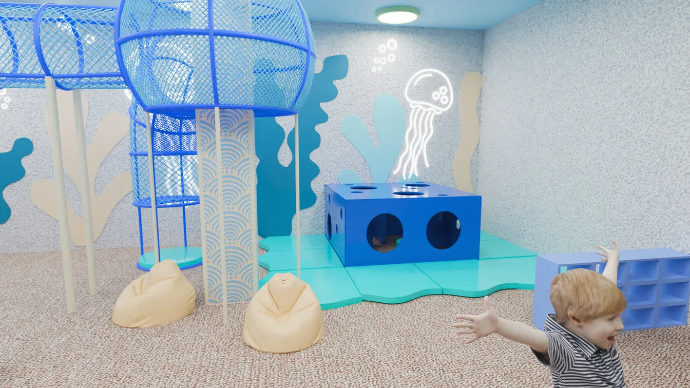 Детская игровая комната «Атлантида» — это тематическое игровое пространство, вдохновлённое загадочным подводным миром. Интерьер оформлен в голубых и бирюзовых оттенках, а стены украшены графикой медуз, пузырьков и морских водорослей. Такое оформление создаёт атмосферу настоящего подводного приключения, где дети могут почувствовать себя исследователями океана.