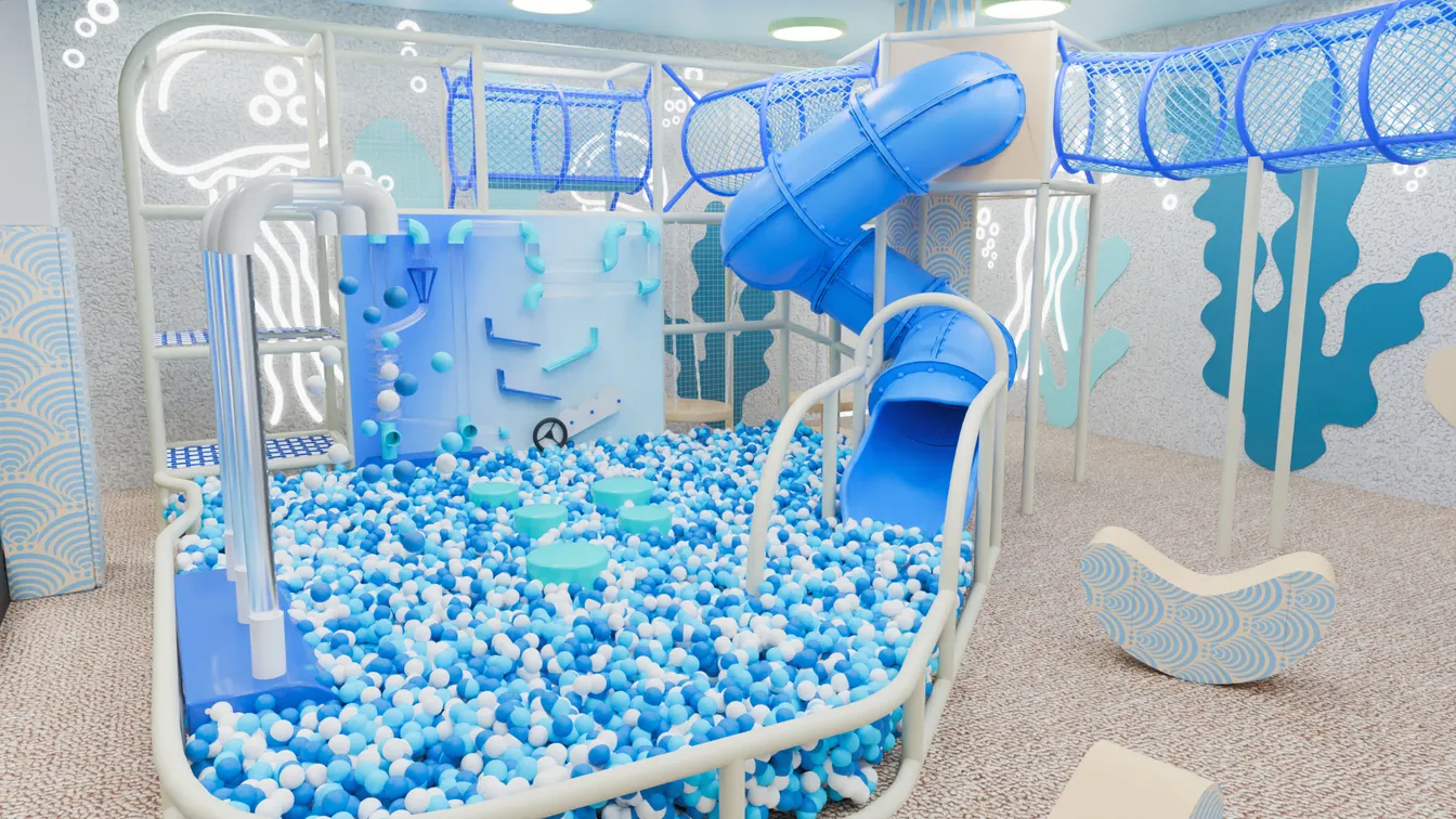 Центральным элементом пространства становится большая игровая зона с сухим бассейном и лабиринтом, где дети могут активно играть, лазать, исследовать переходы и скатываться с горки. Разнообразие игровых элементов позволяет сочетать динамичные игры с развивающими активностями.