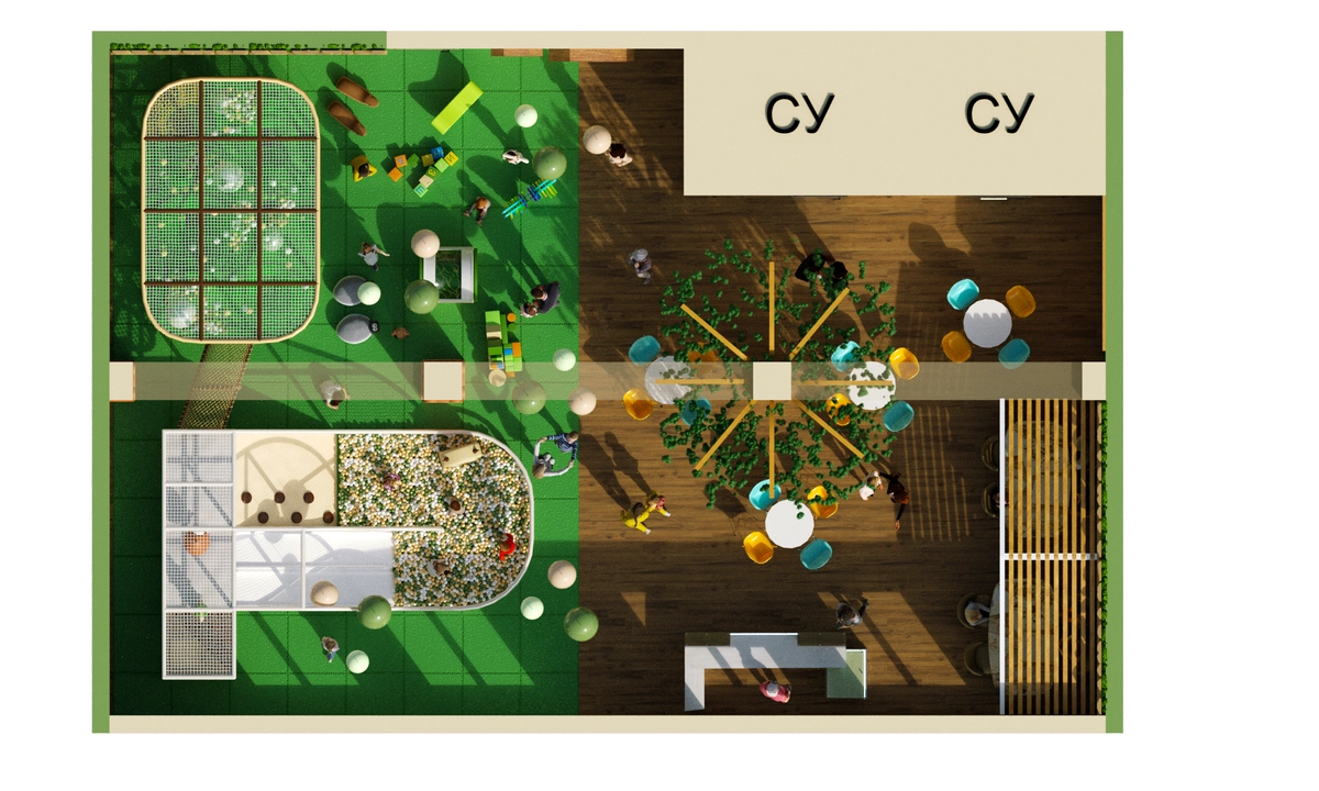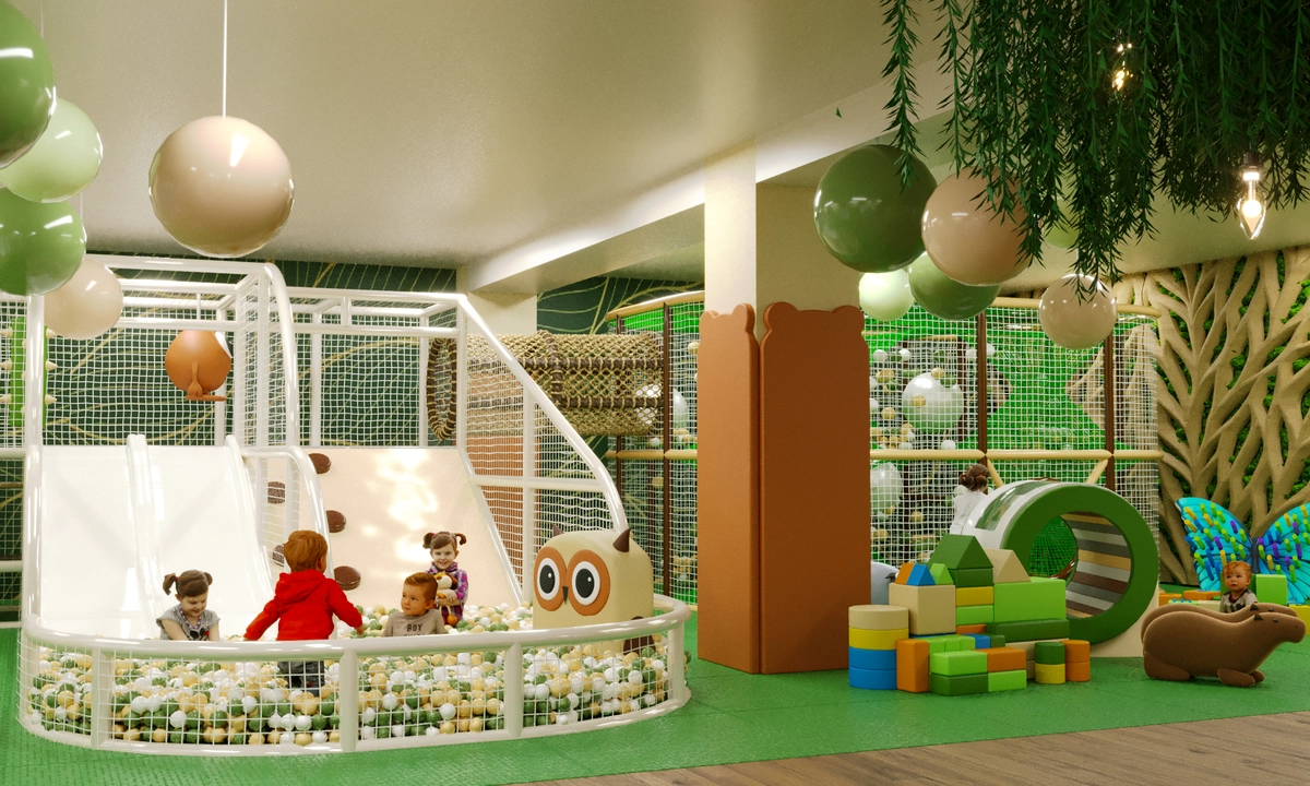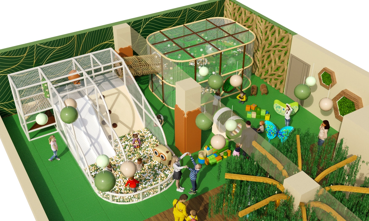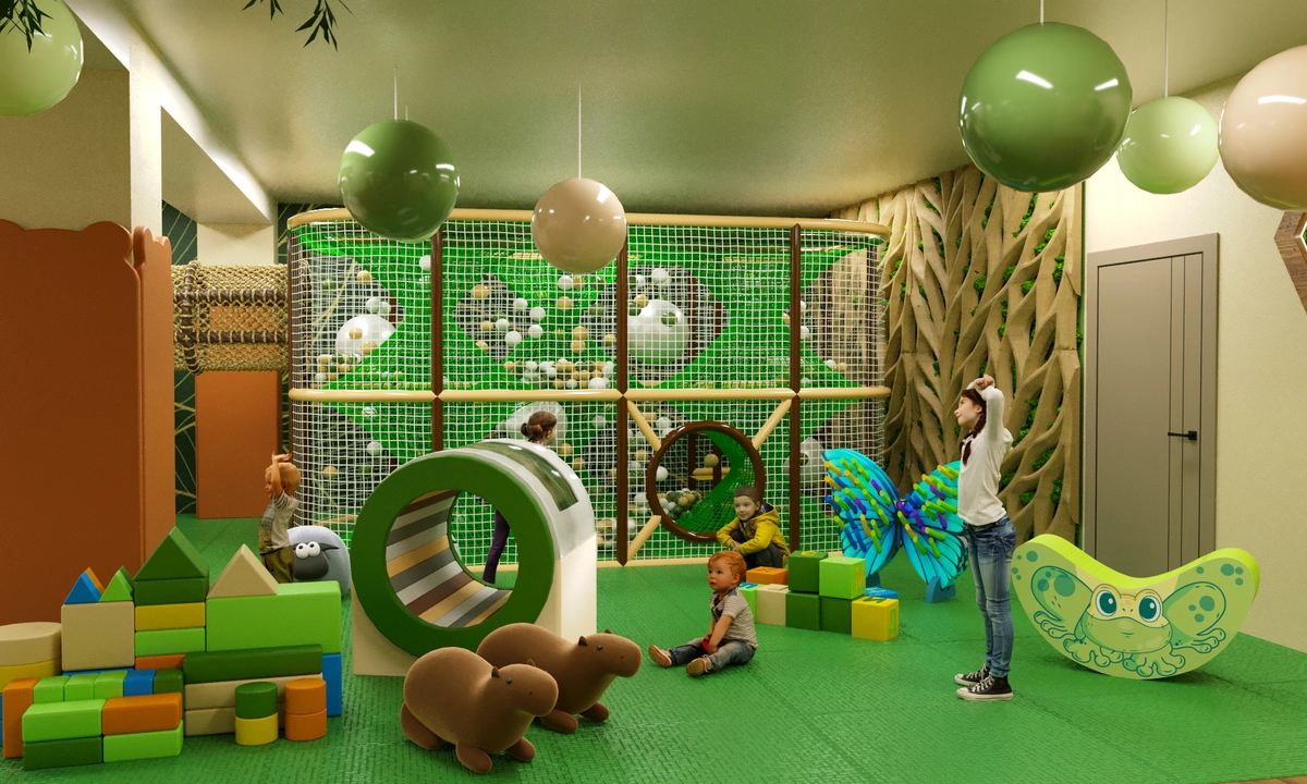 Проект сочетает активные игровые конструкции и зоны для спокойной игры. Пространство продумано так, чтобы дети могли свободно перемещаться между игровыми элементами, взаимодействовать друг с другом и развивать воображение.