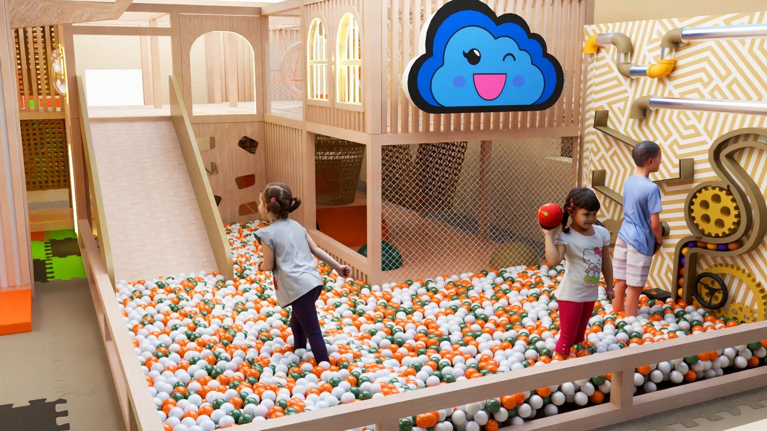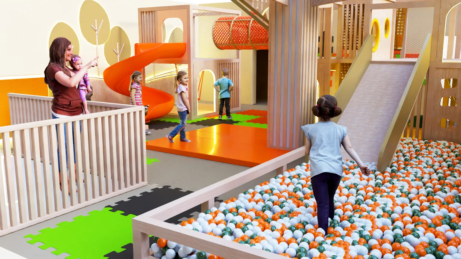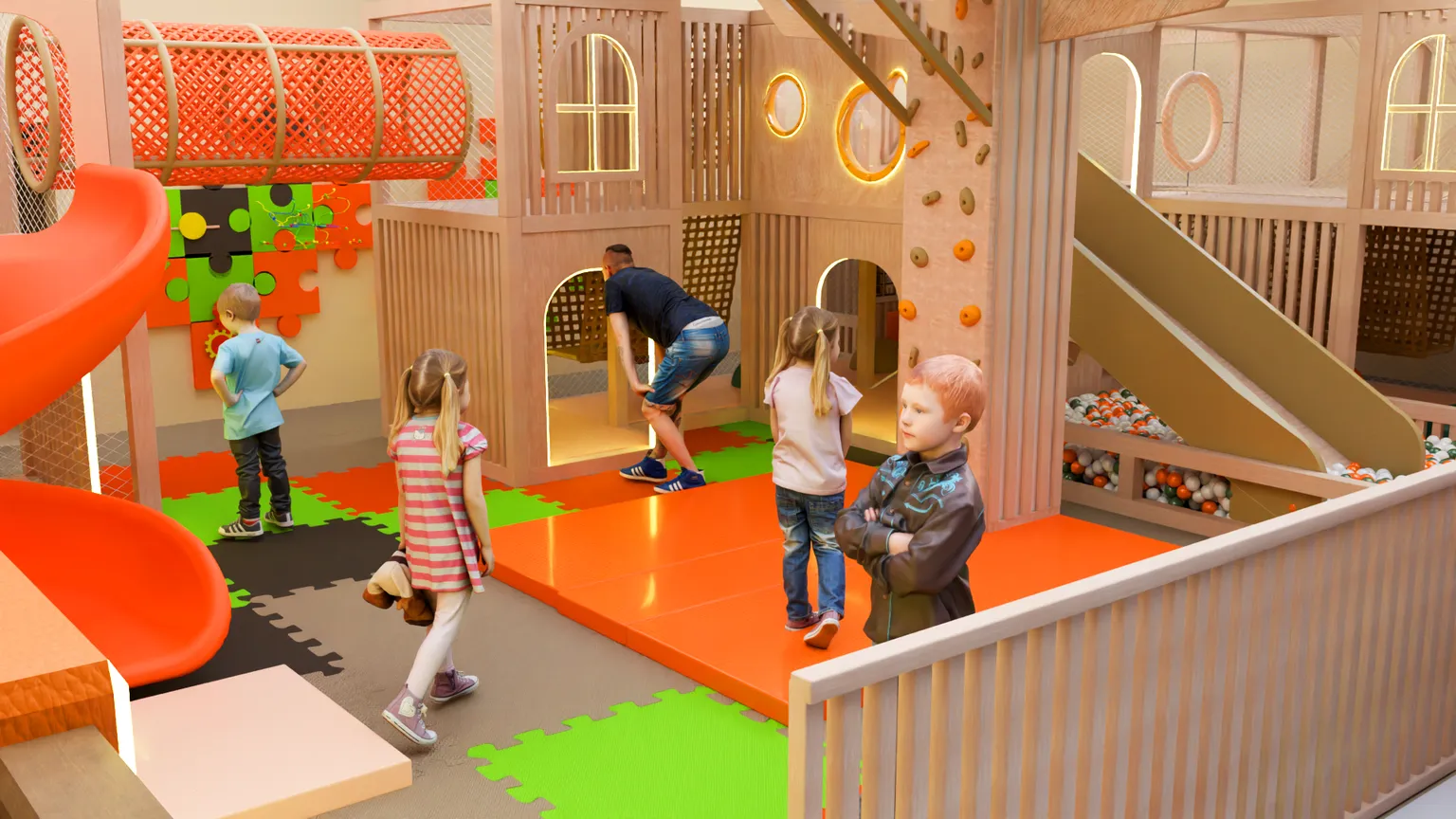 Игровая комната сочетает активные элементы для движения, интерактивные панели и спокойные зоны для игры. Благодаря такому сочетанию пространство подходит для детей разного возраста и позволяет организовать разнообразные игровые сценарии.