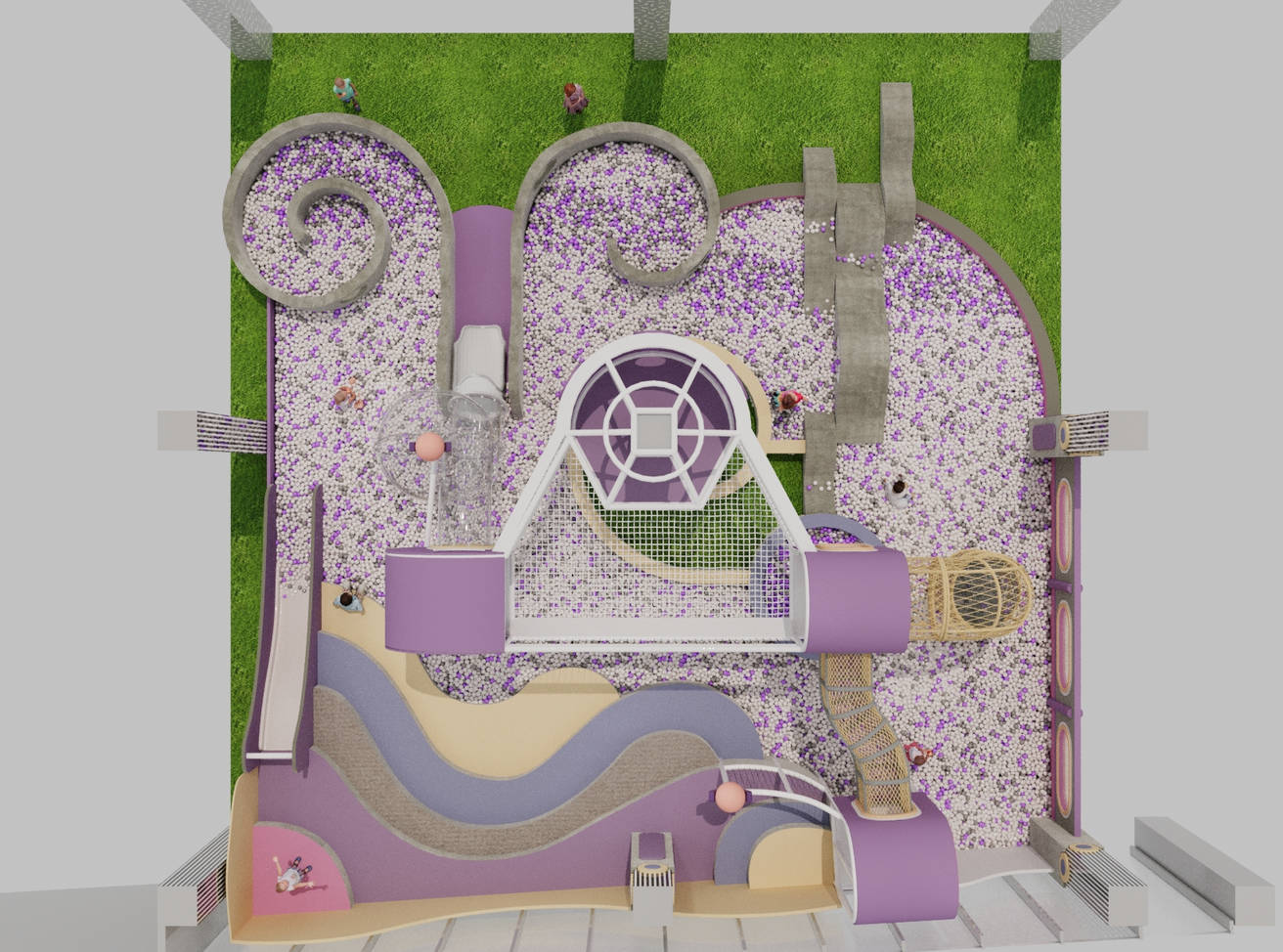 Детская игровая комната «Небо и Пудра» создана в нежной пастельной гамме, которая одновременно радует глаз и расслабляет. Здесь дети могут свободно перемещаться по лабиринтам с переходами и смотровыми окошками, пробираться через сетчатые тоннели и кататься с винтовой горкой.