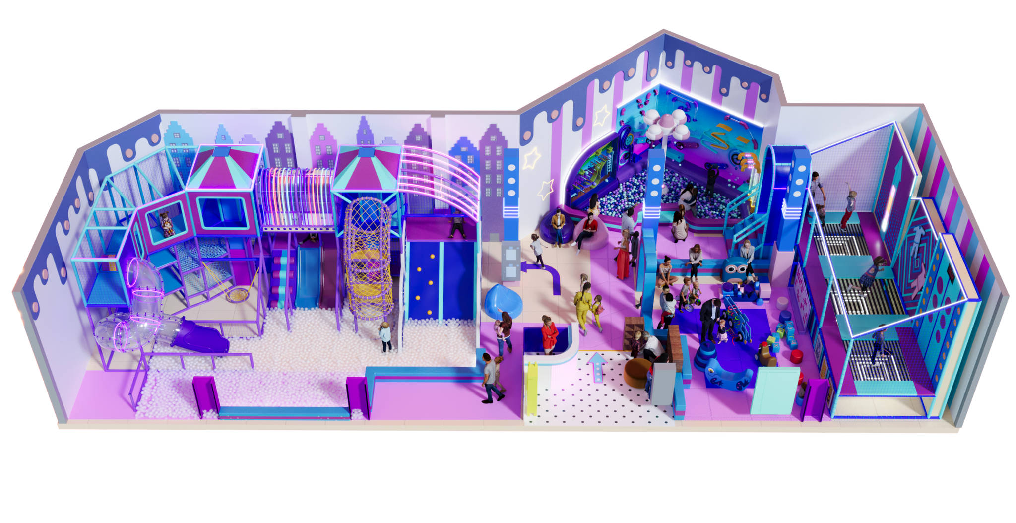 Внутри комплекса предусмотрены современные элементы: прозрачные трубы и полы из поликарбоната, альпийские подъёмы, ячейки «Пропасть», а также декоративные вставки с подсветкой. Горки и фанерные скаты с УФ-печатью делают аттракцион ещё более увлекательным и красочным. «Неонята» — это идеальное решение для семейных центров, где важна не только безопасность и функциональность, но и эффектное визуальное впечатление.
