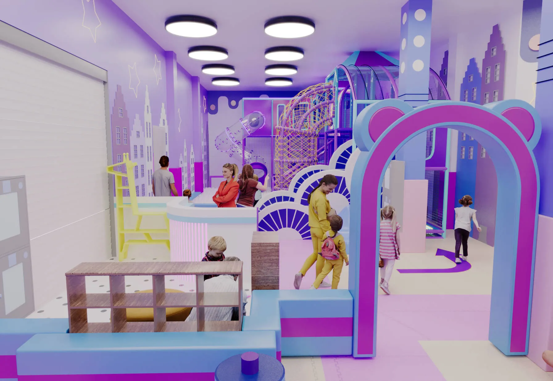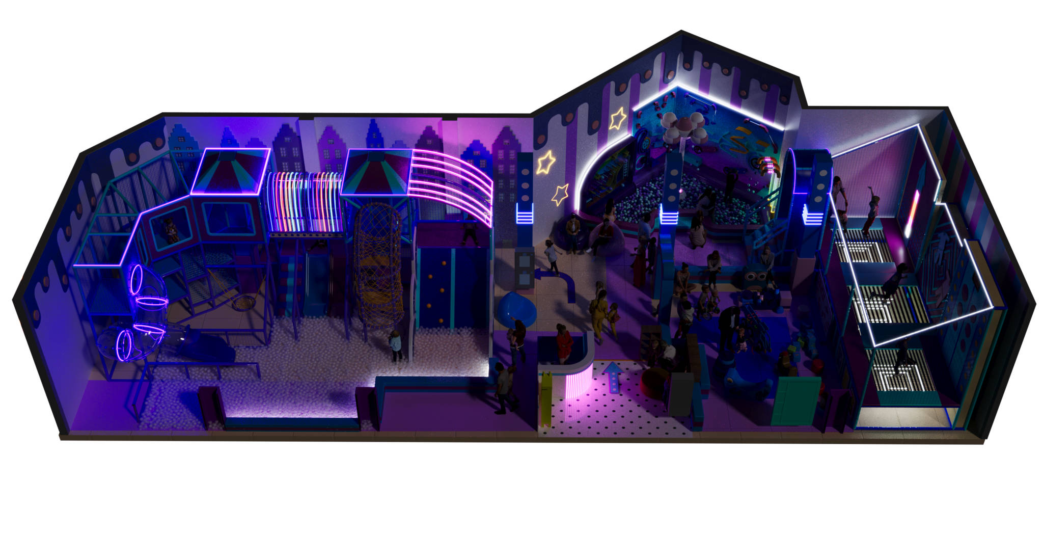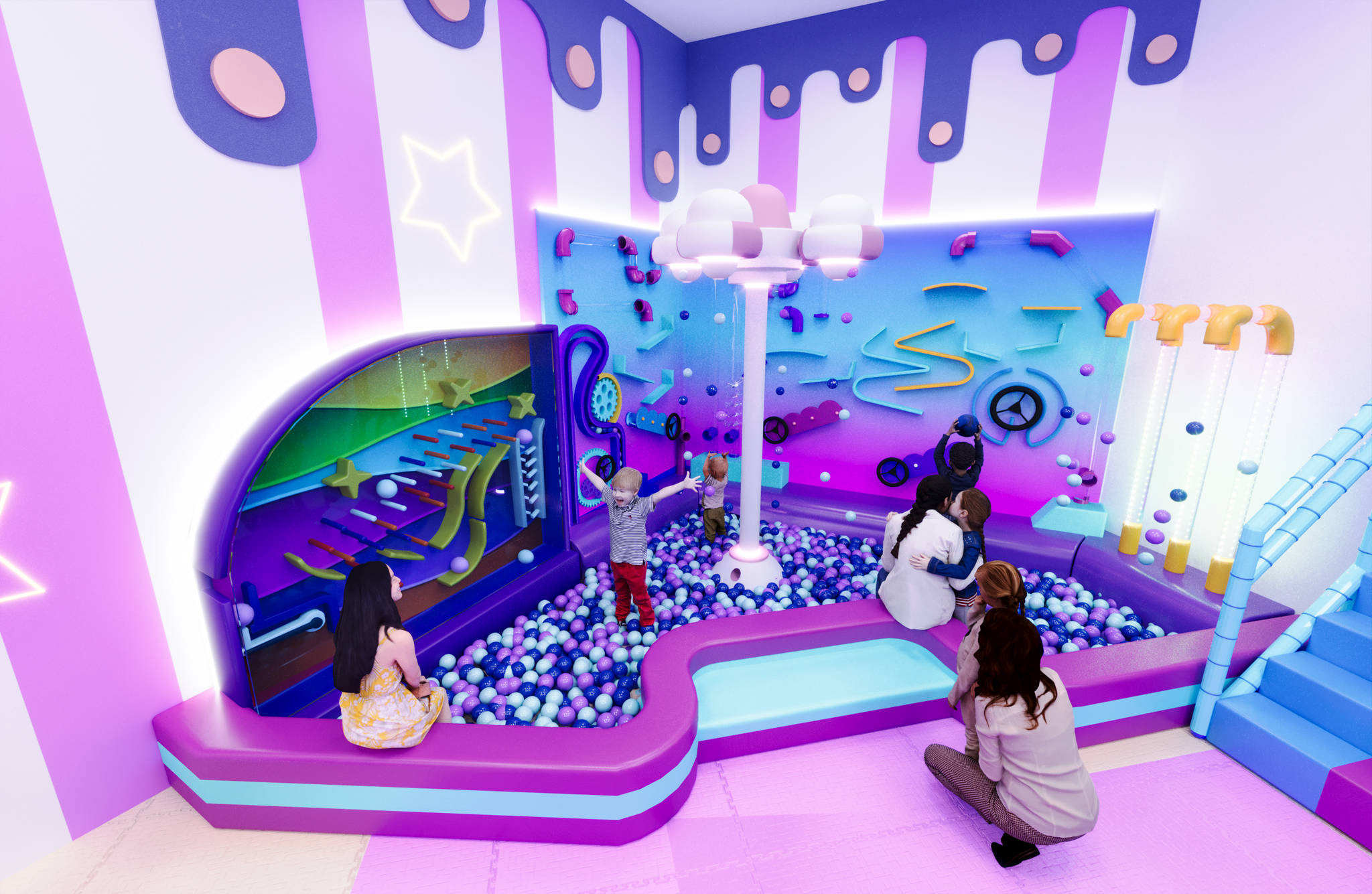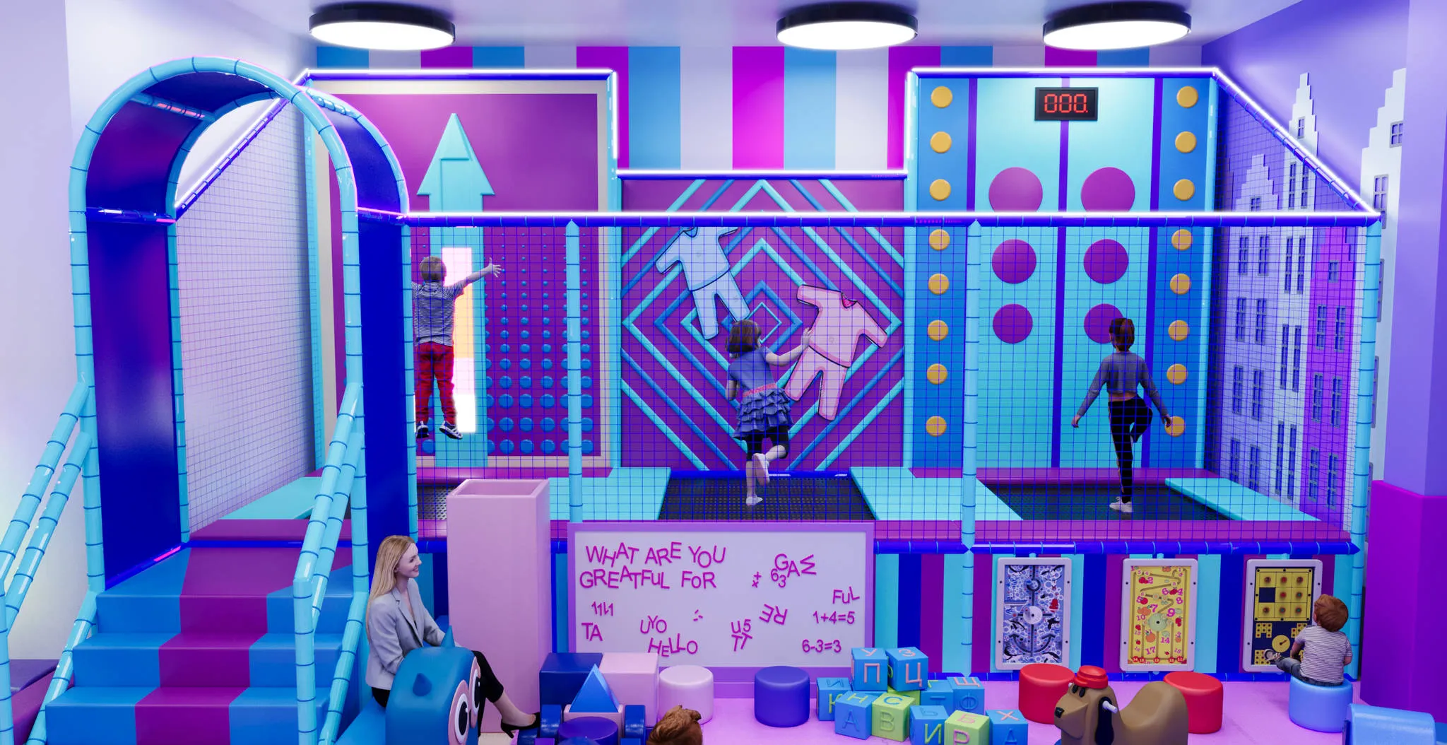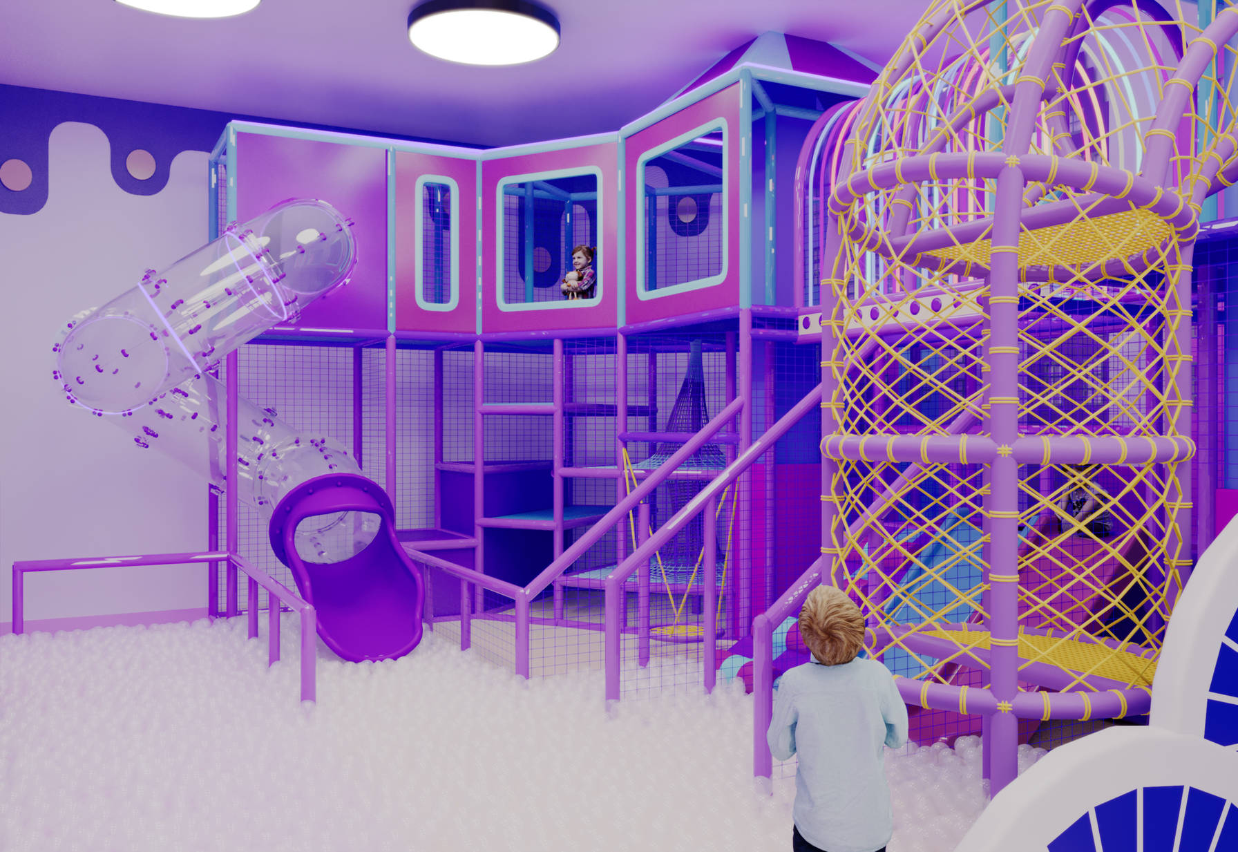 Игровая комната «Неонята» выполнена в ярком футуристичном стиле с акцентом на световые эффекты и неоновую подсветку. Такое оформление создаёт атмосферу праздника и волшебства, где дети чувствуют себя героями мультфильма. Благодаря продуманным зонам с горками, тоннелями и сухим бассейном, малыши могут активно исследовать пространство и развивать ловкость, смелость и фантазию.