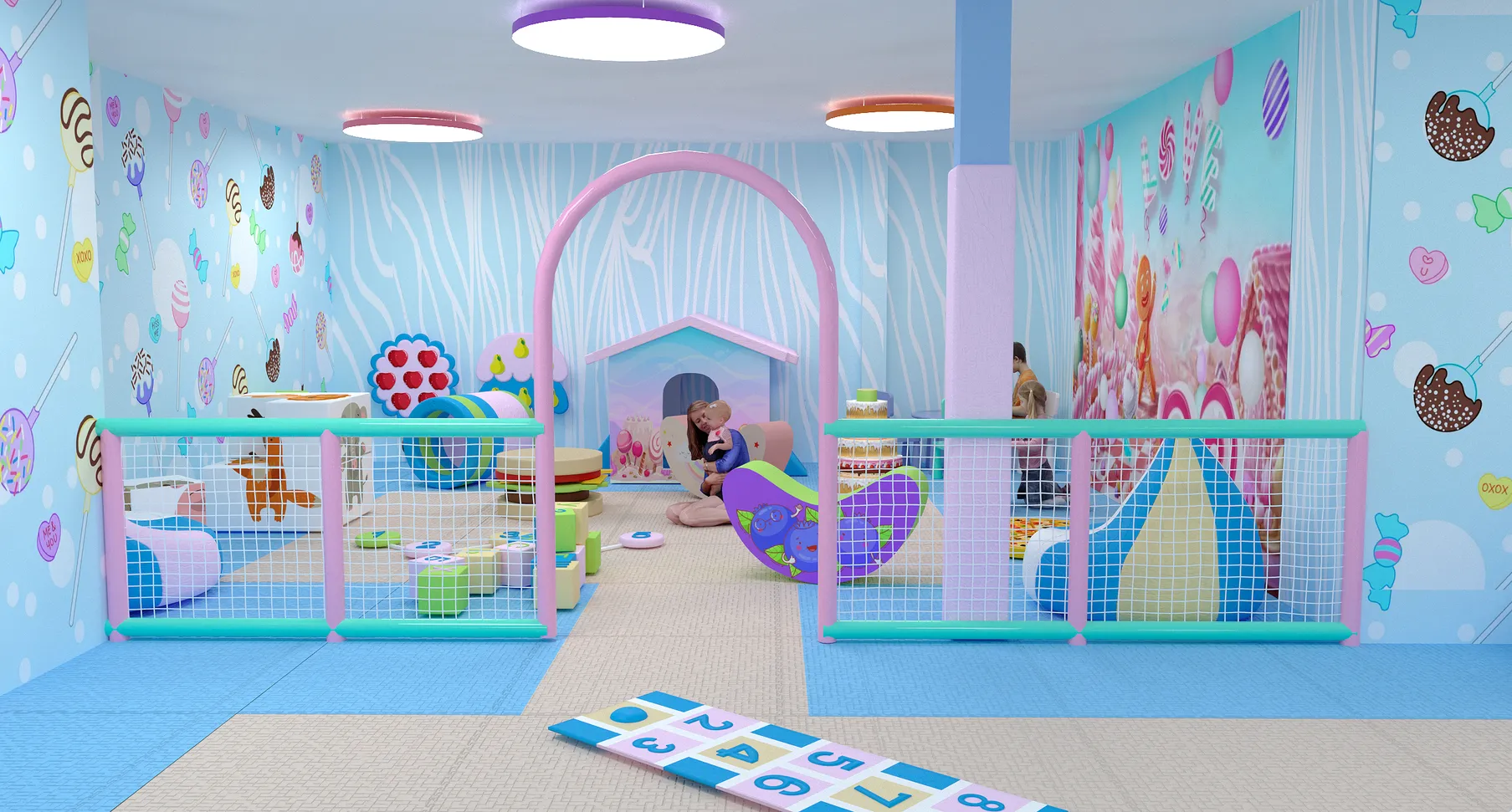 Детская игровая комната «Сахарная планета» — это яркое игровое пространство в стиле волшебного сладкого мира. Интерьер выполнен в пастельных розовых, мятных и голубых оттенках, а стены украшены элементами конфет, леденцов и десертов. Такое оформление создаёт атмосферу сказочной страны сладостей, которая сразу привлекает внимание детей и делает игровую комнату эмоционально насыщенной и запоминающейся.