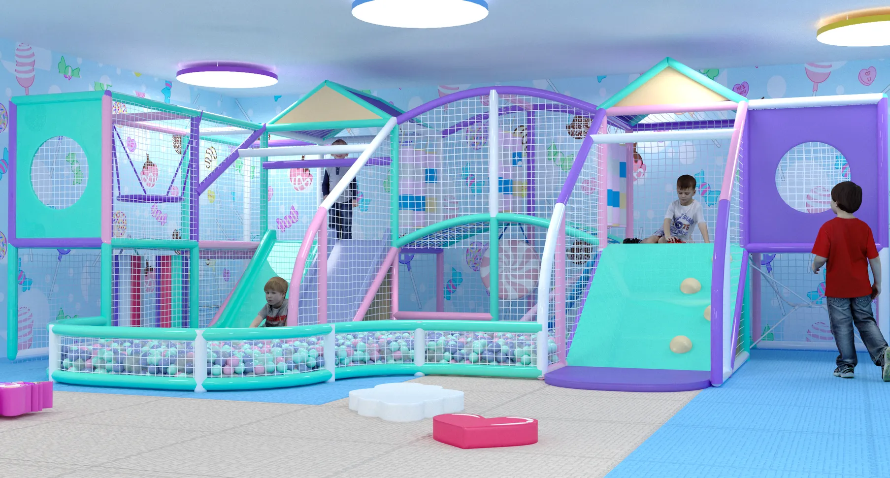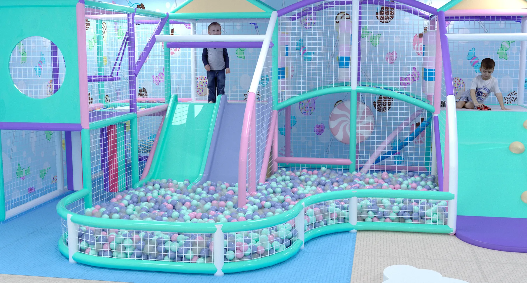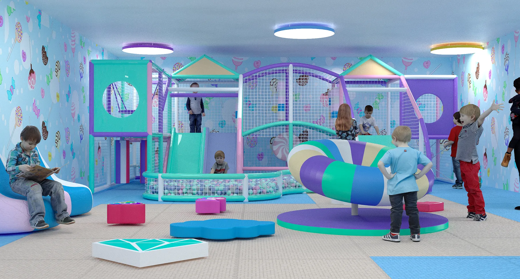 Проект объединяет активные игровые конструкции и спокойные зоны для малышей, благодаря чему пространство подходит для детей разного возраста. Здесь дети могут лазать, исследовать лабиринт, играть в мягкой зоне и отдыхать между активными играми.