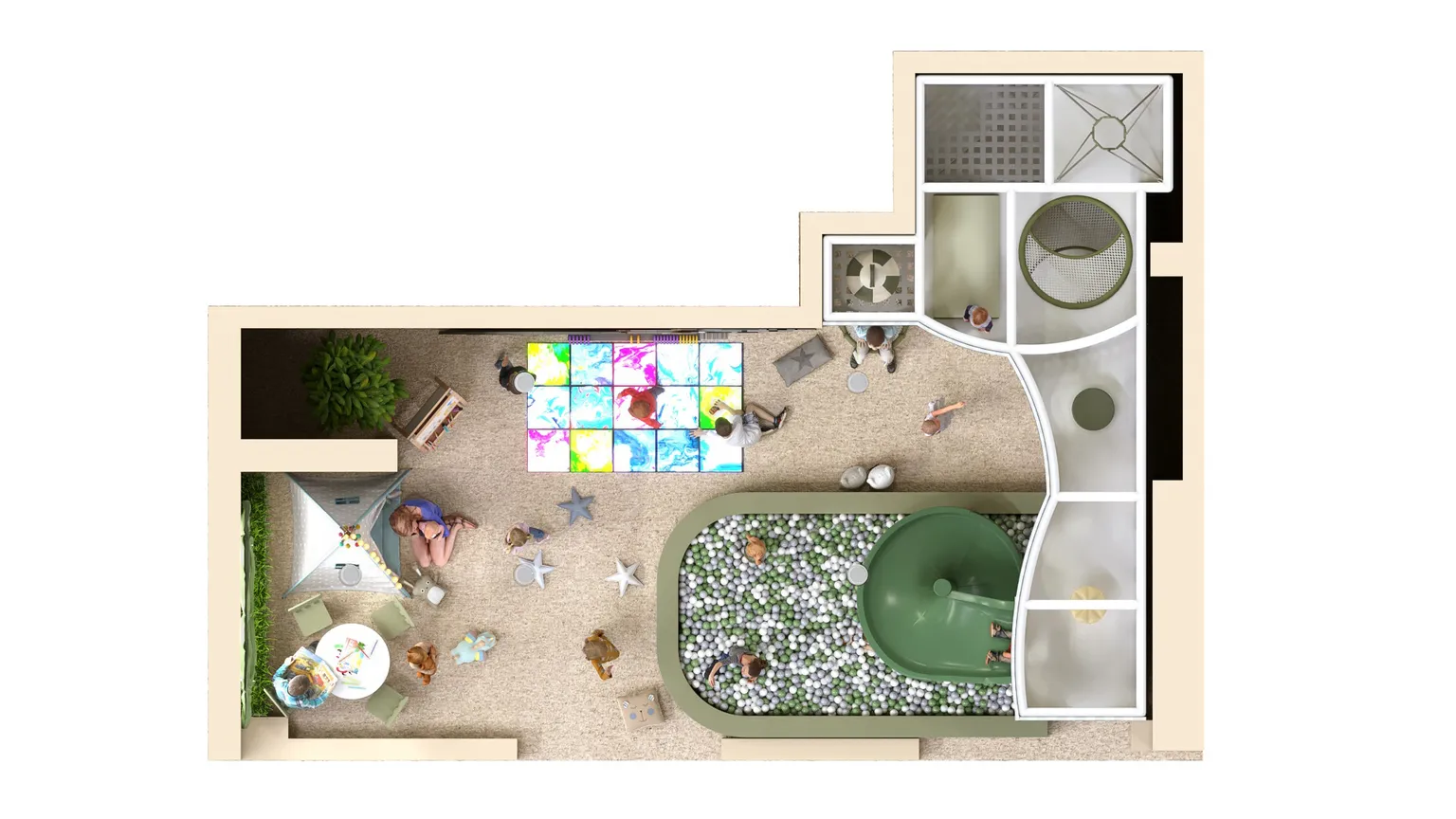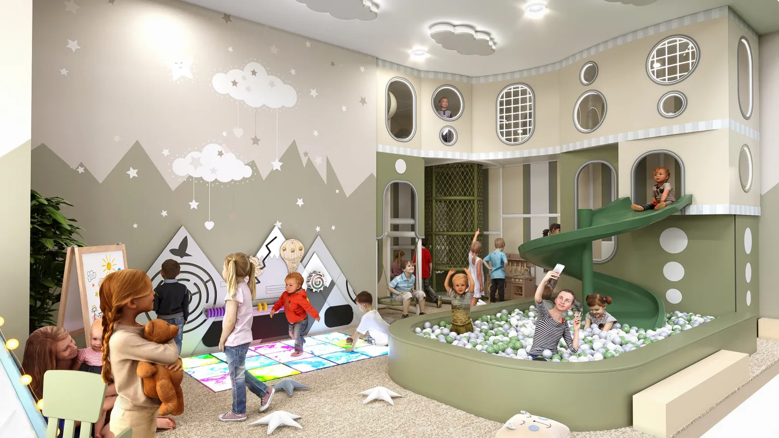 Проект сочетает активную игровую зону с лабиринтом и сухим бассейном и спокойные развивающие элементы. Такая комбинация позволяет детям чередовать активную игру и более спокойные занятия.