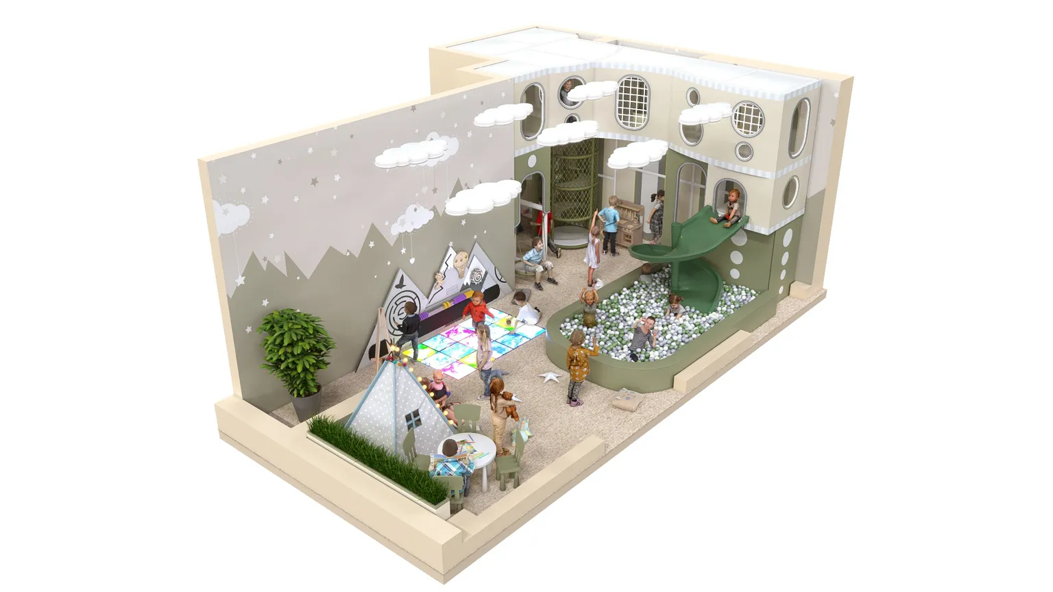 Детская игровая комната «Туманный лес» — это атмосферное игровое пространство с мягкой природной эстетикой и спокойной цветовой гаммой. Дизайн вдохновлён сказочным лесом: облака, горные силуэты, натуральные оттенки и плавные формы создают уютную, почти медитативную атмосферу для игры. Пространство выглядит лёгким и воздушным, благодаря чему дети чувствуют себя комфортно и свободно исследуют игровую среду.