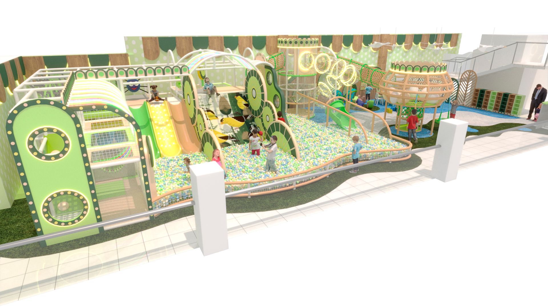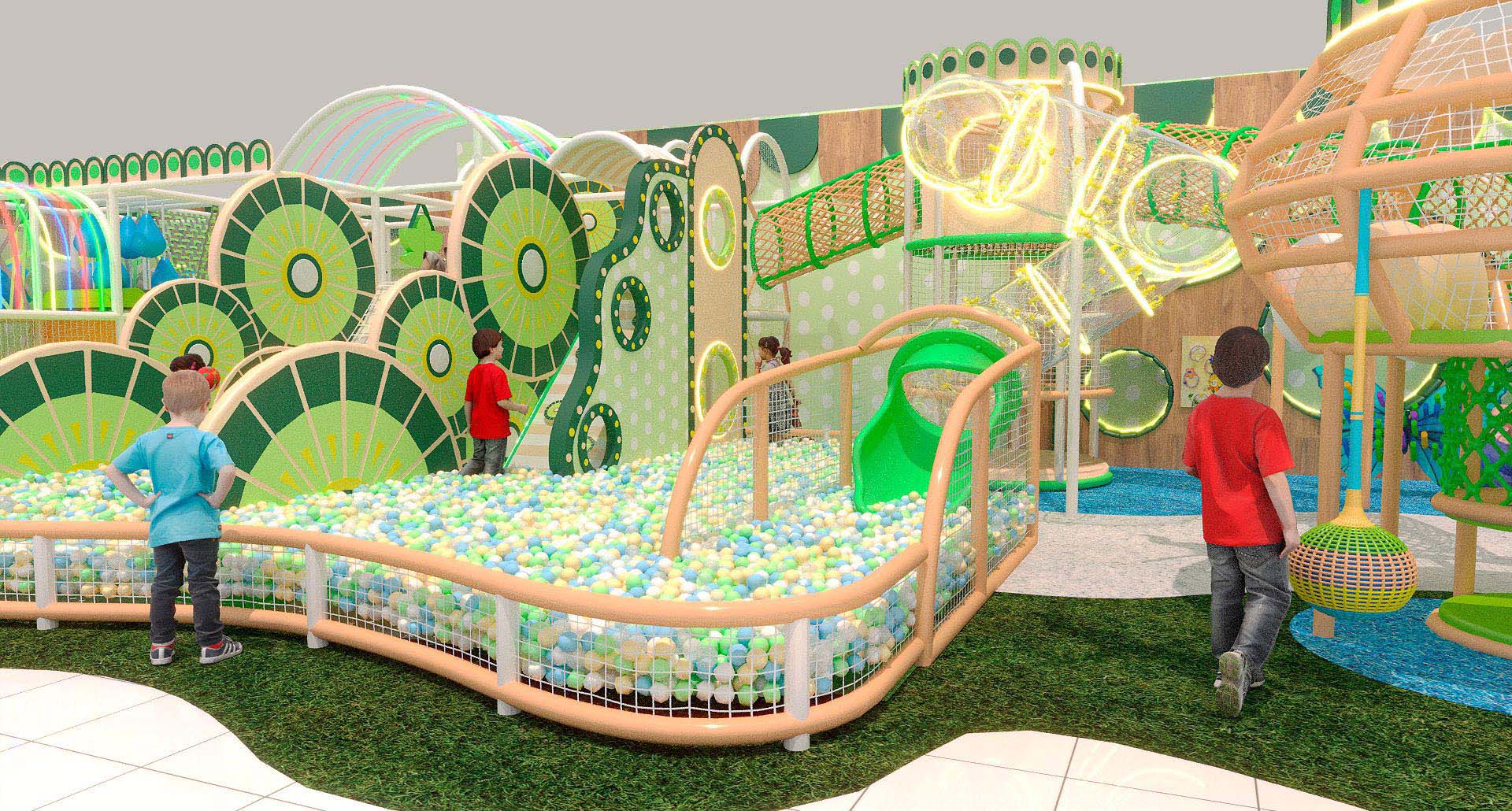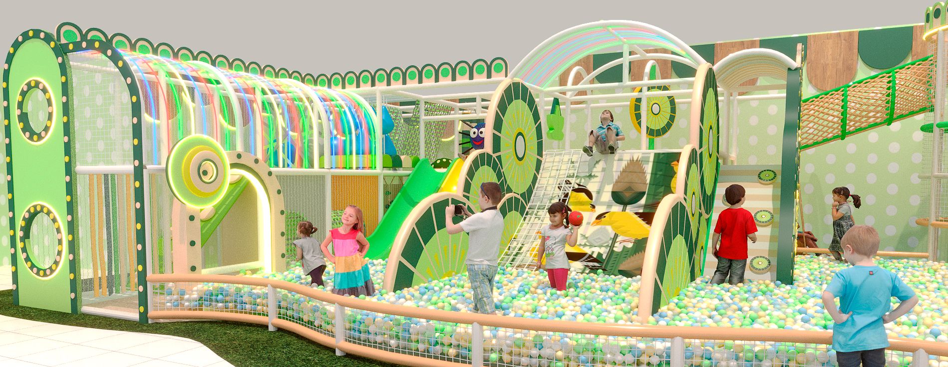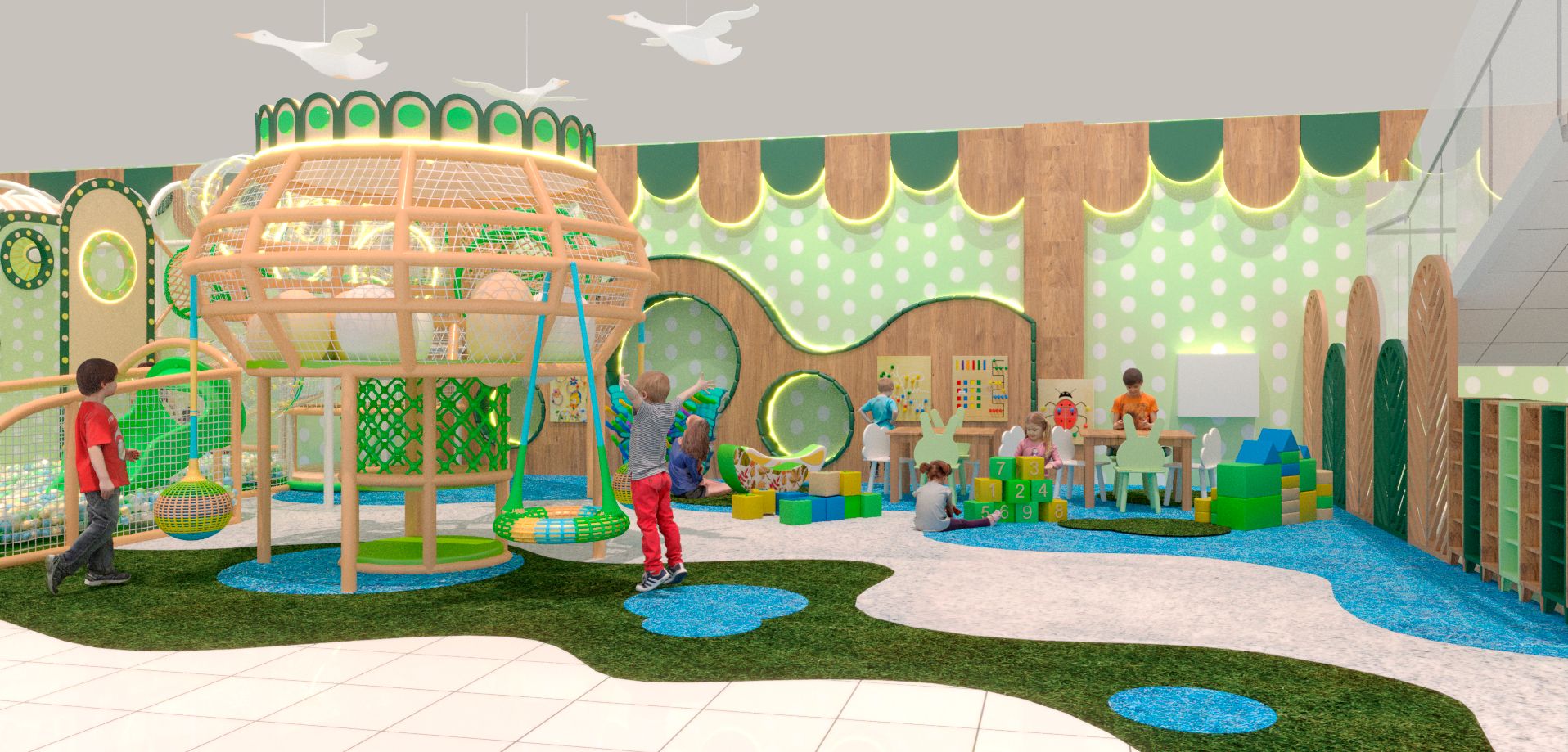 Детская игровая комната «Мохито» 200 м2 в оригинальном дизайне для открытия бизнеса. Необычное оформление в эко-стиле выделит центр среди конкурентов. Это может стать основой для формирования сильного бренда. Эко-концепция будет отличаться от традиционных ярких детских центров, предлагая уникальный и инновационный подход к играм и обучению. Это сделает его более привлекательным для родителей, которые ищут что-то новое и интересное для своих детей. Натуральные цвета, бежево-зеленные оттенки, деревянный декор, напольное покрытие и холмы из искусственной травы создают атмосферу уюта и природные красоты. Такой центр подходит для широкого спектра услуг: от игровых зон и творческих мастерских до проведения дней рождения и других мероприятий. Это увеличивает доходы и позволяет привлекать разные категории клиентов. Успешный детский парк станет основой для франшизы или открытия новых филиалов, что позволит владельцу расширить бизнес и увеличить доходы. Игровое пространство излучает тепло и радость - мягкая подсветка элементов подчеркивает контуры игрового оборудования.