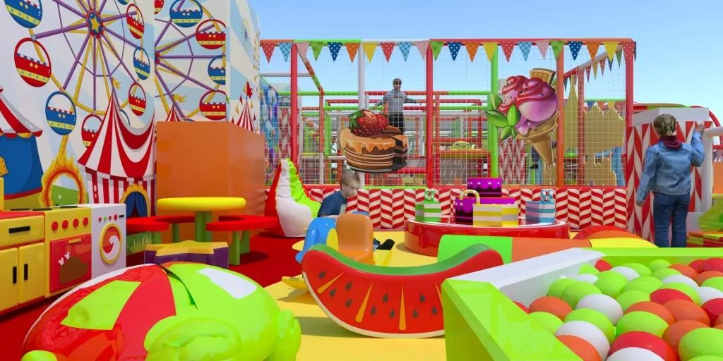 В центре размещены карусели – механическая «Радуга» и «Мини-тортики», которые могут быть как механическими, так и автоматизированными. Зона для малышей включает в себя сухой бассейн, мягкие качалки и кресла, дидактические игрушки, домик-трансформер.
