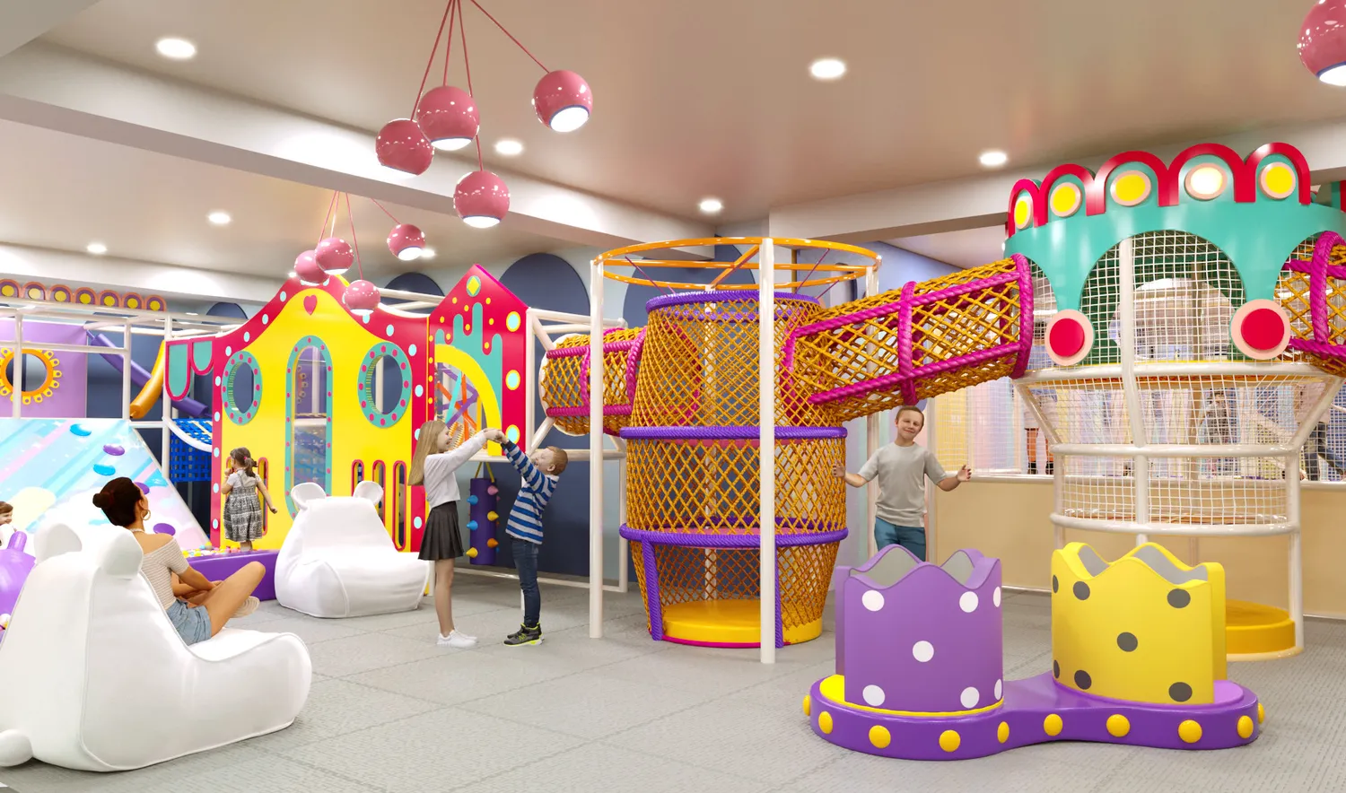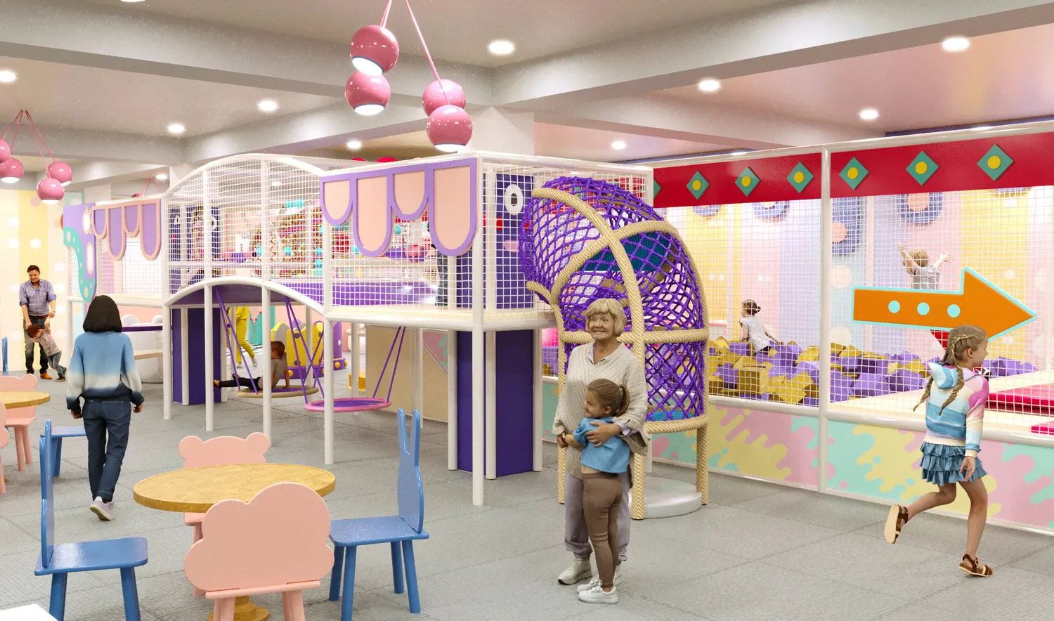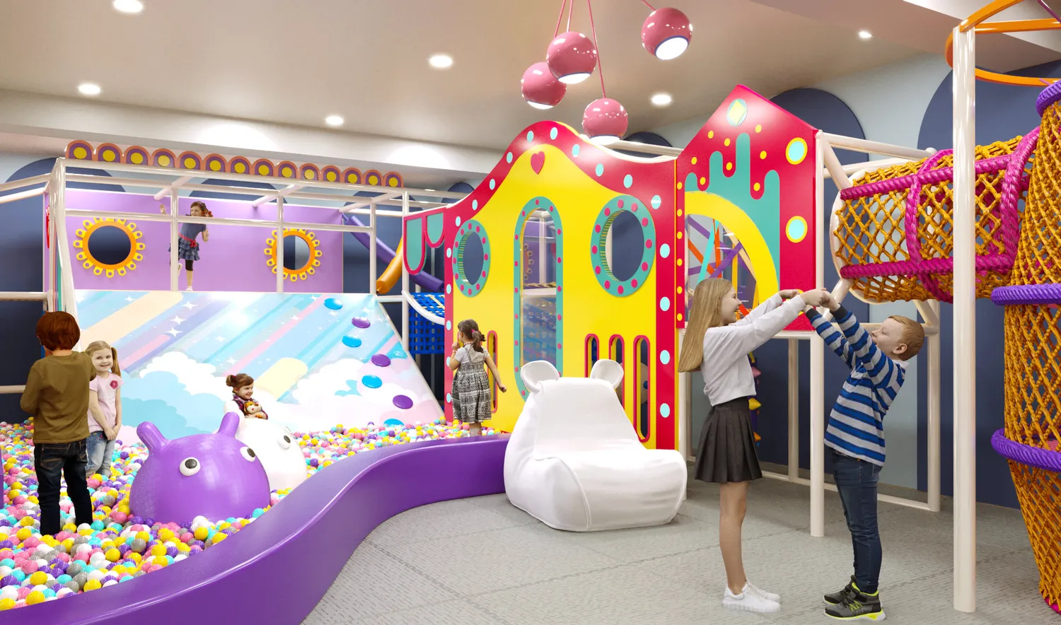 Детский центр «Конфетти Парк» — это масштабное, светлое и визуально тёплое пространство, ориентированное на активный досуг детей разных возрастов. В оформлении использованы мягкие пастельные оттенки с яркими акцентами, округлые формы и декоративные элементы, создающие дружелюбную, безопасную и эмоционально комфортную атмосферу. Пространство выглядит современно и легко, при этом остаётся функциональным и насыщенным игровыми сценариями.