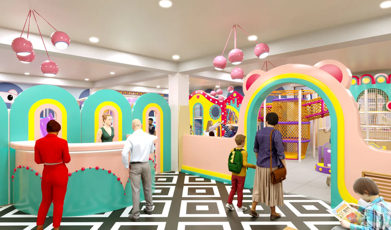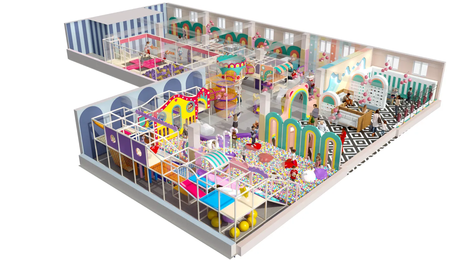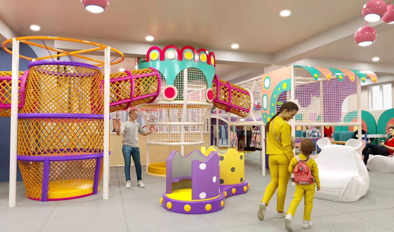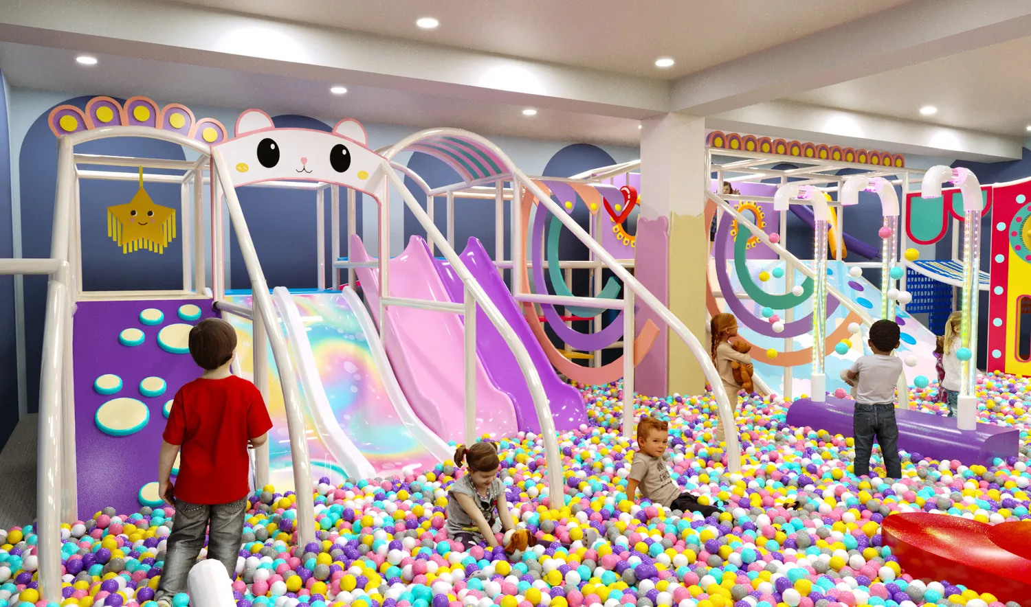 Детский центр «Конфетти Парк» — это масштабное, светлое и визуально тёплое пространство, ориентированное на активный досуг детей разных возрастов. В оформлении использованы мягкие пастельные оттенки с яркими акцентами, округлые формы и декоративные элементы, создающие дружелюбную, безопасную и эмоционально комфортную атмосферу. Пространство выглядит современно и легко, при этом остаётся функциональным и насыщенным игровыми сценариями.