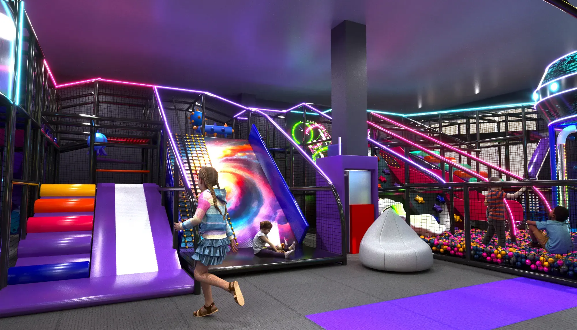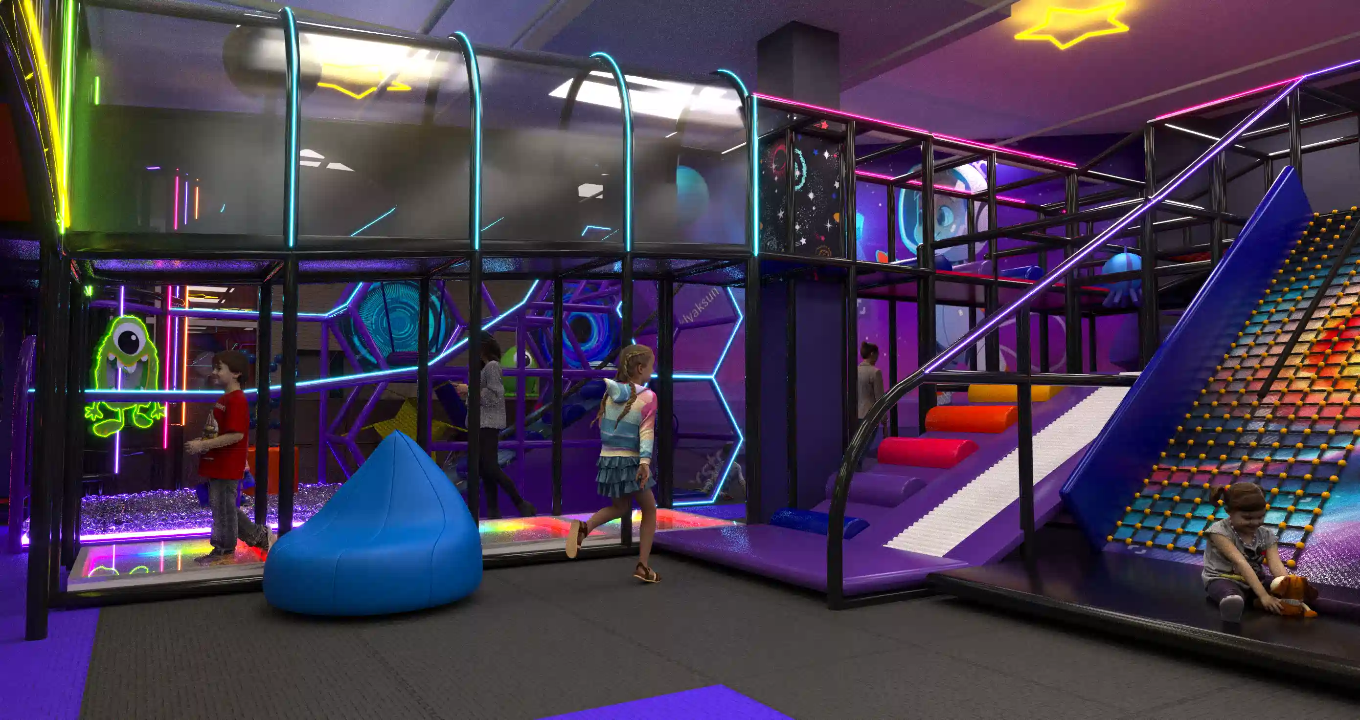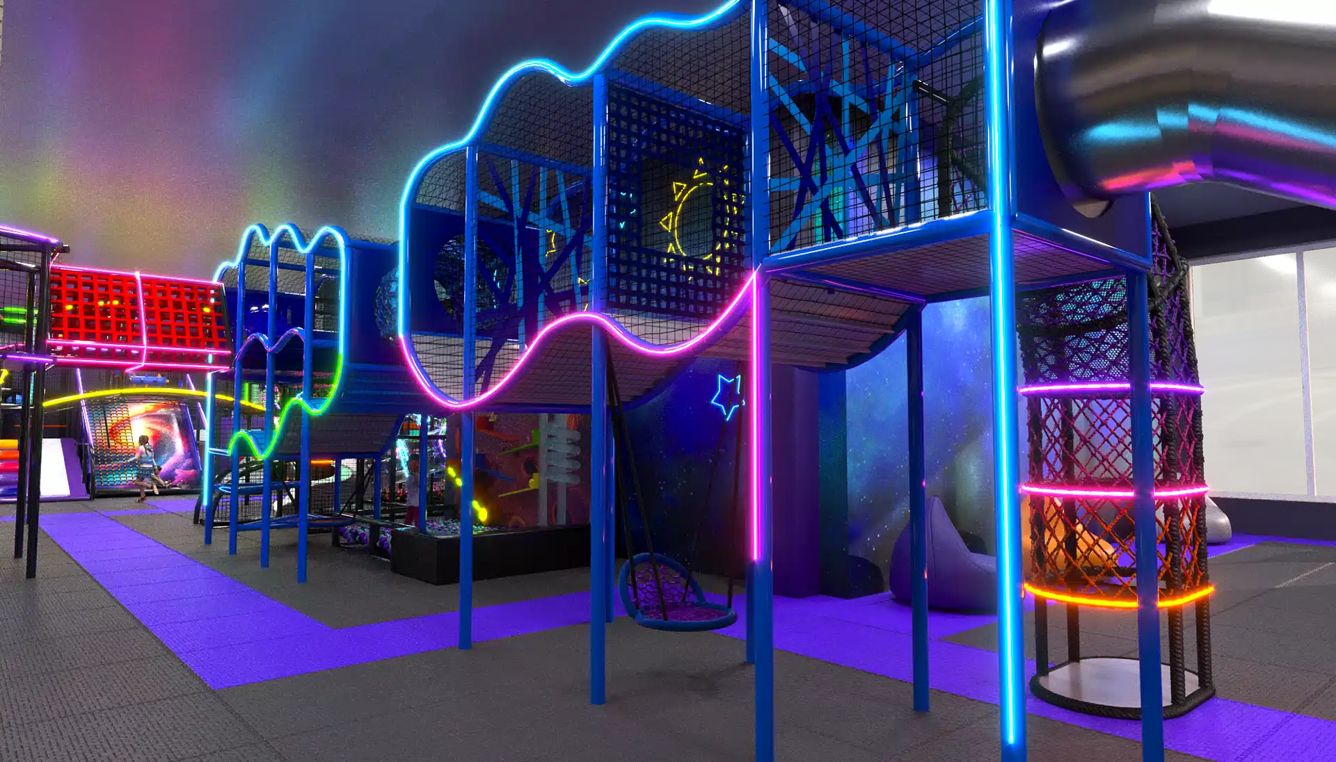 Детский центр «Звёздный Путь» — яркое и современное пространство для активного и творческого досуга детей в космической тематике. В дизайне преобладают тёмные фиолетовые и чёрные оттенки, которые подчёркивают глубину космоса, а неоновая подсветка акцентирует внимание на ключевых игровых элементах, создавая волшебную атмосферу.