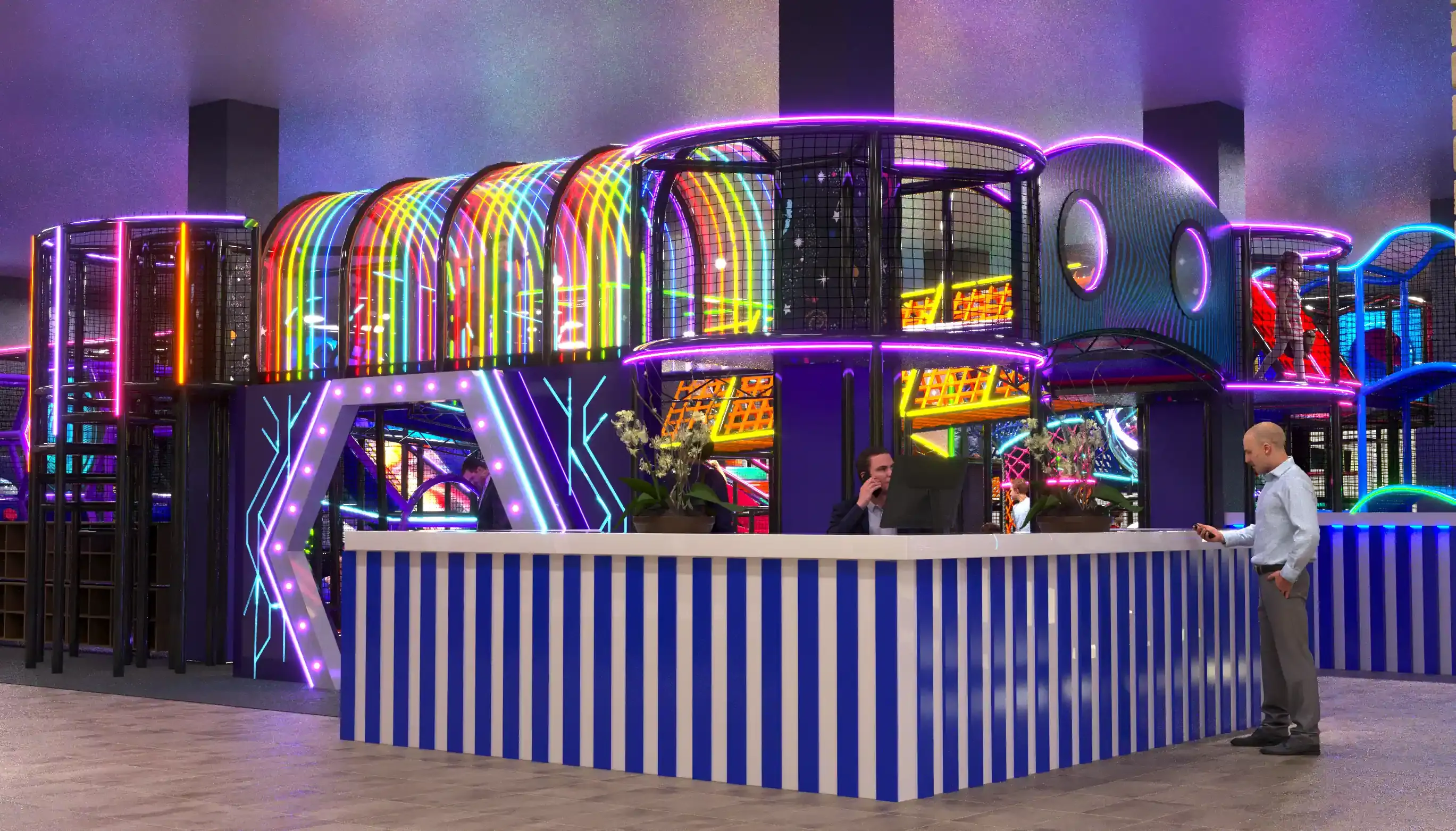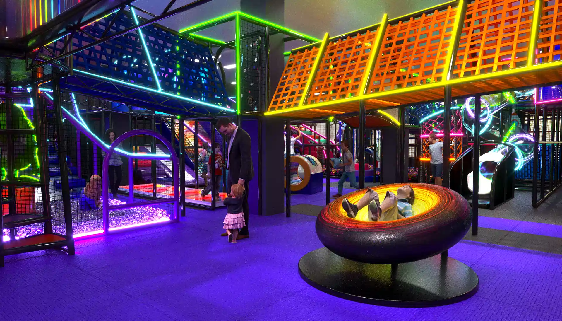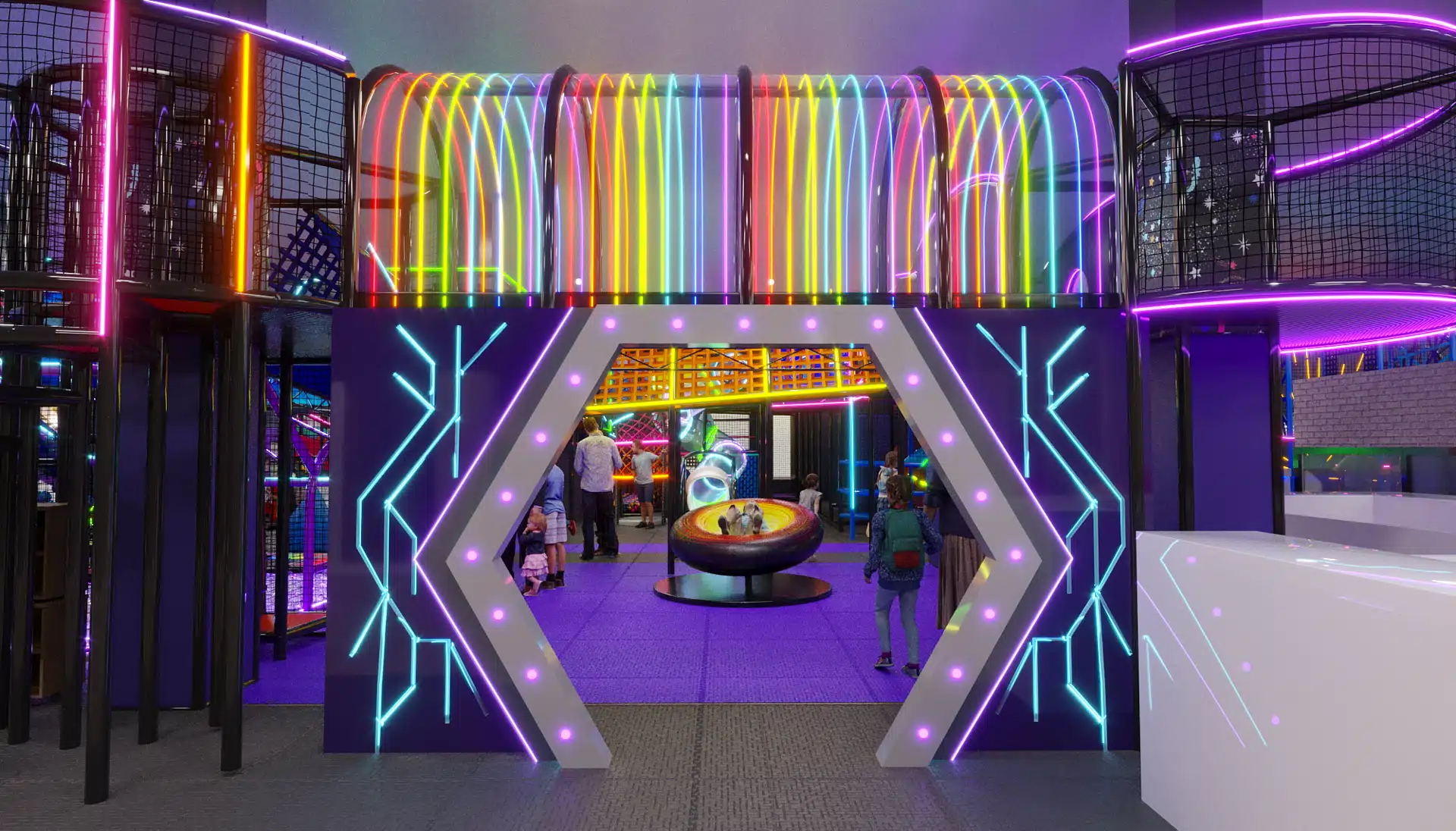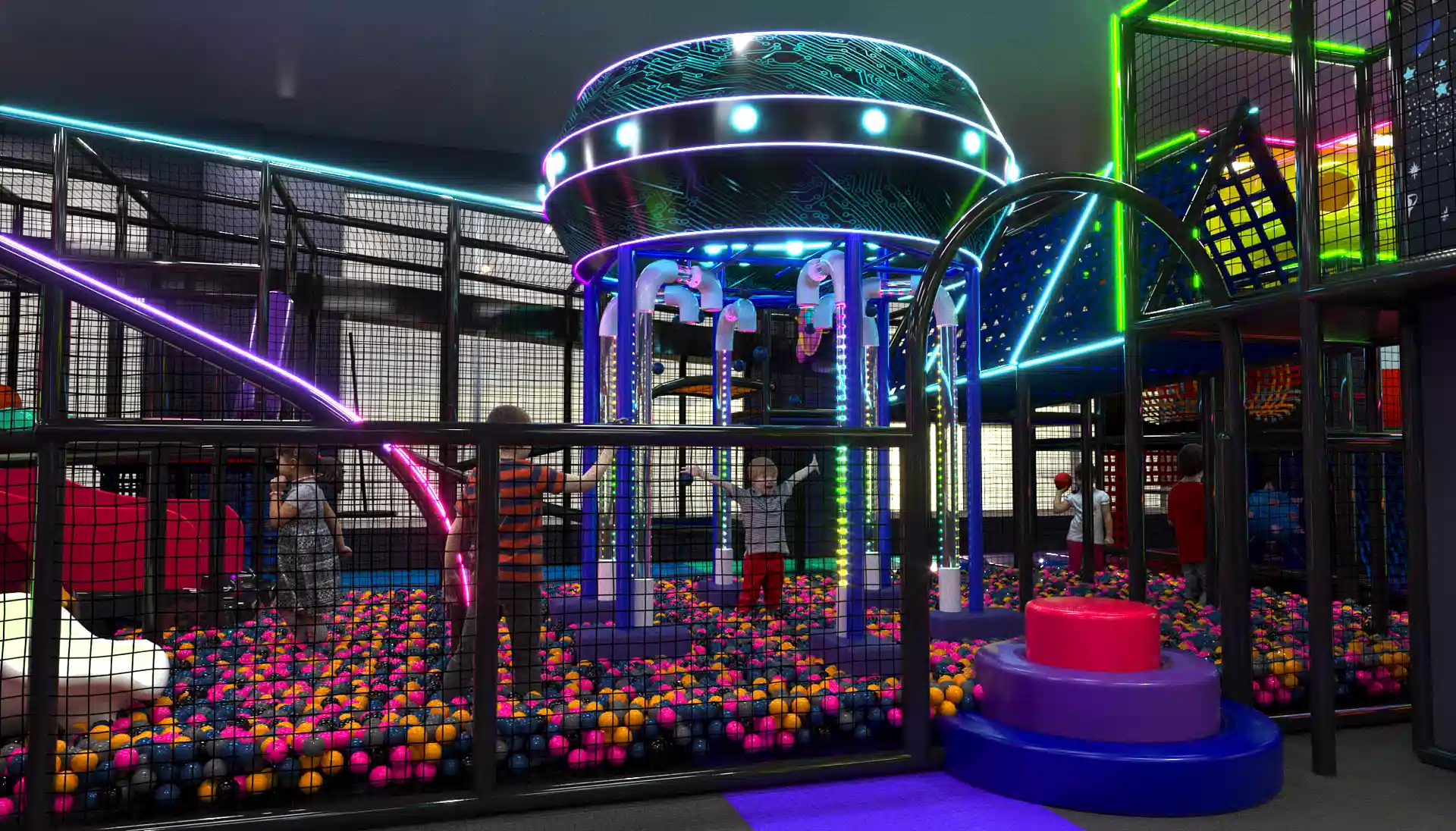 Детский центр «Звёздный Путь» — яркое и современное пространство для активного и творческого досуга детей в космической тематике. В дизайне преобладают тёмные фиолетовые и чёрные оттенки, которые подчёркивают глубину космоса, а неоновая подсветка акцентирует внимание на ключевых игровых элементах, создавая волшебную атмосферу.
