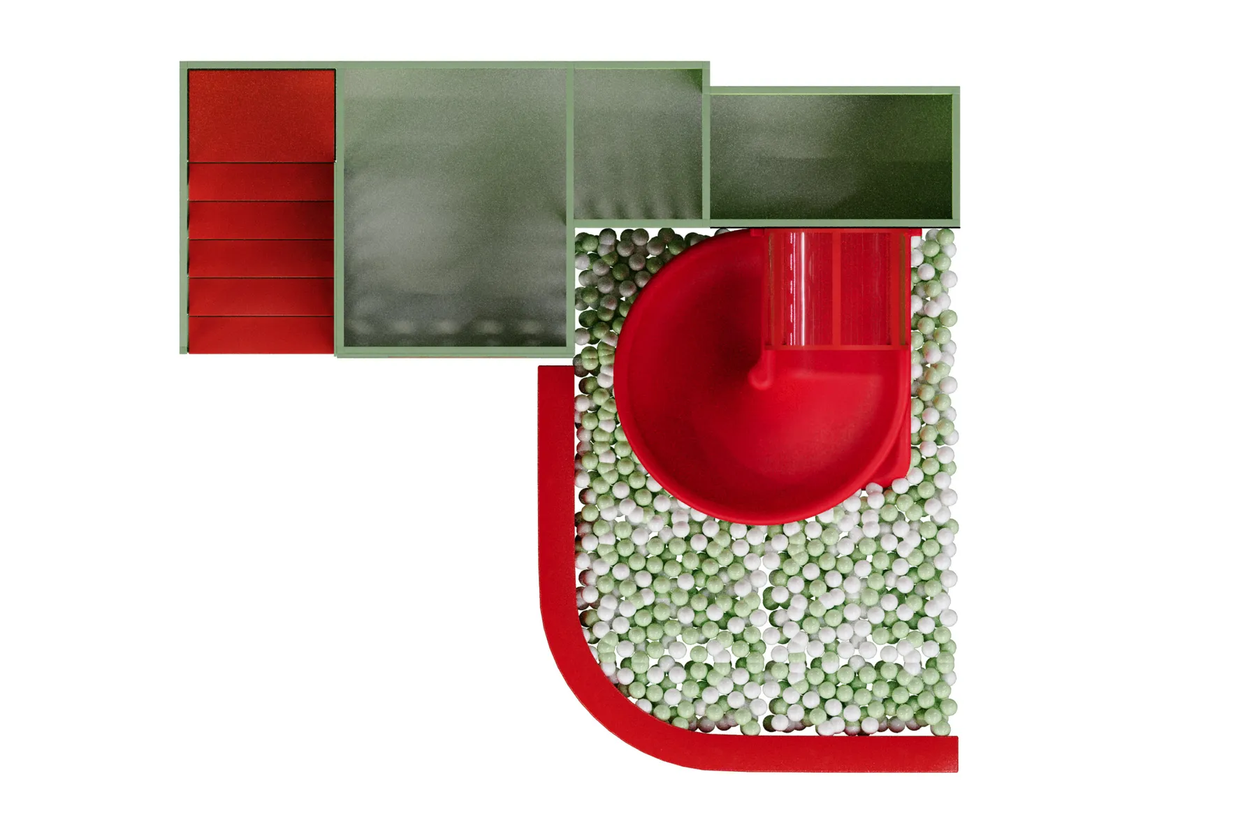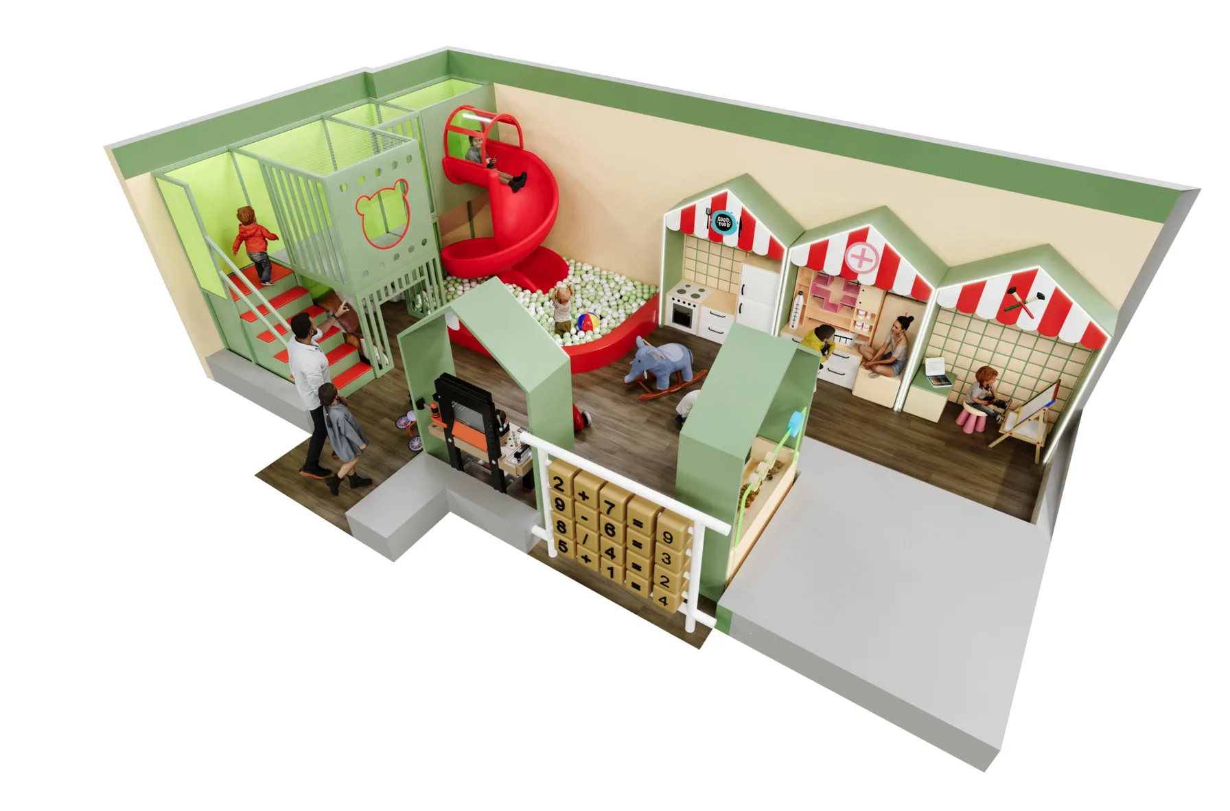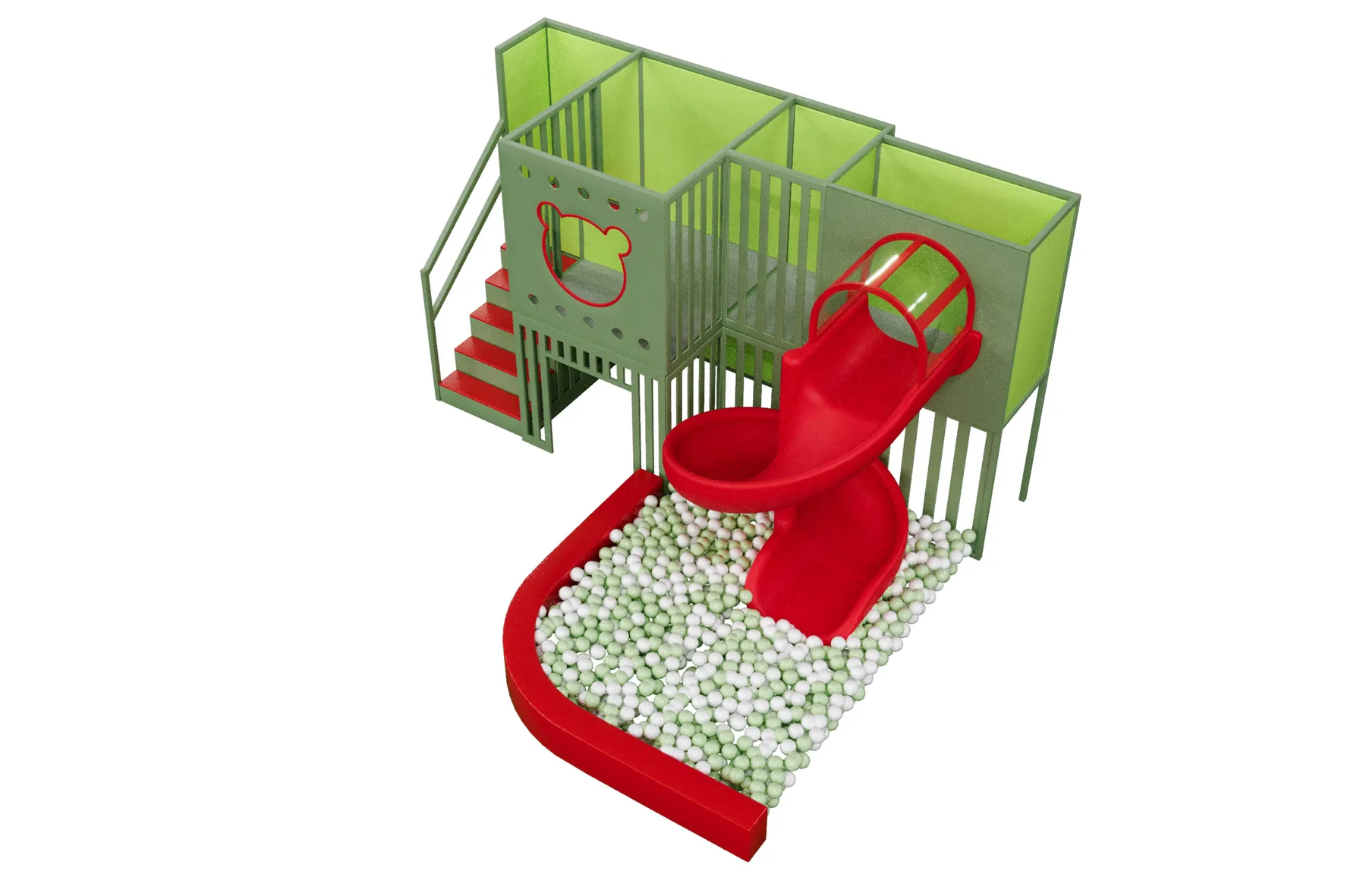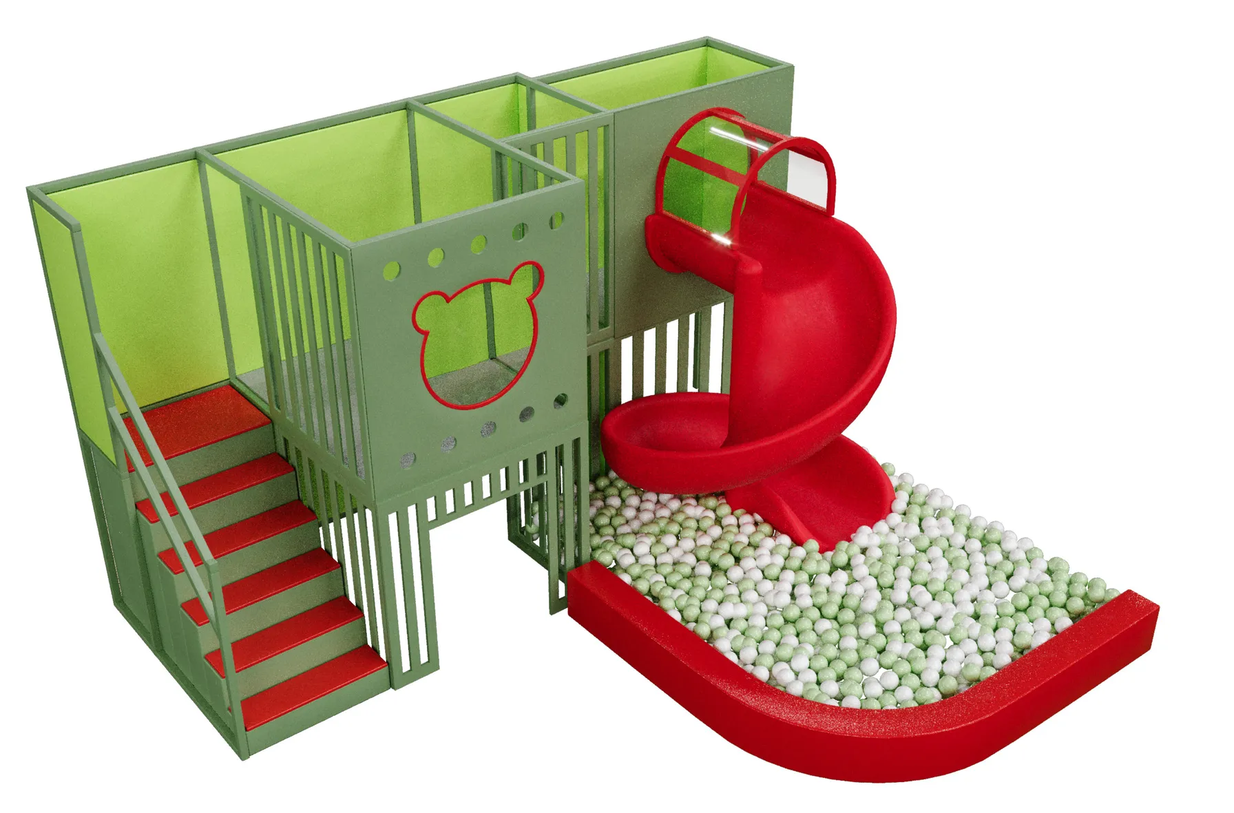 Детский игровой лабиринт для кафе «Городок» — это компактное, но насыщенное игровое пространство, объединяющее двухуровневую зону с безопасной лестницей, закрытые игровые модули и яркую винтовую горку, которая ведёт в сухой бассейн с шариками, создавая для детей активный и увлекательный маршрут игры; конструкция выполнена в контрастной зелёно-красной гамме, хорошо зонирует пространство кафе, подходит для детей младшего возраста, стимулирует движение, координацию и самостоятельную игру, при этом оставаясь визуально аккуратной, безопасной и легко интегрируемой в интерьер семейного заведения.