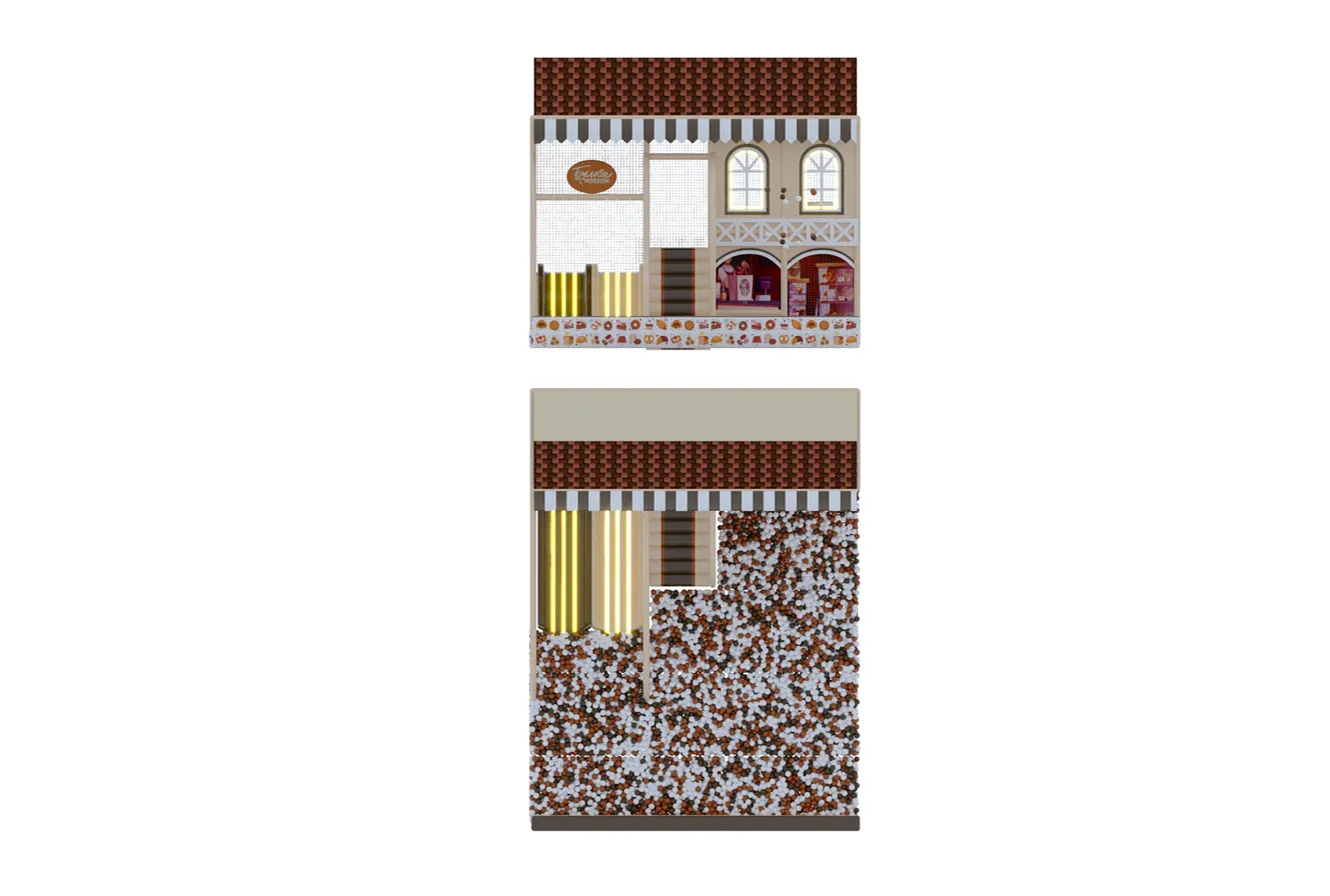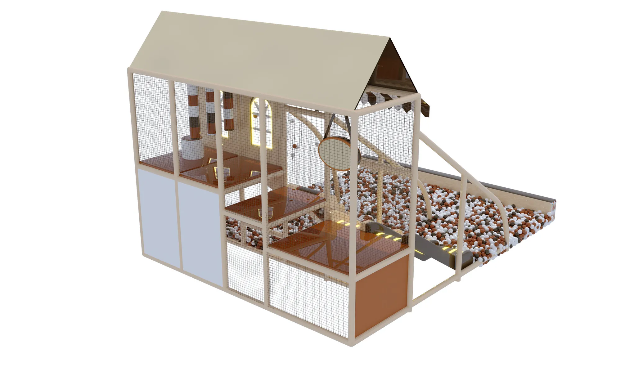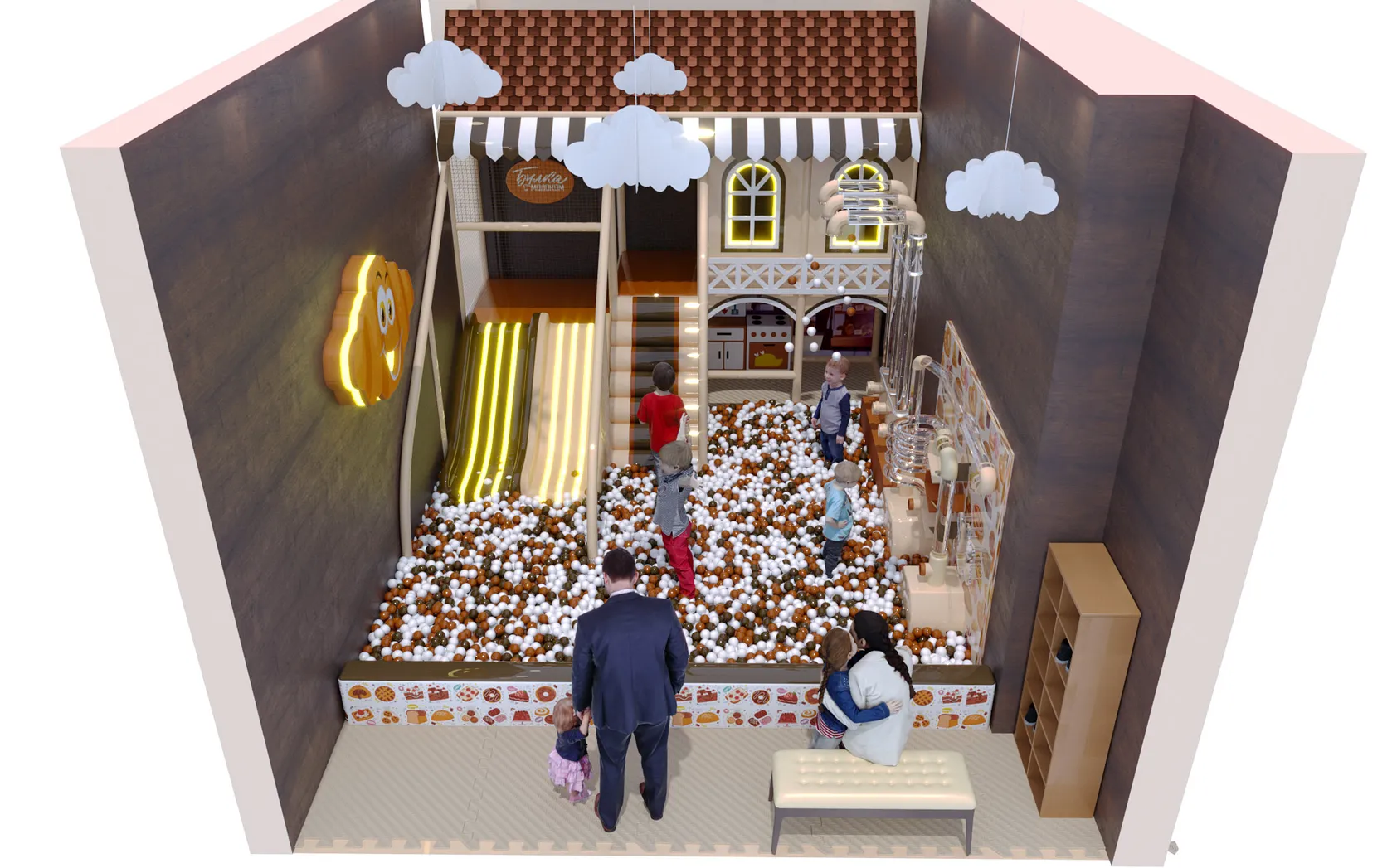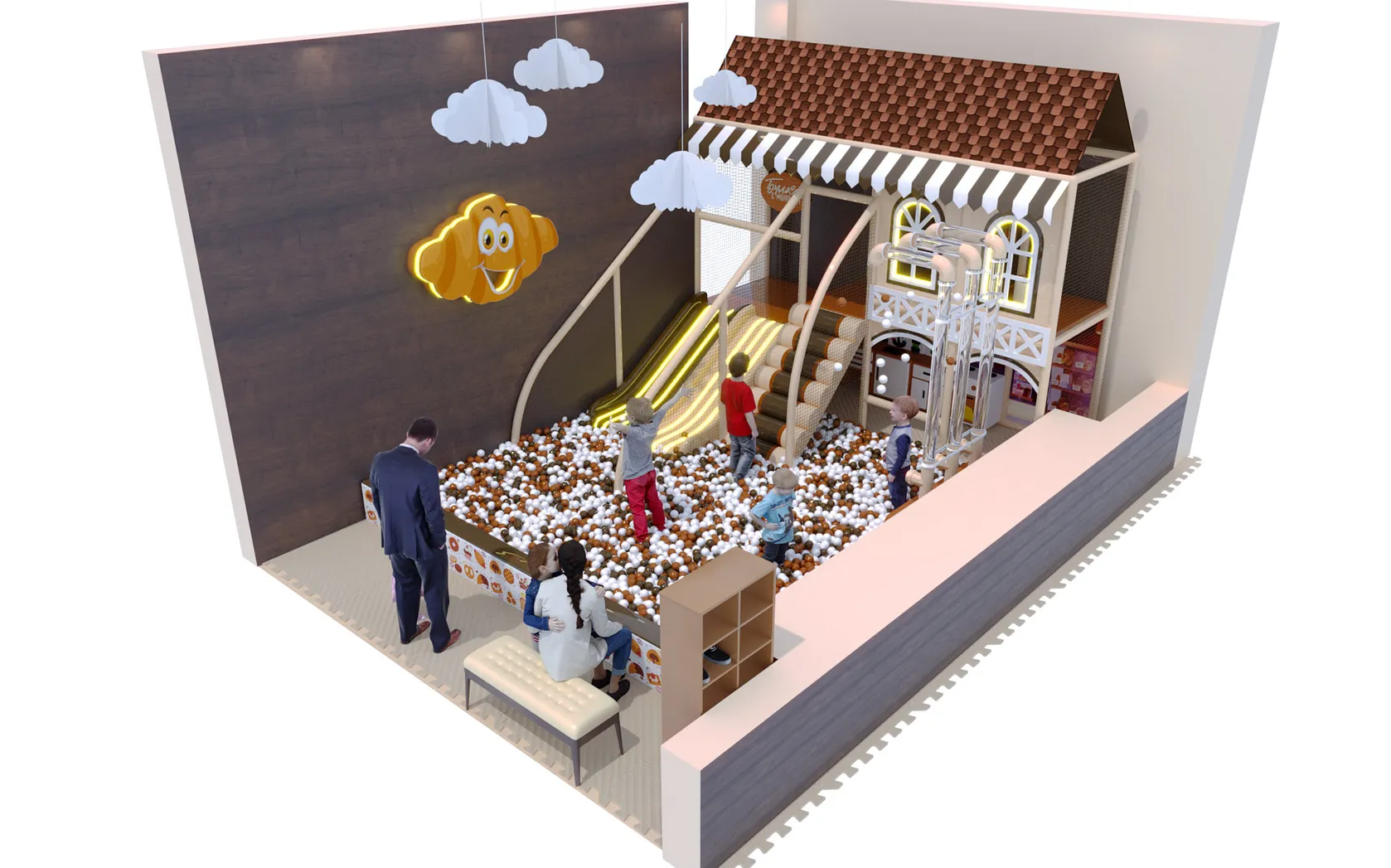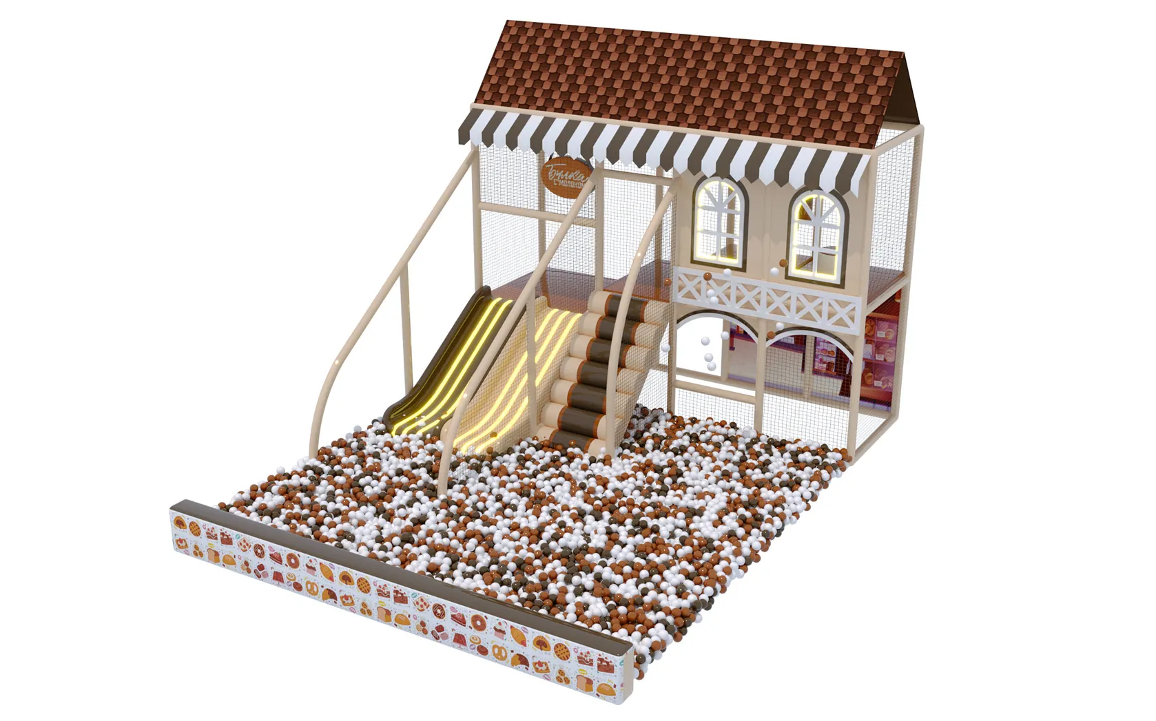 Детский игровой лабиринт для кафе «Пряничный домик» — это атмосферное игровое пространство в виде уютного сказочного домика с двускатной крышей, создающее эффект настоящей игровой сказки для детей: внутри предусмотрены многоуровневые площадки, безопасные переходы, мягкие препятствия, вертикальные элементы для лазания и горки с плавным выкатом в просторный сухой бассейн с шариками, а световые акценты и декоративные окна усиливают ощущение уюта и «домашнего» тепла, благодаря чему лабиринт отлично вписывается в семейные кафе и кондитерские, надолго увлекает детей в активную игру и позволяет родителям спокойно отдыхать за столиком.