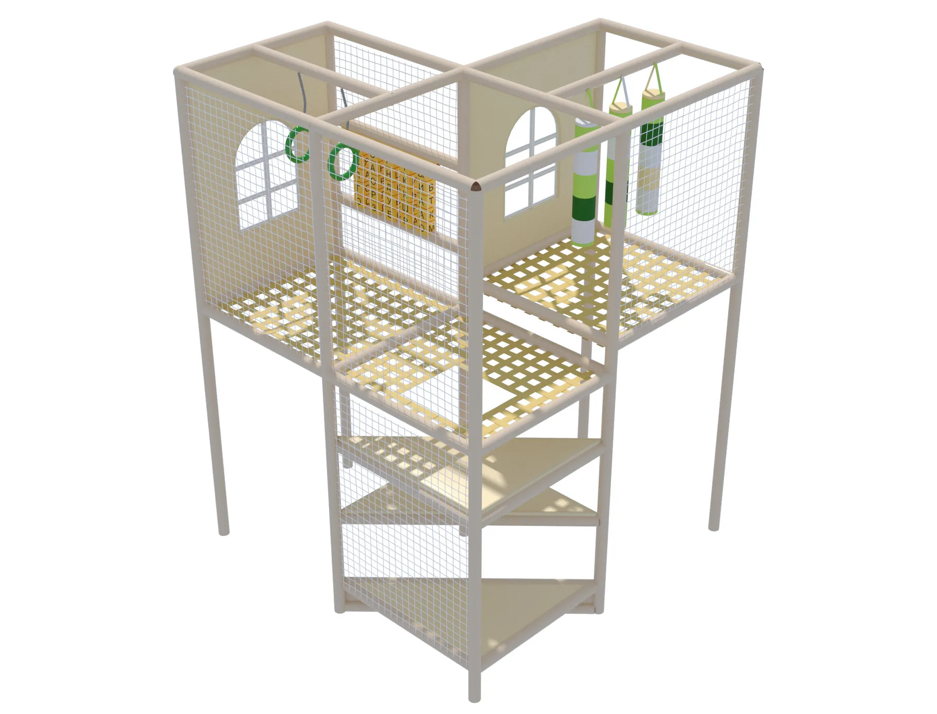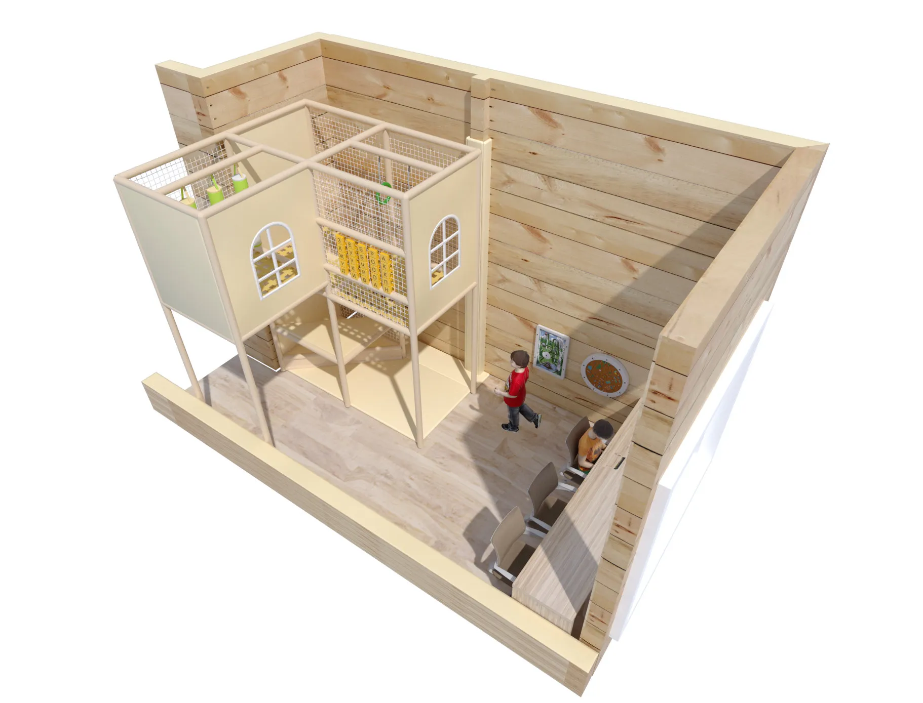 Конструкция выполнена в светлой, нейтральной цветовой гамме с мягкими акцентами, благодаря чему лабиринт легко вписывается в интерьер с натуральными материалами, деревом и спокойными оттенками. Архитектура напоминает уютный домик с окнами и внутренними комнатами, что делает пространство понятным и привлекательным даже для самых маленьких гостей.