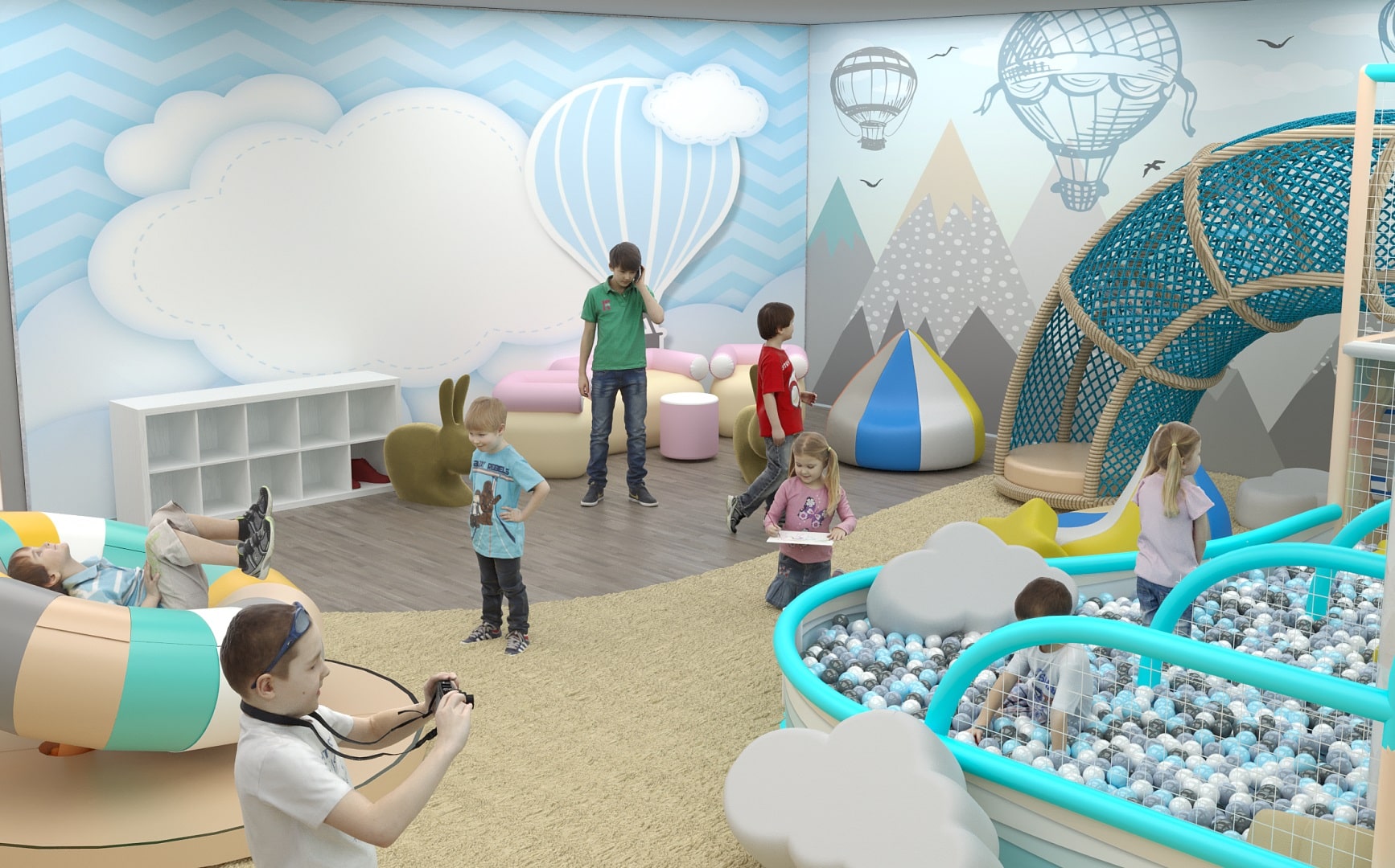 Игровая комната «Голубая пастель» включает в себя весь необходимый набор оборудования, чтобы удержать внимание дошкольников.