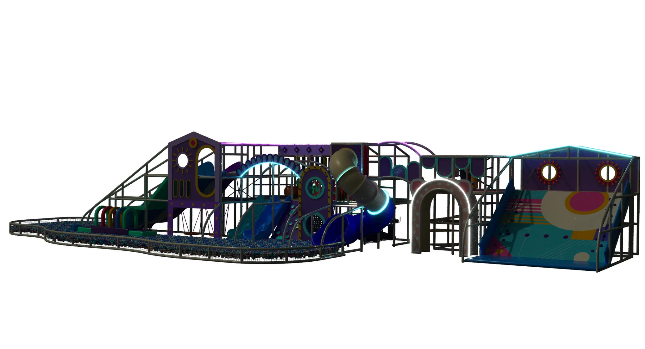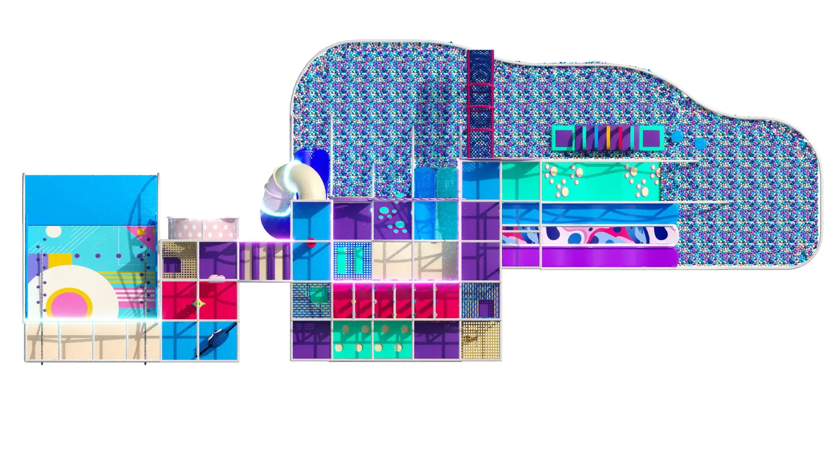 Продуманные игровые элементы — от неоновых арок до мягких модулей и воздушных пушек — делают пространство не только безопасным, но и по-настоящему живым. Каждая деталь вдохновляет на игру, исследование и смех.
