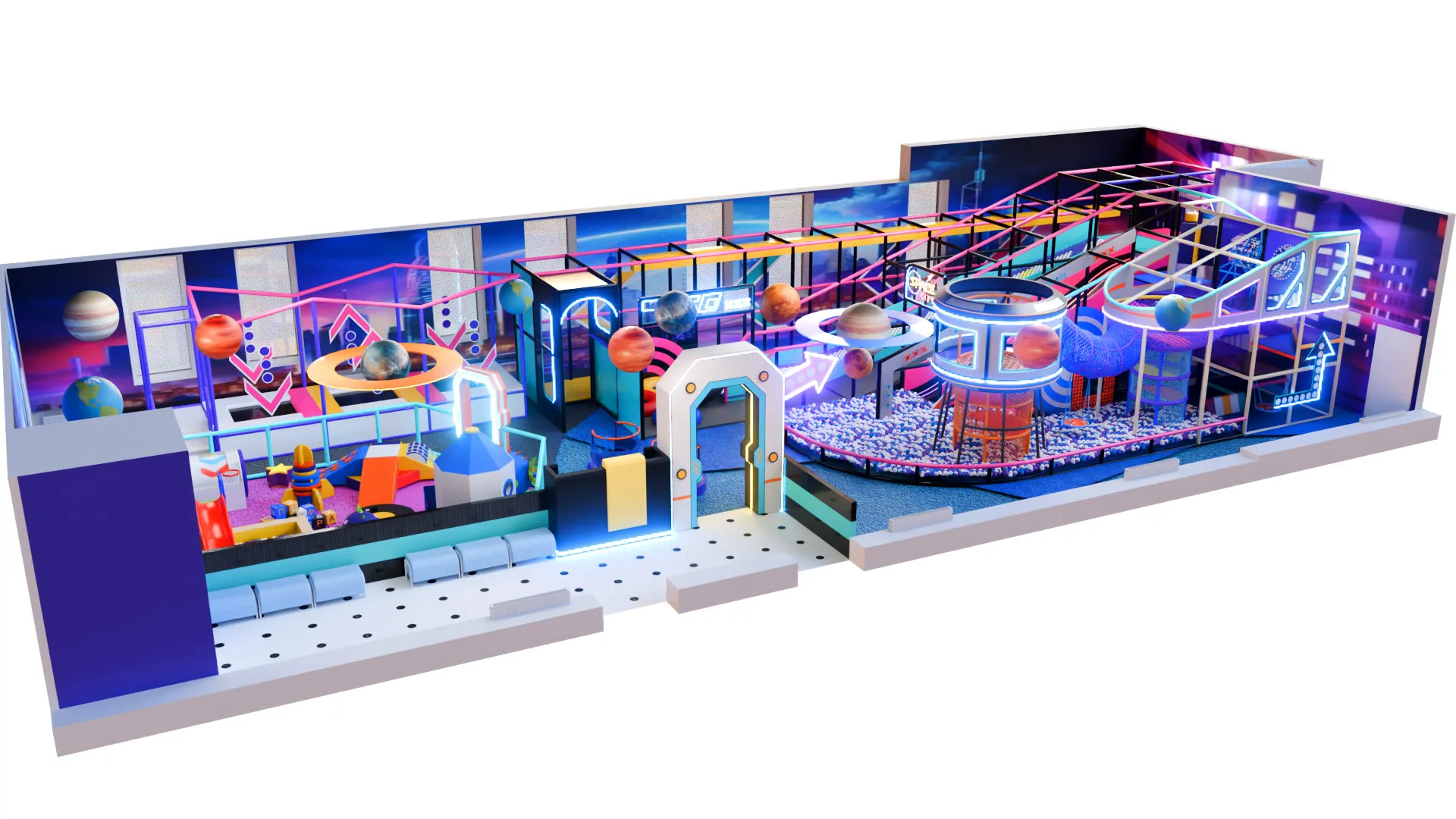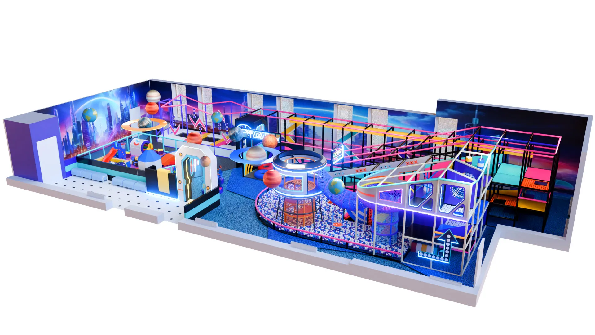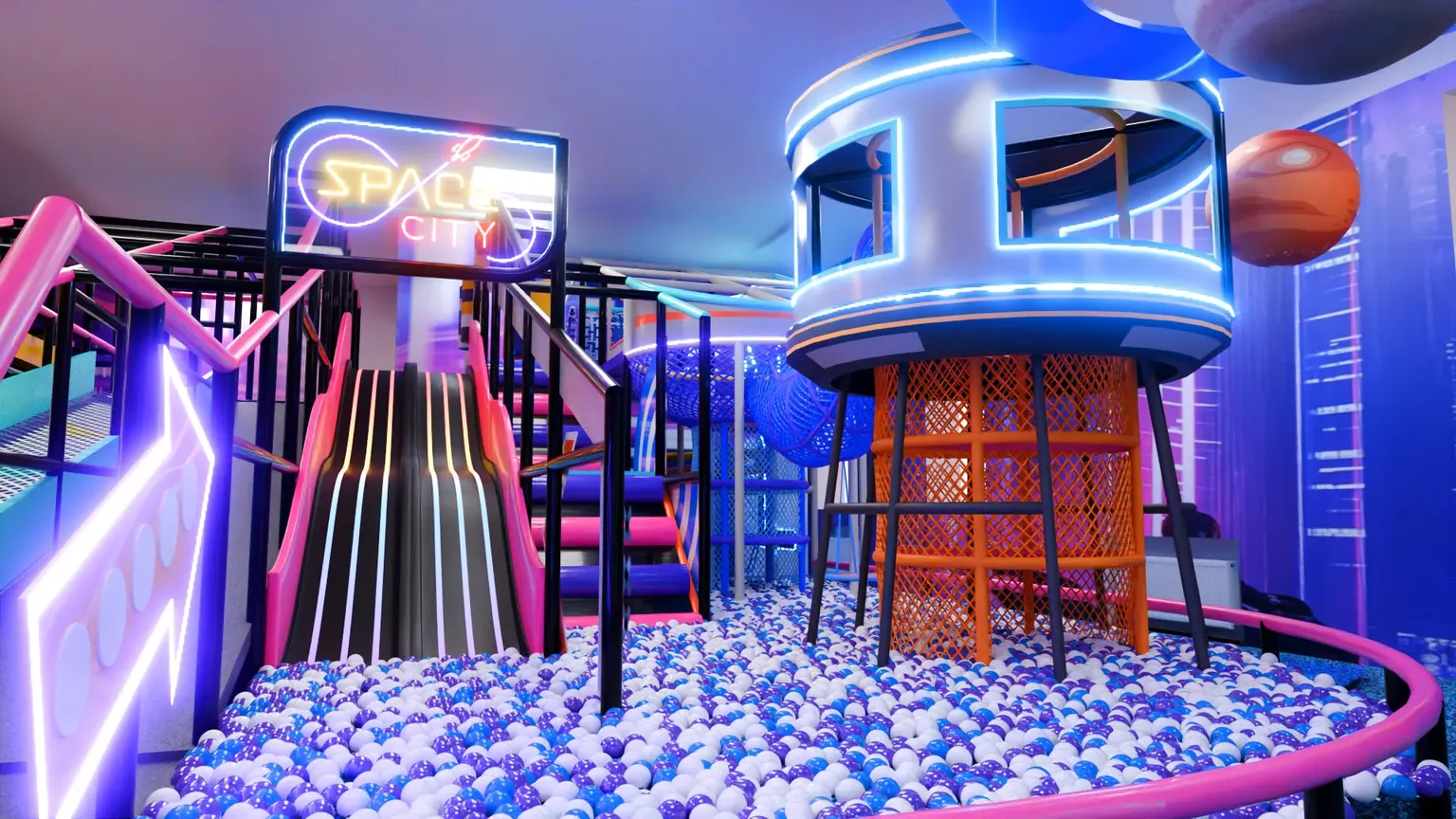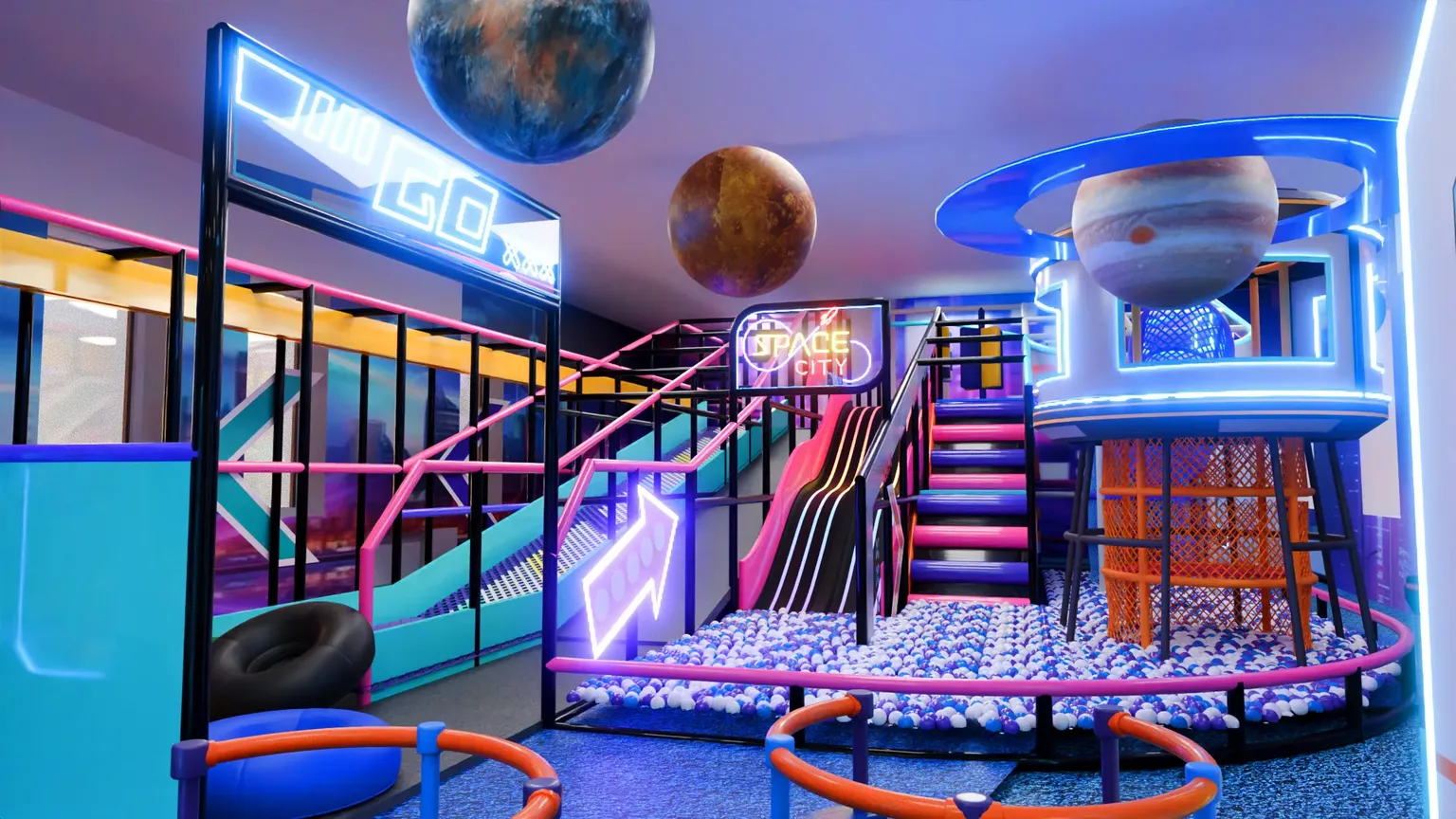 Детский игровой лабиринт «Star Rush» — это космическое пространство с яркой неоновой атмосферой и современным дизайном. Здесь всё напоминает о скорости, свете и приключениях: яркая подсветка, динамичные линии и игровые элементы, будто из футуристического мегаполиса.