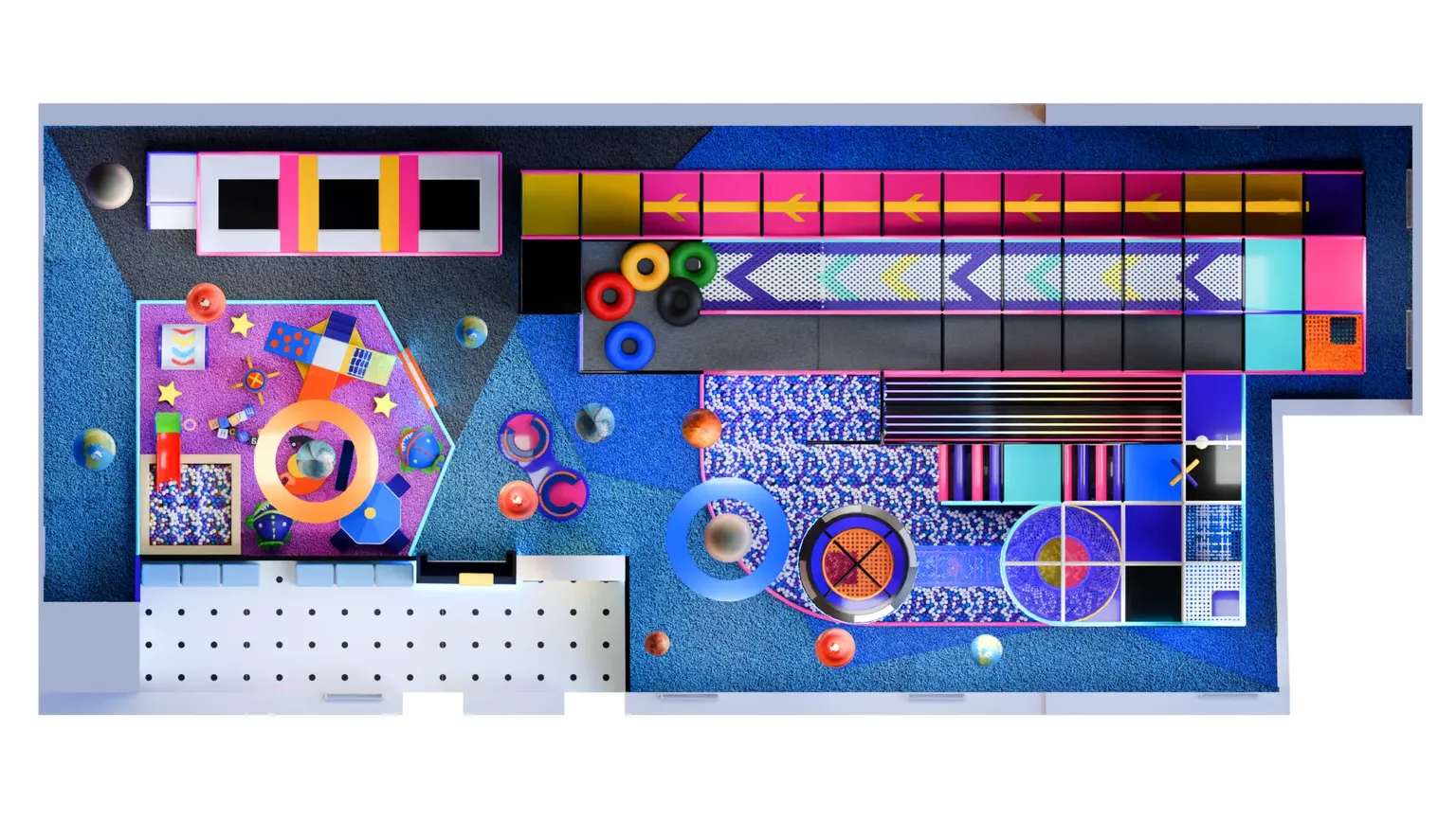 Большие горки, тюбинговая трасса, сетчатые подъёмы и мягкие препятствия создают сценарии для активных игр и соревнований. Мягкие модули, паутинки и воздушные пушки добавляют веселья и безопасного азарта.