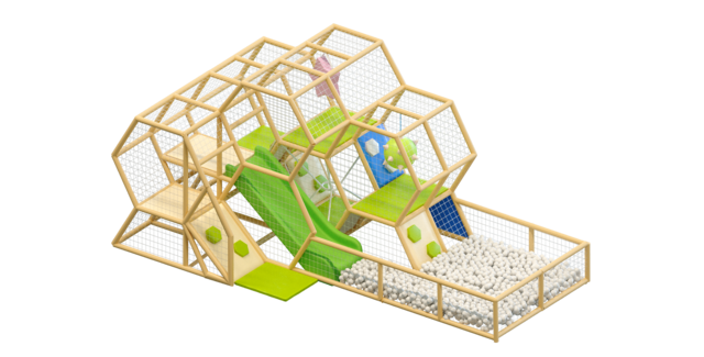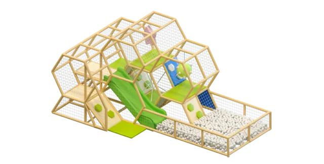 Игровой лабиринт «Колючка» выполнен в светлых и зелёных оттенках, создавая атмосферу природы и активности. Конструкция сочетает безопасные игровые элементы с интересными испытаниями, поэтому отлично подходит для размещения в торговых центрах, семейных кафе или детских клубах.