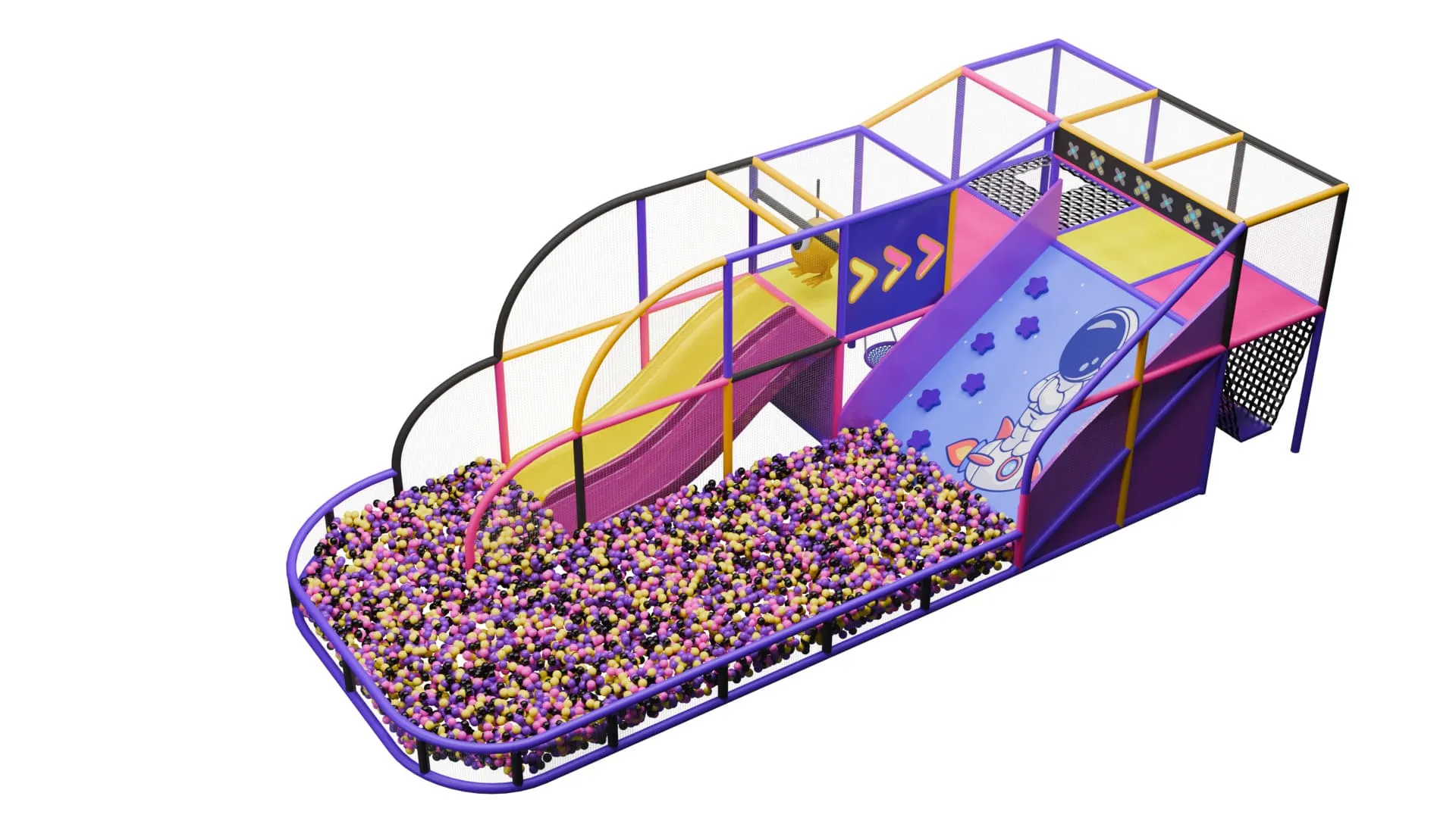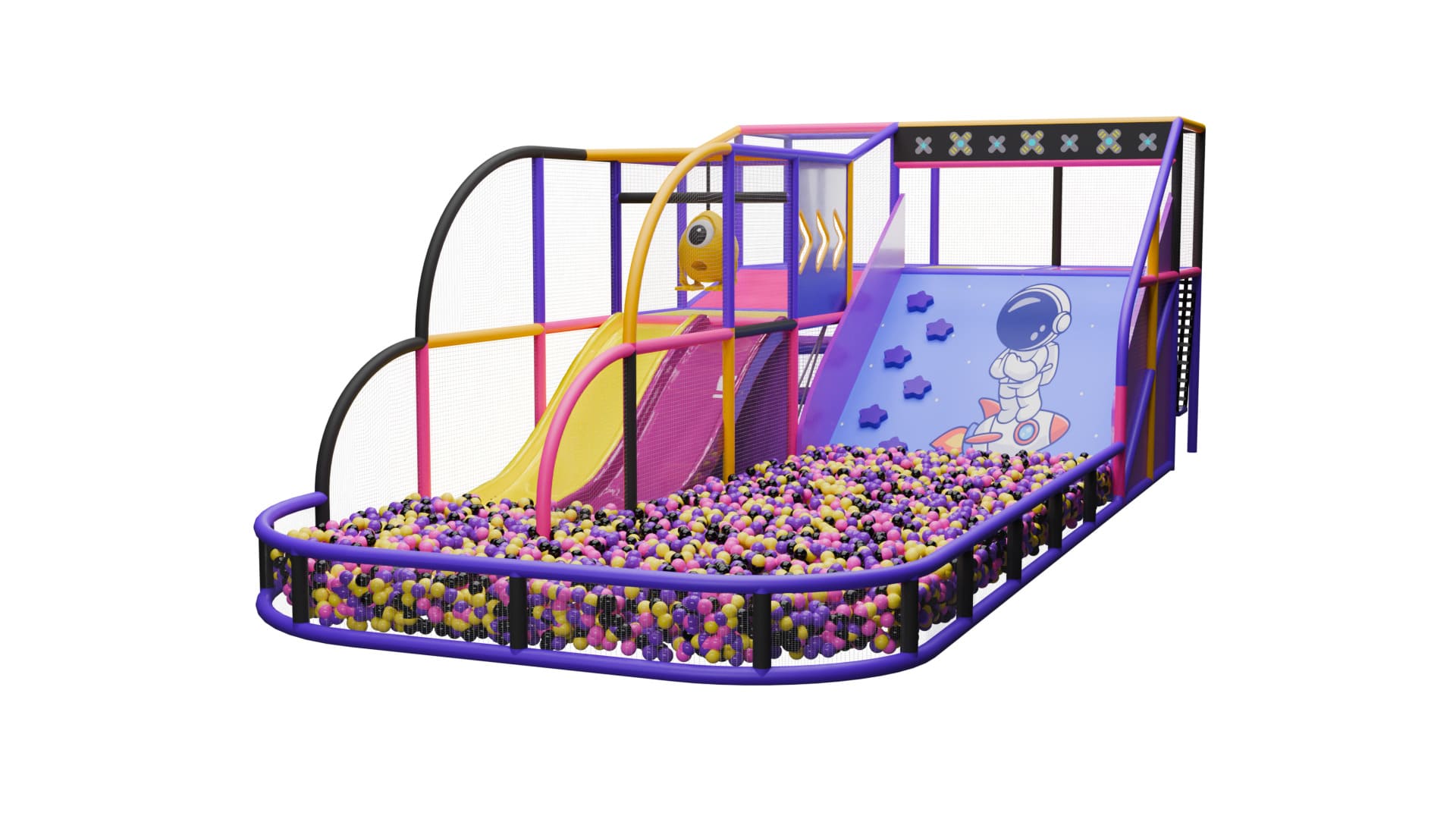 В комплексе есть альпийский подъём с фигурками, груша «Сердечко» и фанерный скат, ведущий прямо в сухой бассейн с разноцветными шарами. Дополнением служит яркий баннер с тематикой монстриков, который создаёт атмосферу веселья и фантазии.