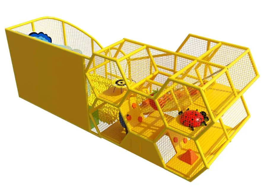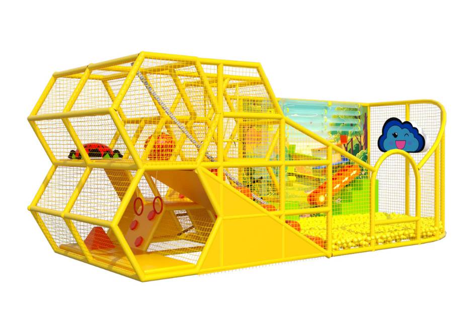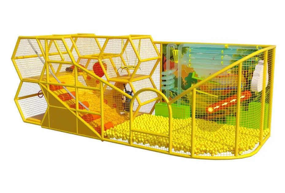 Игровой лабиринт «Пчелкин Дом» выполнен в яркой жёлтой палитре и стилизован под пчелиные соты. В комплексе есть альпийский подъём, фанерный скат с УФ-печатью, гимнастические кольца и сухой бассейн с шарами.