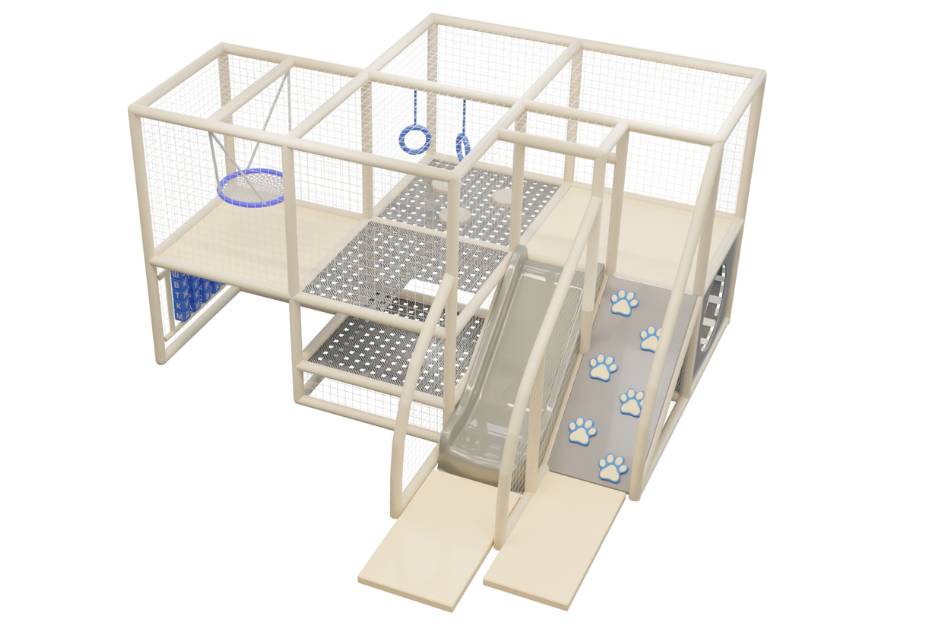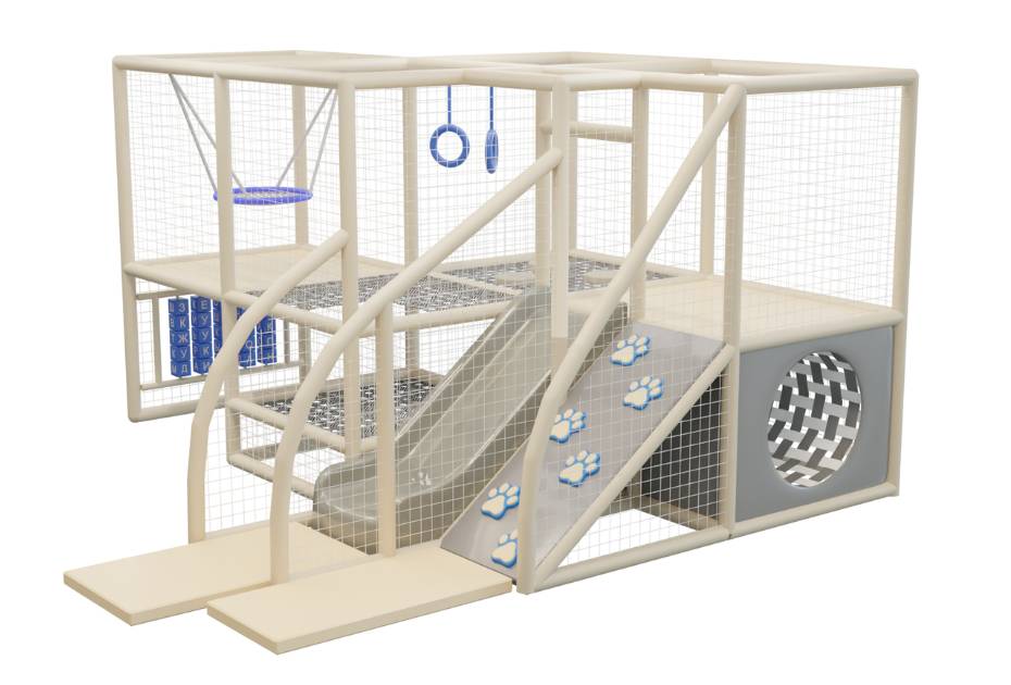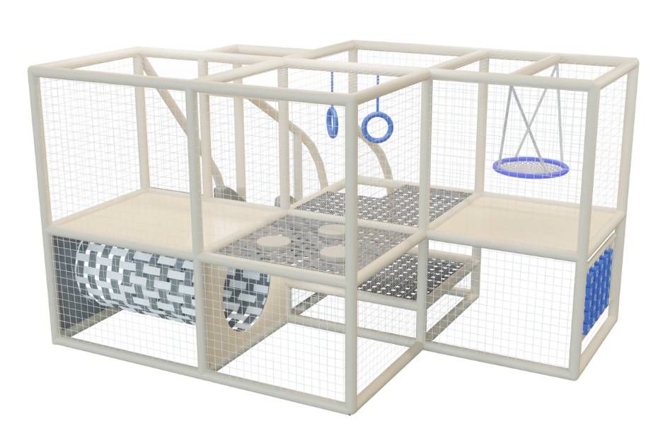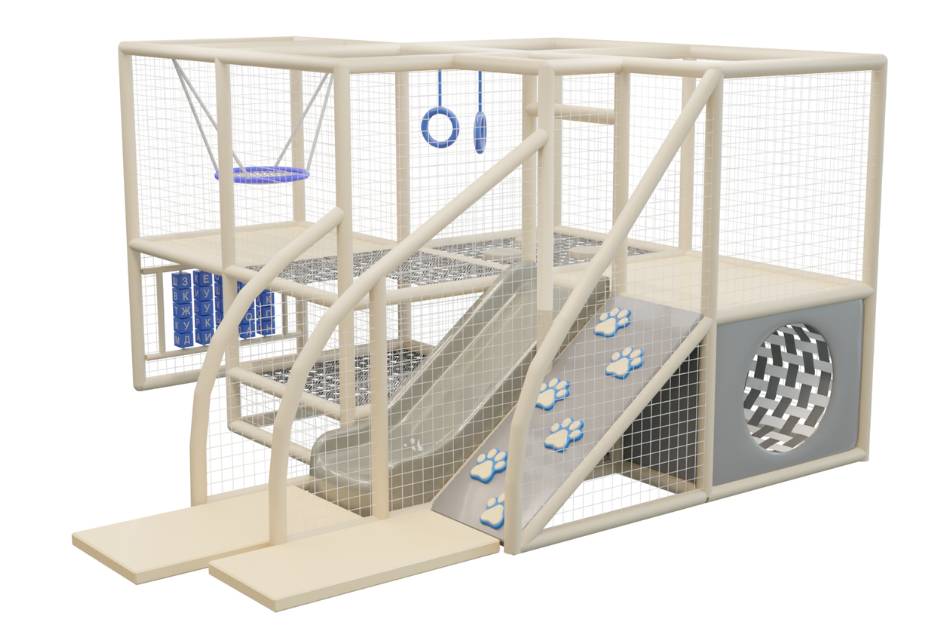 Игровой лабиринт «Следуй за котом» выполнен в спокойных нейтральных тонах и подойдёт для любого интерьера. Комплекс оснащён альпийским подъёмом с фигурками-лапками, качелями «Гнездо», гимнастическими кольцами и репсовым тоннелем.
