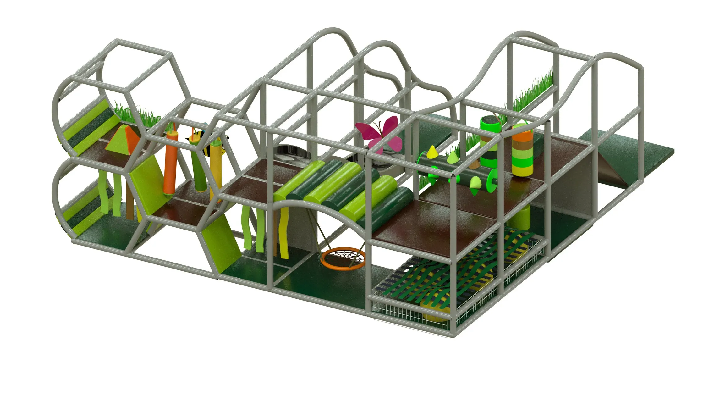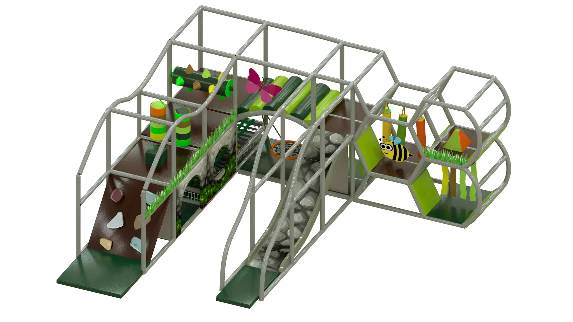Игровой лабиринт «BeeLand» оформлен в эко-стиле с элементами природы и яркими деталями — зелёной травой, бабочками и пчёлами. Благодаря своим оттенкам и плавным линиям конструкция выглядит уютно и естественно.