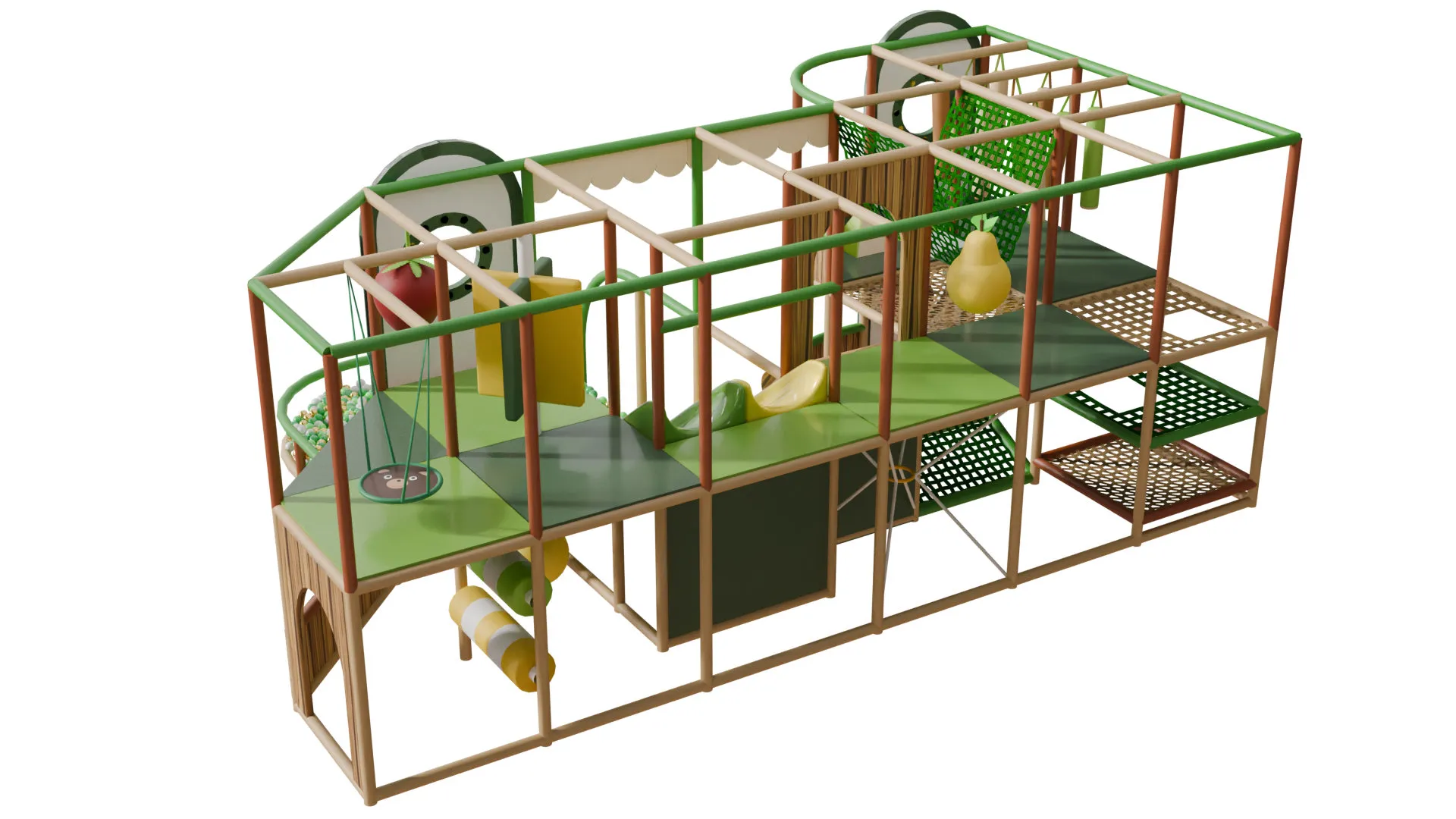 Игровой лабиринт «Лесные Горки» выполнен в природной зелёной гамме и оформлен с элементами лесной тематики. Яркие декоративные щиты и подвесные модули в виде фруктов создают атмосферу прогулки по саду, где каждый уголок наполнен играми и открытиями.