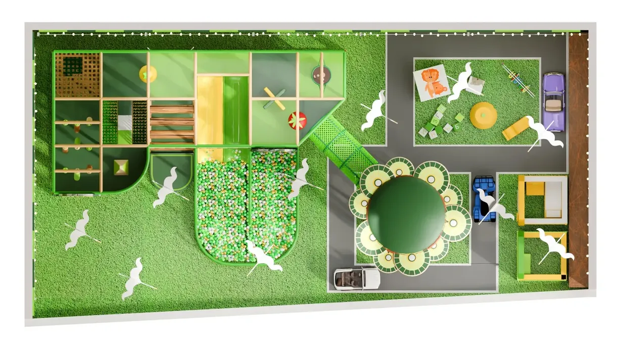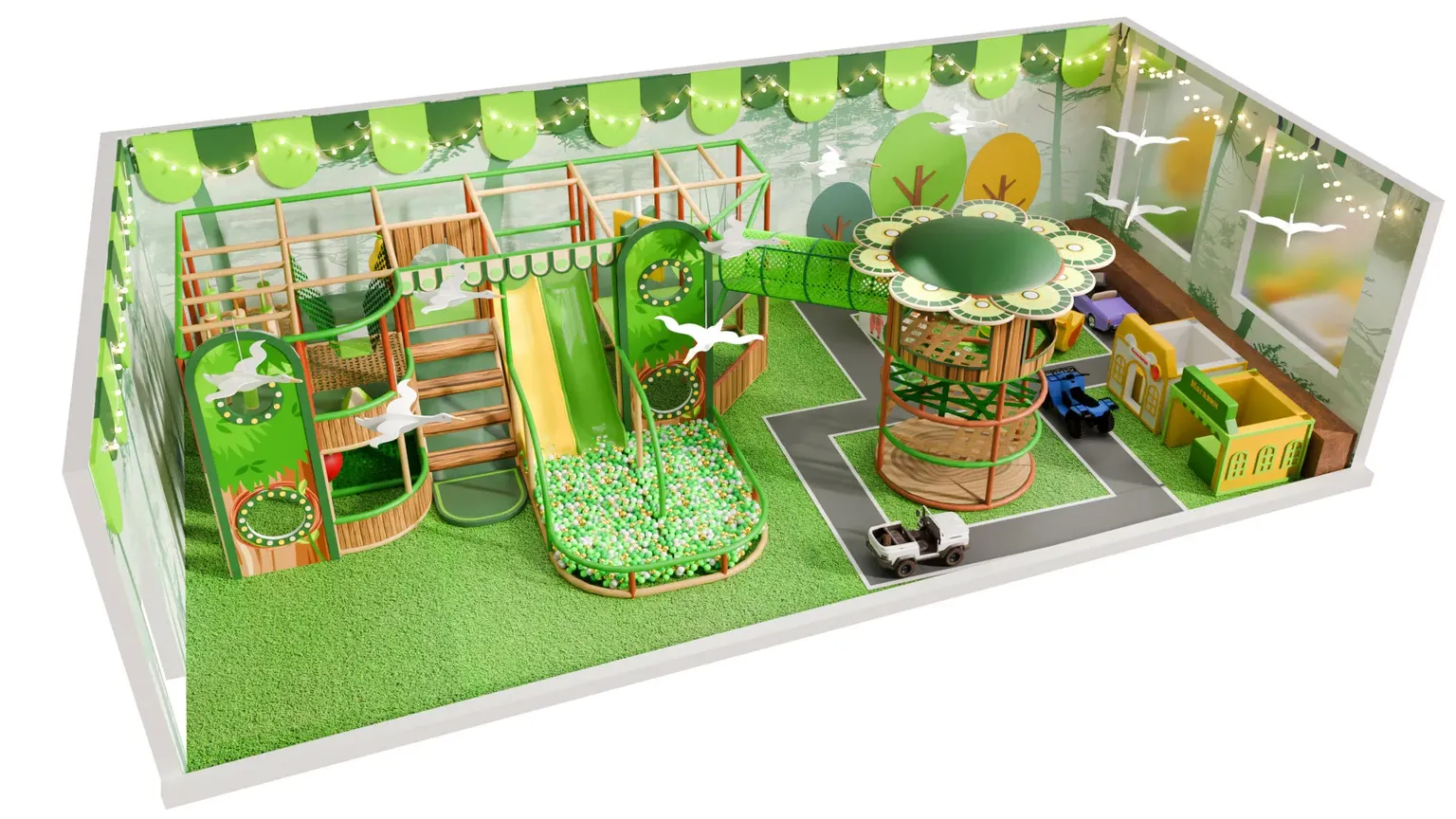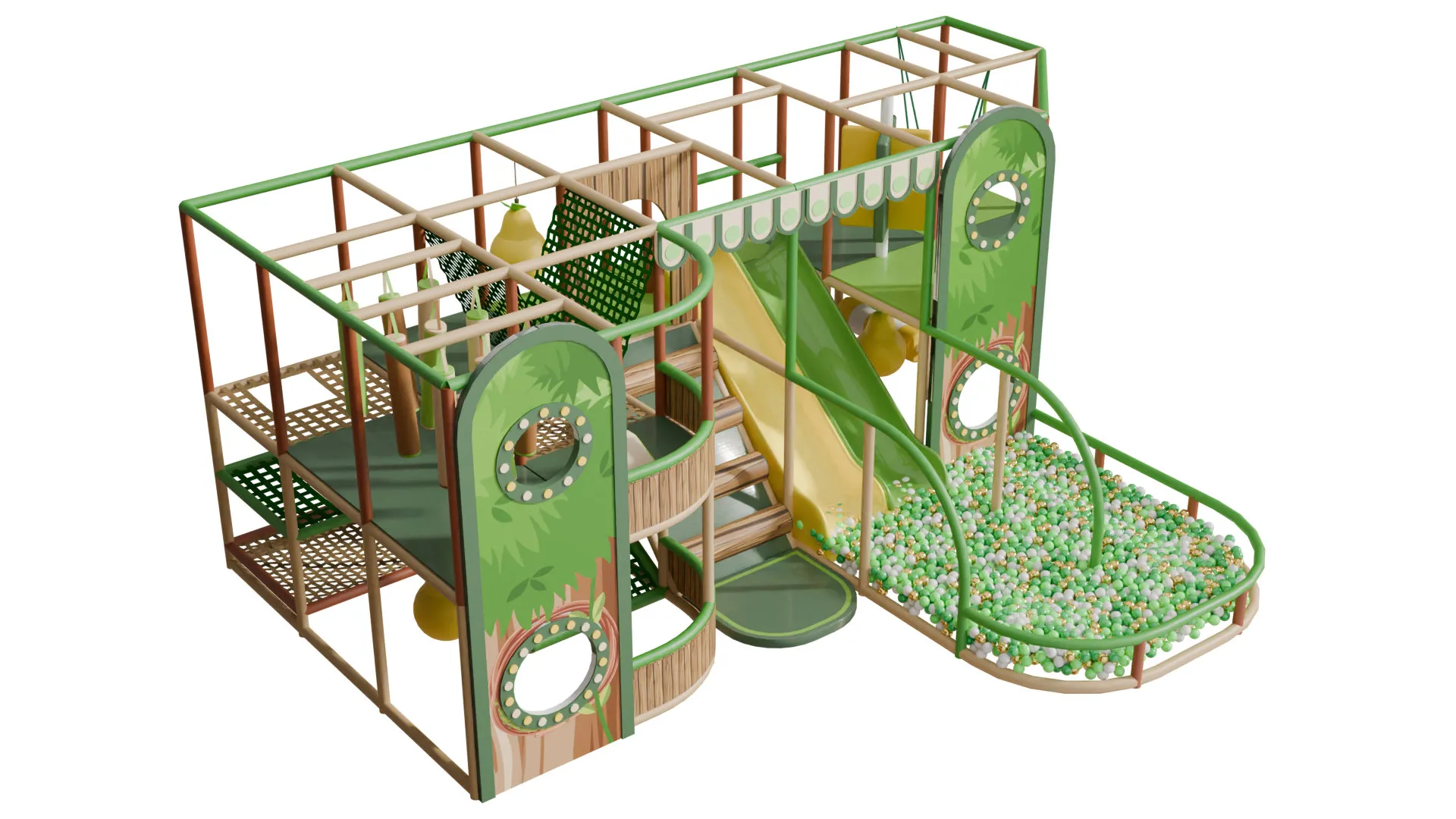 В центре комплекса расположены горки со спуском в сухой бассейн с шарами, а также мостики, подъёмы и сетчатые элементы, которые делают игру активной и увлекательной. «Лесные Горки» станут отличным решением для семейных парков, игровых комнат и ТРЦ, даря детям радость движения и атмосферу сказочного леса.