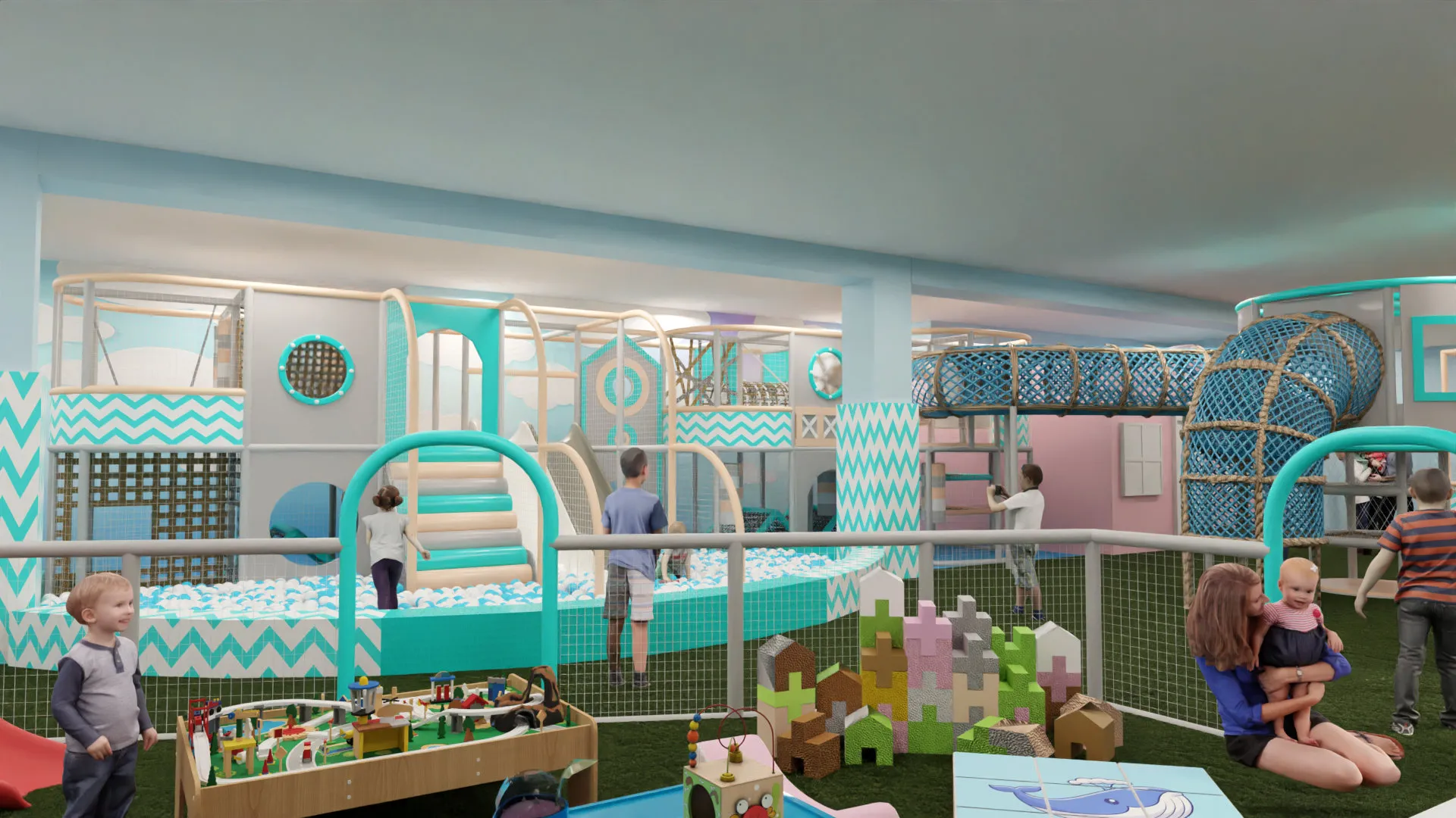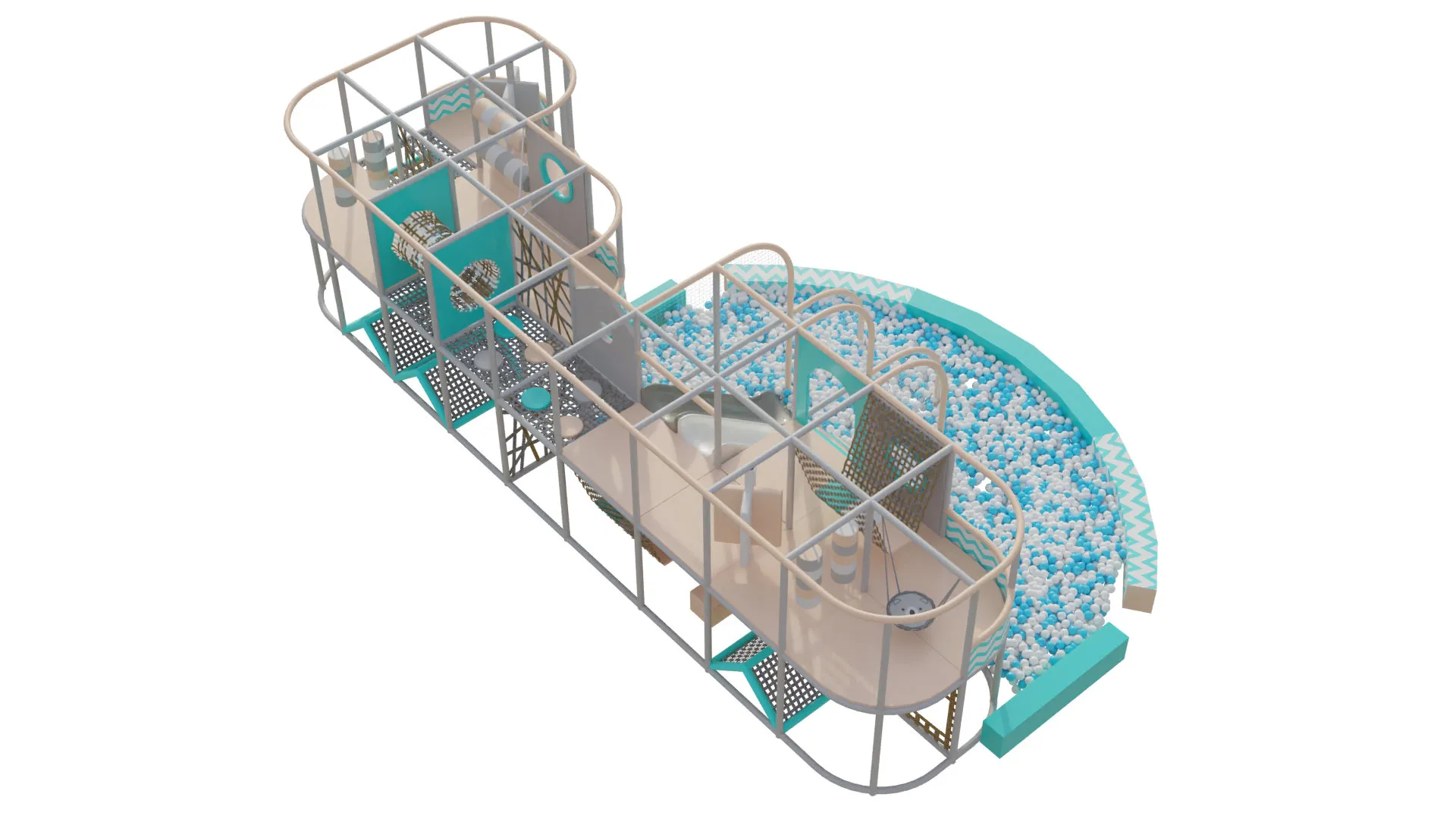 В комплексе есть просторные зоны для лазания, сетчатые переходы, качающиеся мостики и спуски, ведущие прямо в большой сухой бассейн с шарами. Яркая горка и разнообразные игровые зоны делают «Океаникс» универсальным решением для детских комнат, кафе и семейных центров, создавая безопасное и увлекательное пространство для активного отдыха.