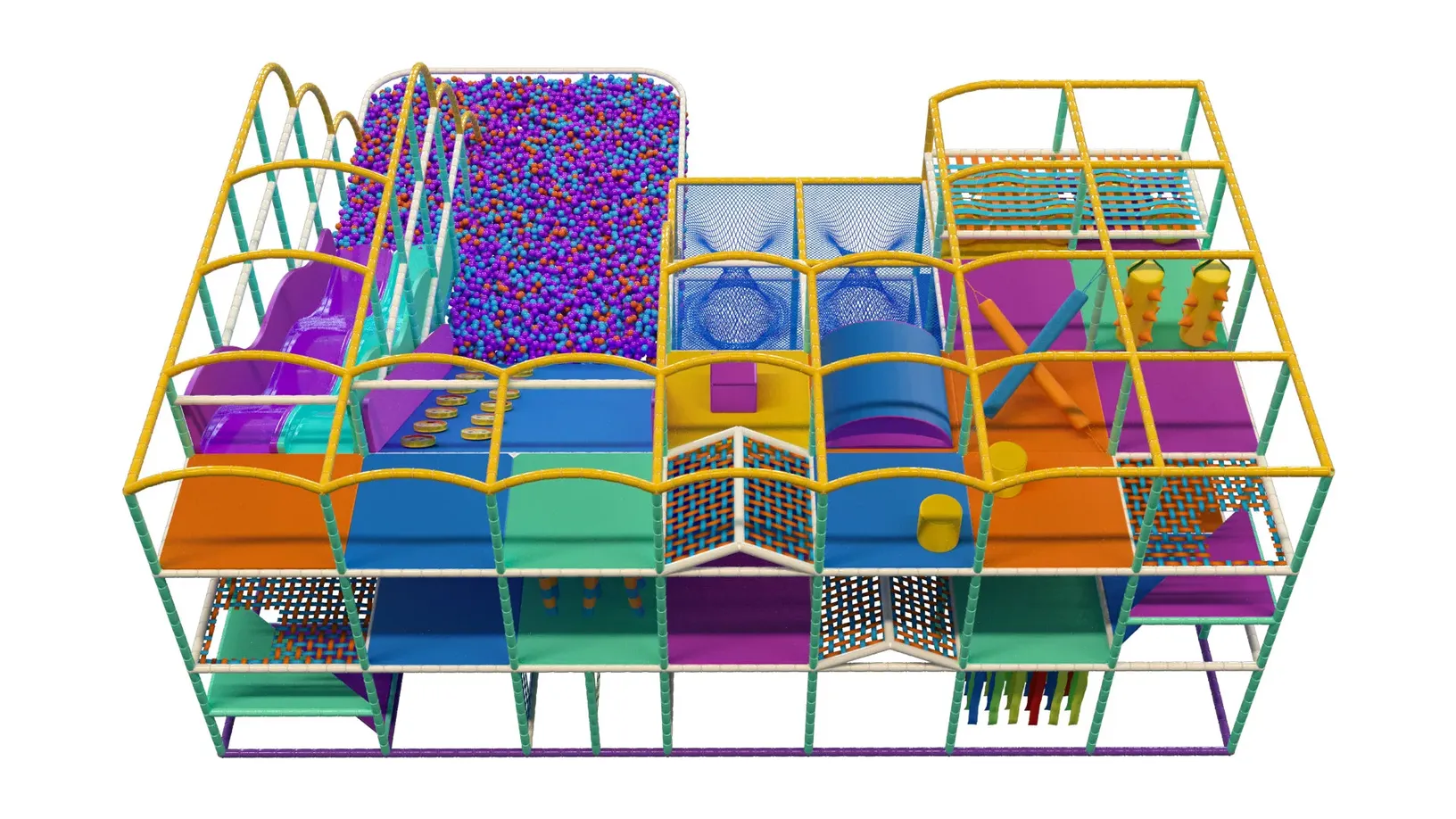 Игровой лабиринт «Хайпик» создан в яркой современном стиле и сразу привлекает внимание своей энергичной цветовой гаммой. Его дизайн сочетает насыщенные оттенки фиолетового, голубого и жёлтого, а декоративные элементы добавляют динамики и создают атмосферу настоящего приключения.Внутри детей ждут разнообразные зоны активности: косогор и горки, сетчатые переходы и тоннели, паутинка и ленточный лабиринт, а также сухой бассейн с яркими шарами. «Хайпик» отлично подойдёт для ТРЦ, игровых комнат и семейных парков, даря детям энергию, движение и множество ярких эмоций.