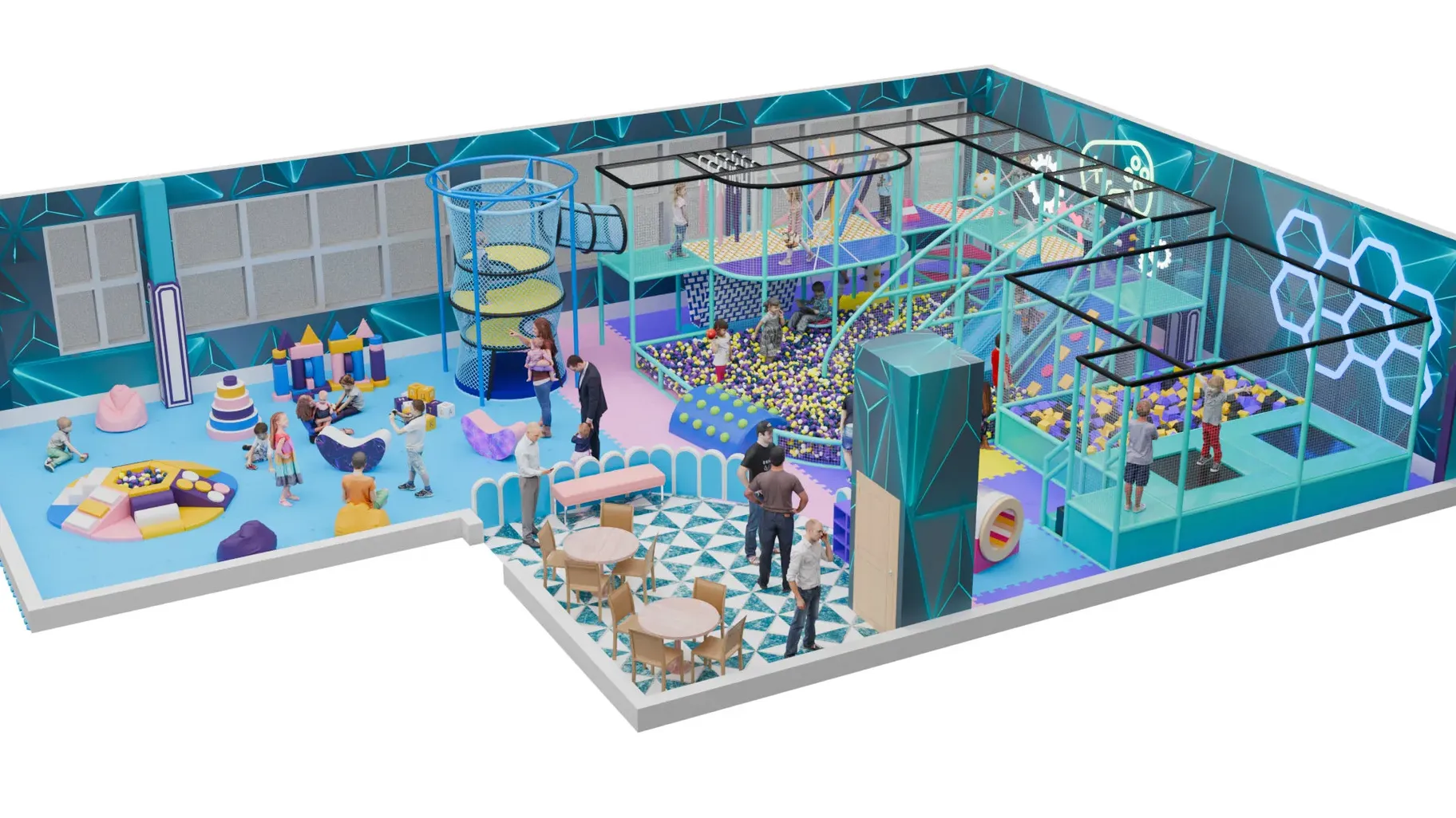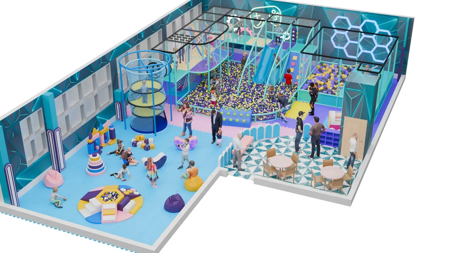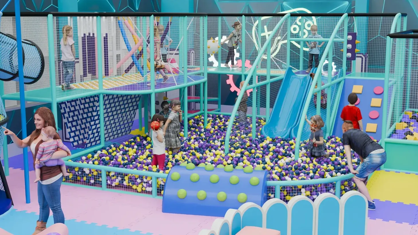 Детский игровой лабиринт «Леденцовая Планета» в мягких карамельных тонах создан, чтобы каждая игра превращалась в приключение. Здесь дети могут покорять альпийские подъёмы, скатываться с гладких горок и нырять в огромное «море» из разноцветных шариков.