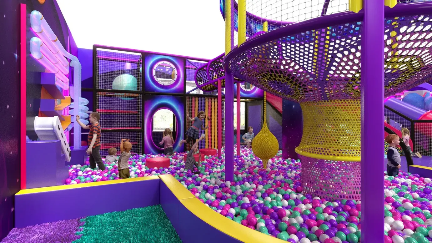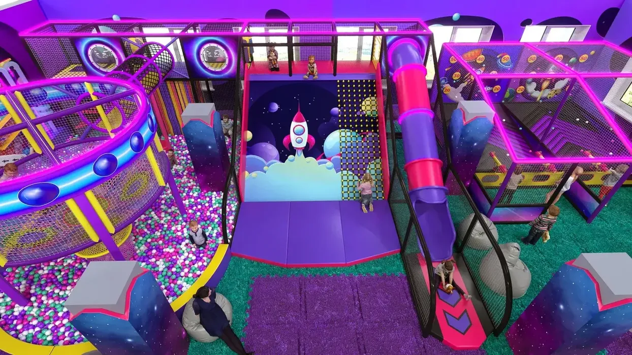 Внутри комплекса расположены ленточный лабиринт, косогор, пневмолабиринт, мягкие игровые модули и элемент «Гнездо». Дети могут пройти по сетчатым матам, подняться на горку и скатиться по трубам или стеклопластиковым горкам прямо в сухой бассейн с шарами. «Ракета» станет центральным объектом любой игровой зоны или ТРЦ, создавая для детей яркое и захватывающее пространство.