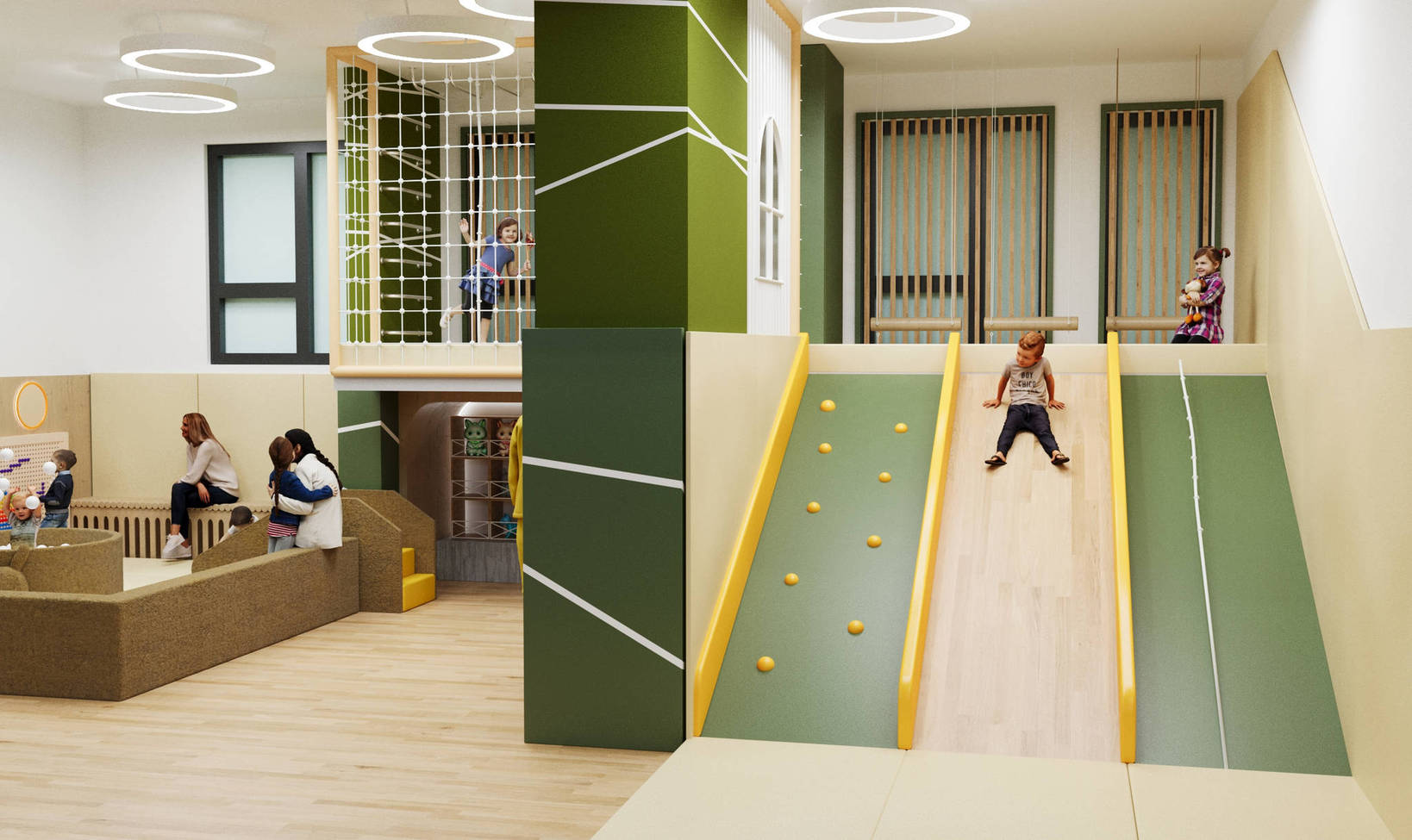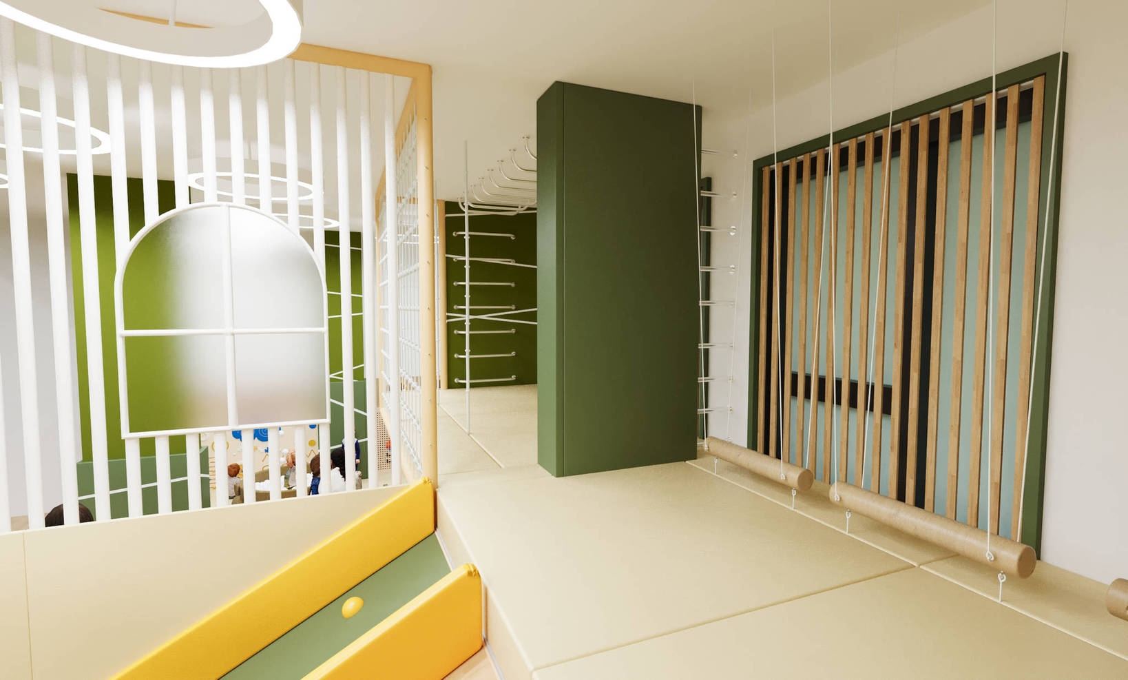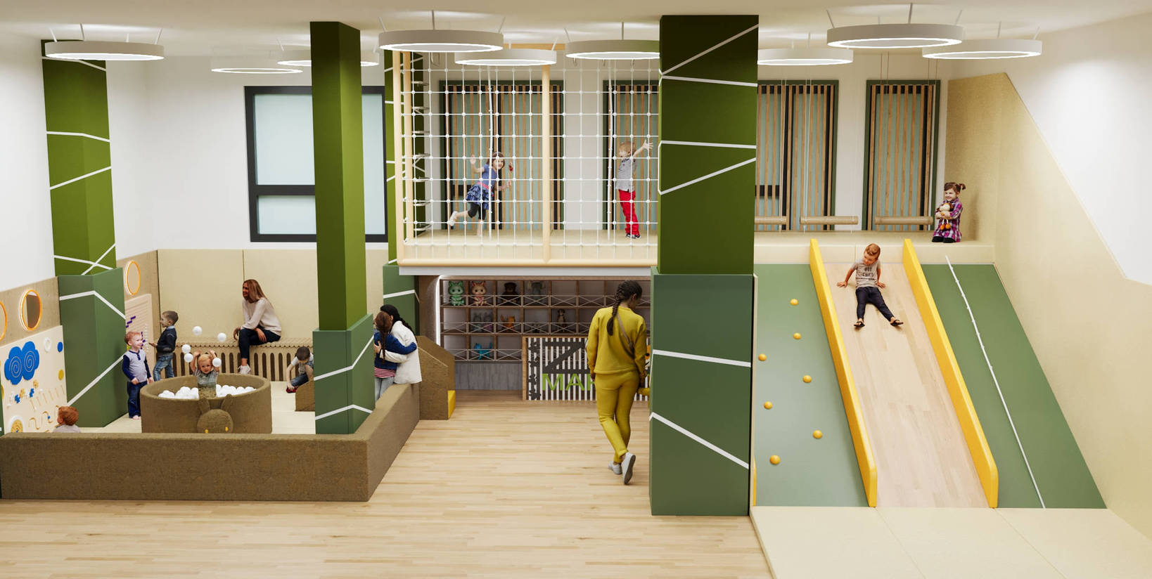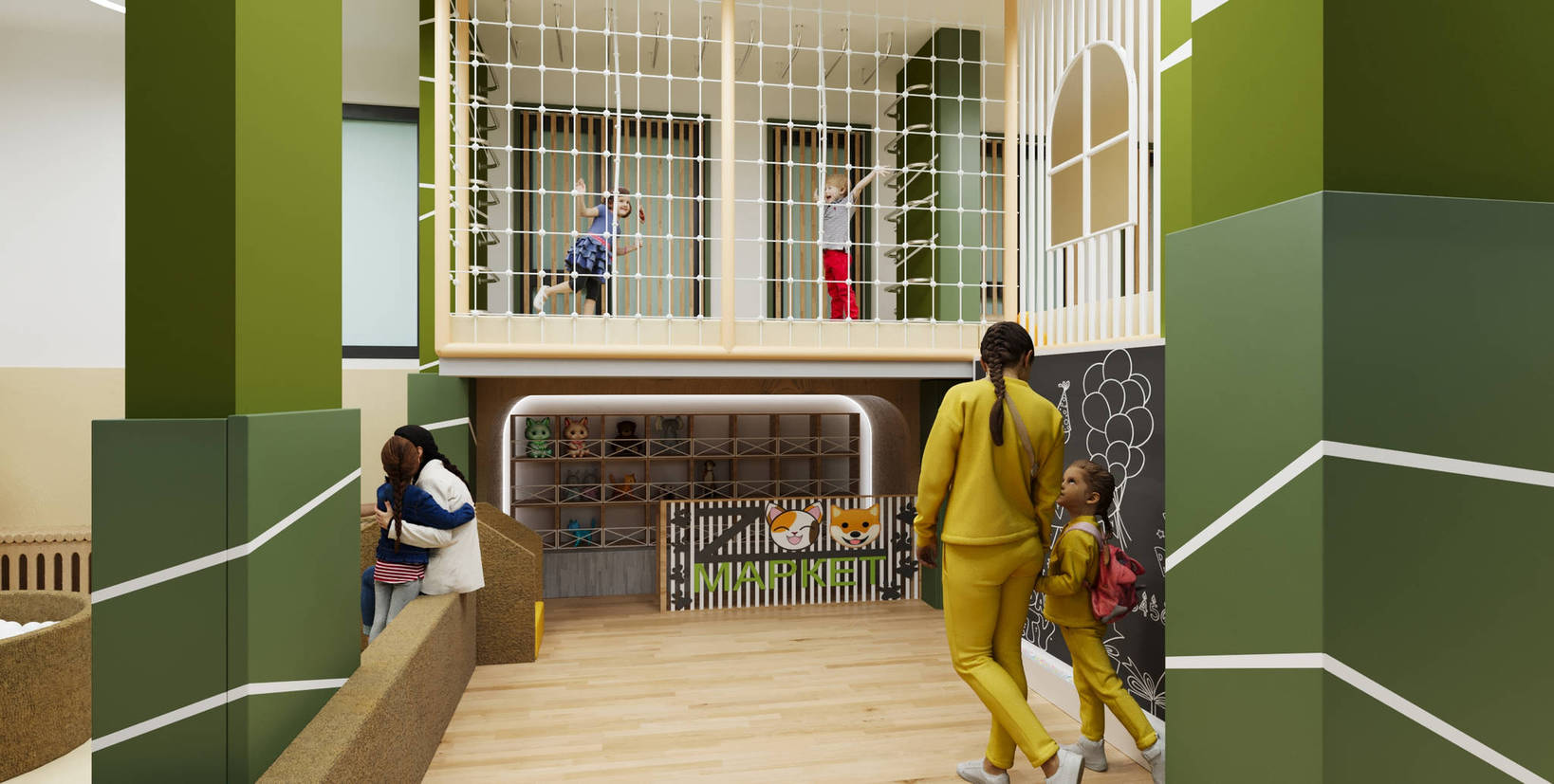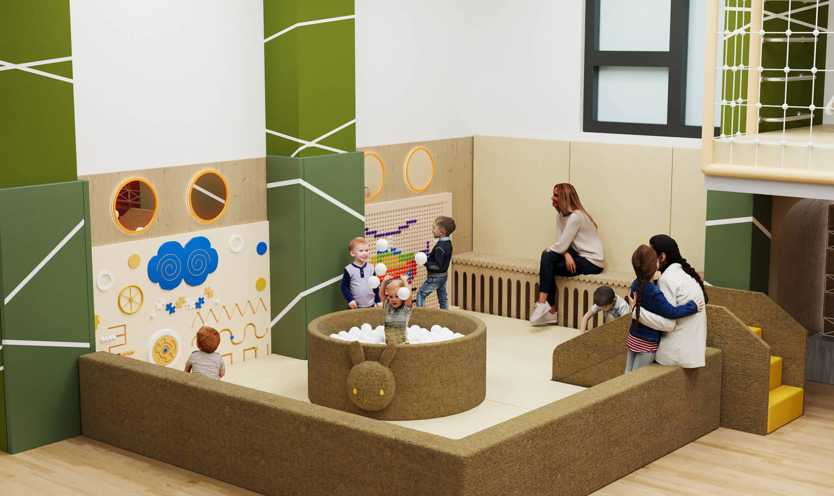 Детский игровой лабиринт для ЖК «Тропик» — современная и уютная игровая зона, вдохновлённая природными мотивами. Тёплые зелёные оттенки в сочетании с мягкими покрытиями создают атмосферу уюта и безопасности, а разнообразные игровые элементы побуждают детей к активным и творческим занятиям.