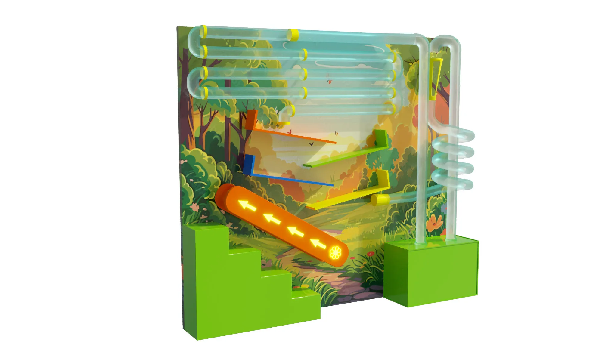 Ребёнок помещает шарик в стартовую трубу и, регулируя поток воздуха, наблюдает, как он проходит через повороты и спуски, пока не достигнет финиша. Игра развивает внимательность, координацию и причинно-следственное мышление, превращая процесс в мягкое и познавательное развлечение.