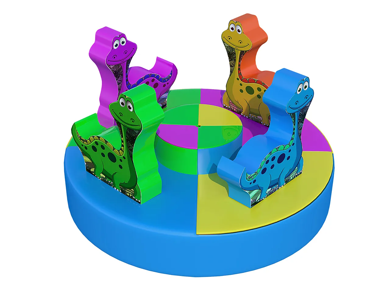 Небольшая карусель для игровых центров. На ней безопасно могут кружиться самые маленькие гости игровых комнат. Любимые многими детьми динозаврики выполнены в ярких цветах. На карусели малыши удобно рассаживаются и не быстро кружатся благодаря усилиям взрослого. При желании можно установить двигатель, тогда карусель будет вращаться сама, скорость вращения в этом случае тоже не высокая для безопасности гостей.