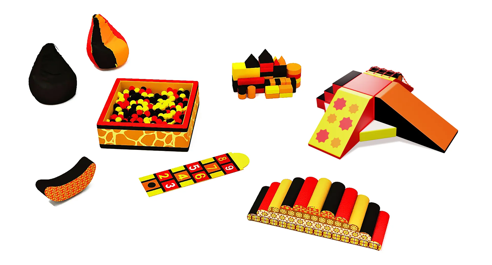 Игровая комната «Сафари» — это динамичный и колоритный набор мягких модулей, переносящий детей в атмосферу жаркой Африки. Дизайн комплекта выполнен в «хищной» черно-оранжево-желтой гамме с использованием анималистичных принтов (жираф, леопард), что делает игровую зону невероятно стильной и притягательной.