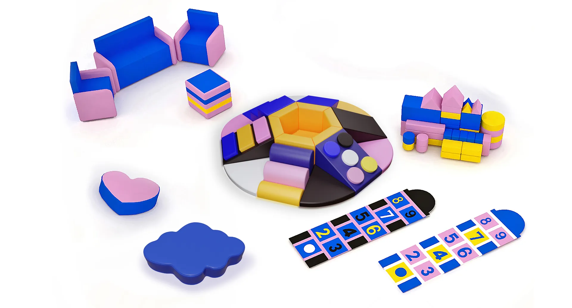 Комплект функционален и разнообразен: мягкая мебель позволяет организовать комфортную зону для общения, конструктор развивает пространственное мышление, а «Царь-горы» и классики обеспечивают необходимую физическую активность.